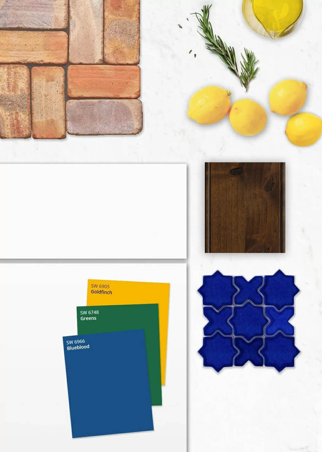 This mood board features Dura Supreme’s Chroma door style in White paint, Knotty Alder with Heirloom “K” finish, paint colors from Sherwin-Williams, brick by Todo Barro, and tile by Fireclay Tile.