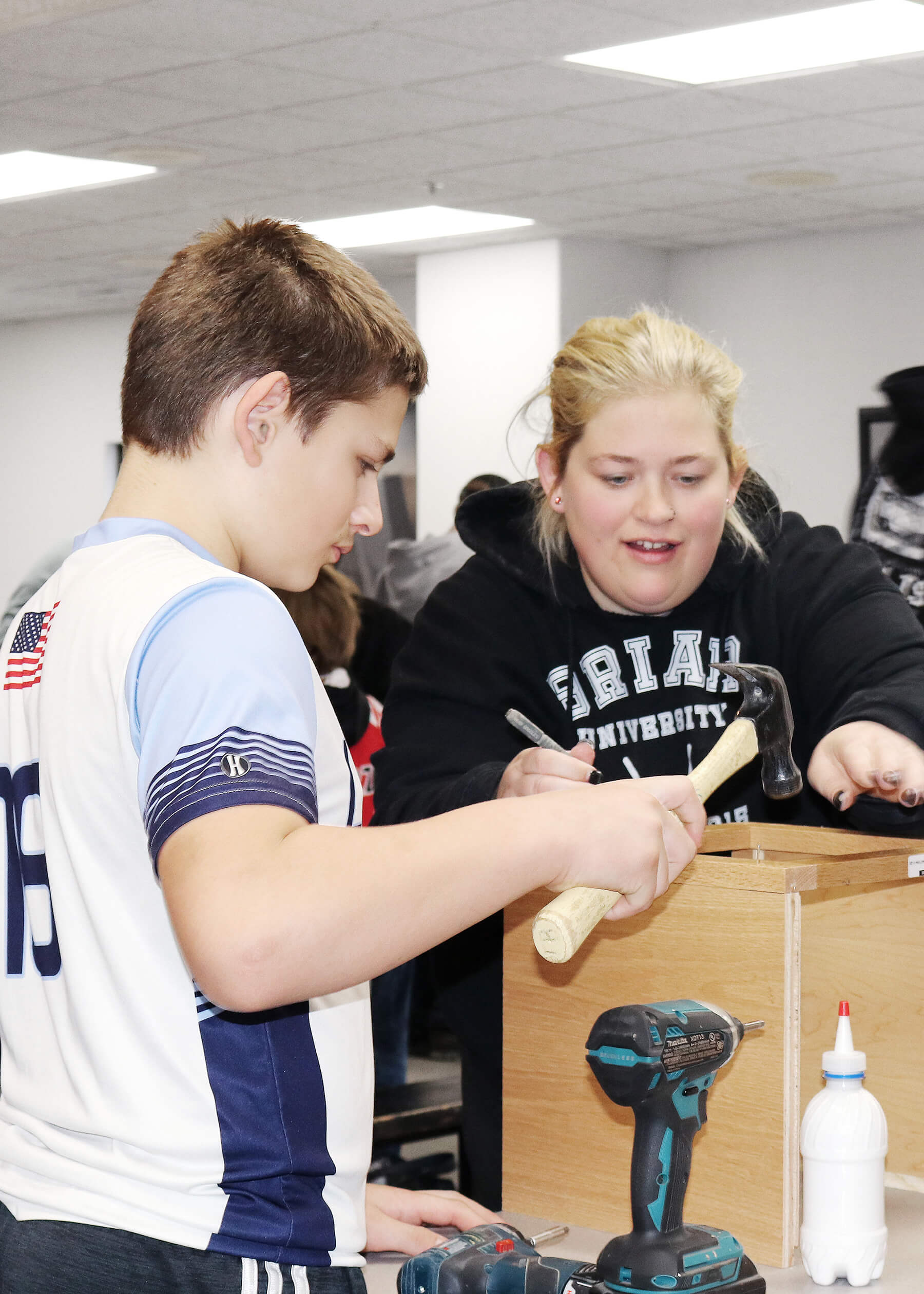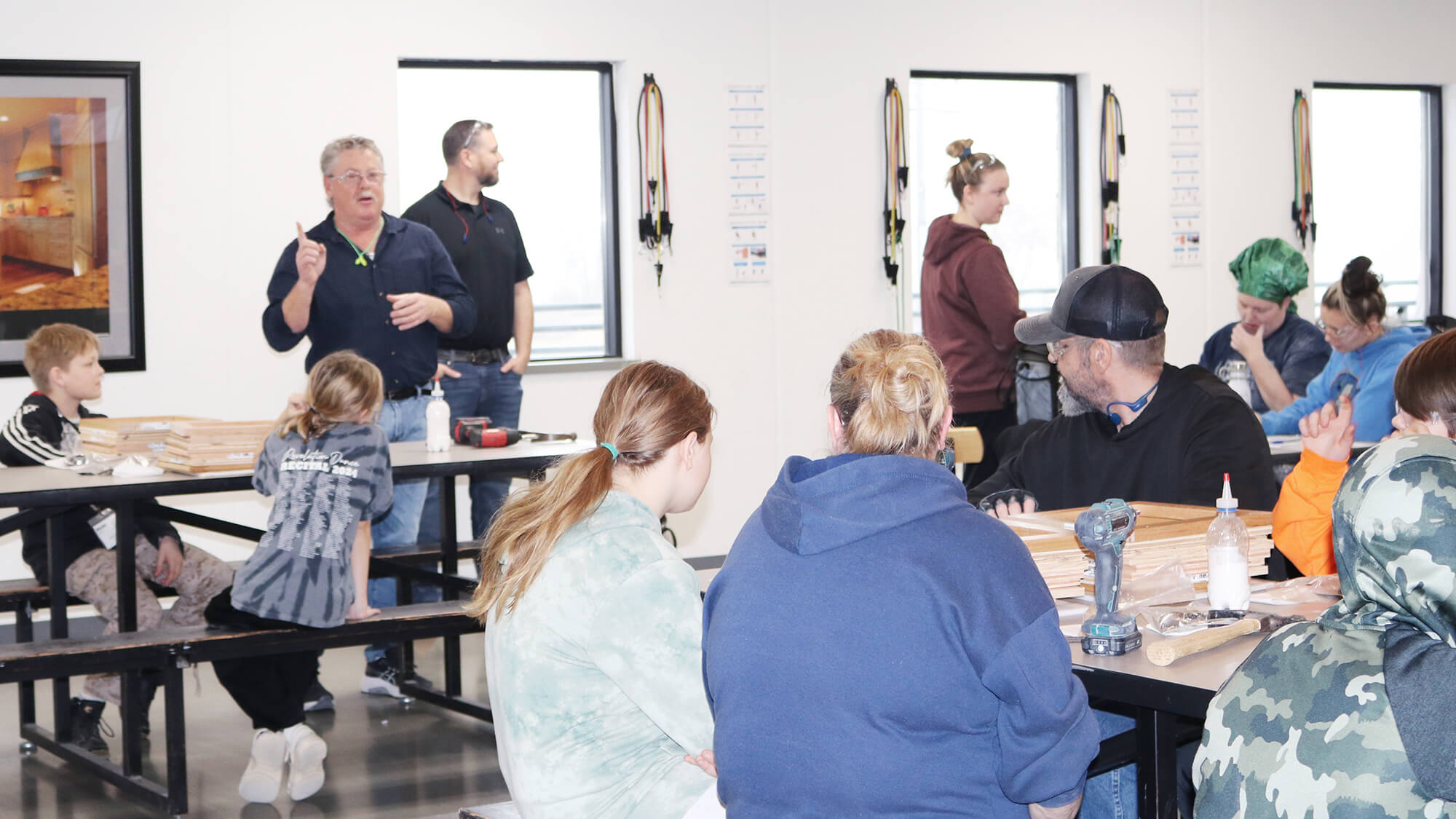 After the tour, the class meets in the lunch room for our Build-A-Cabinet project! With assistance from the managers and our volunteer supervisors as they get geared up with the proper safety equipment, our Environmental Health and Safety Manager, Tom Christensen, gives a presentation on safety and demonstrate the how to properly and responsibly use the tools they will need to make their cabinet. Then everyone dives into this fun hands-on activity.