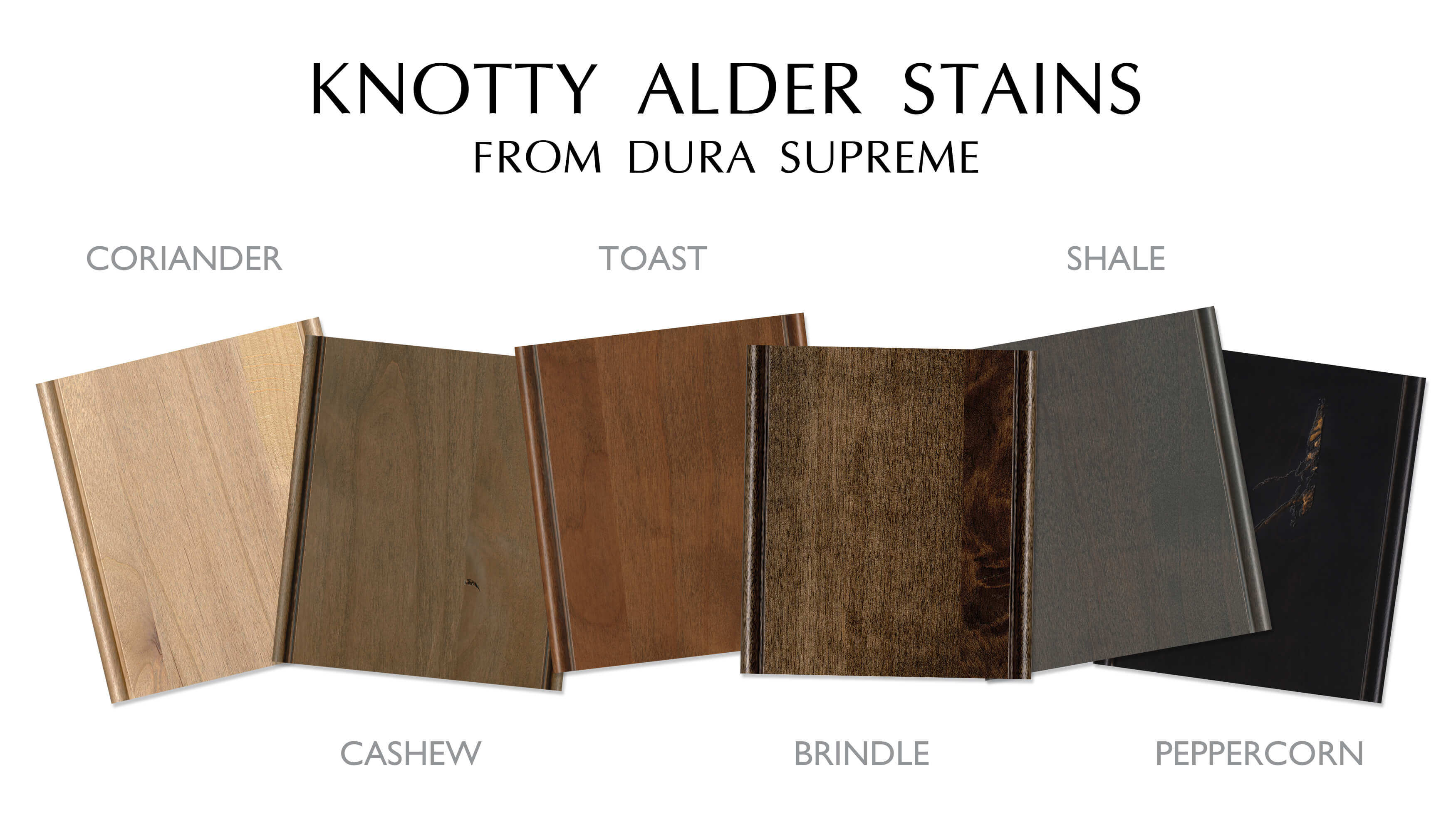 Knotty Alder is one of the rustic species we offer at Dura Supreme Cabinetry. Knotty Alder is a smooth hardwood with a straight grain pattern and coloring similar to Cherry, ranging from a light honey color to a reddish-brown hue. Because of the prevalence of knots, it is appreciated for its rustic, informal appearance. Knots will vary in size and distribution and will include tight, sound knots as well as rustic, open, and split knots. Some knots may have open cracks that allow light to show through.
