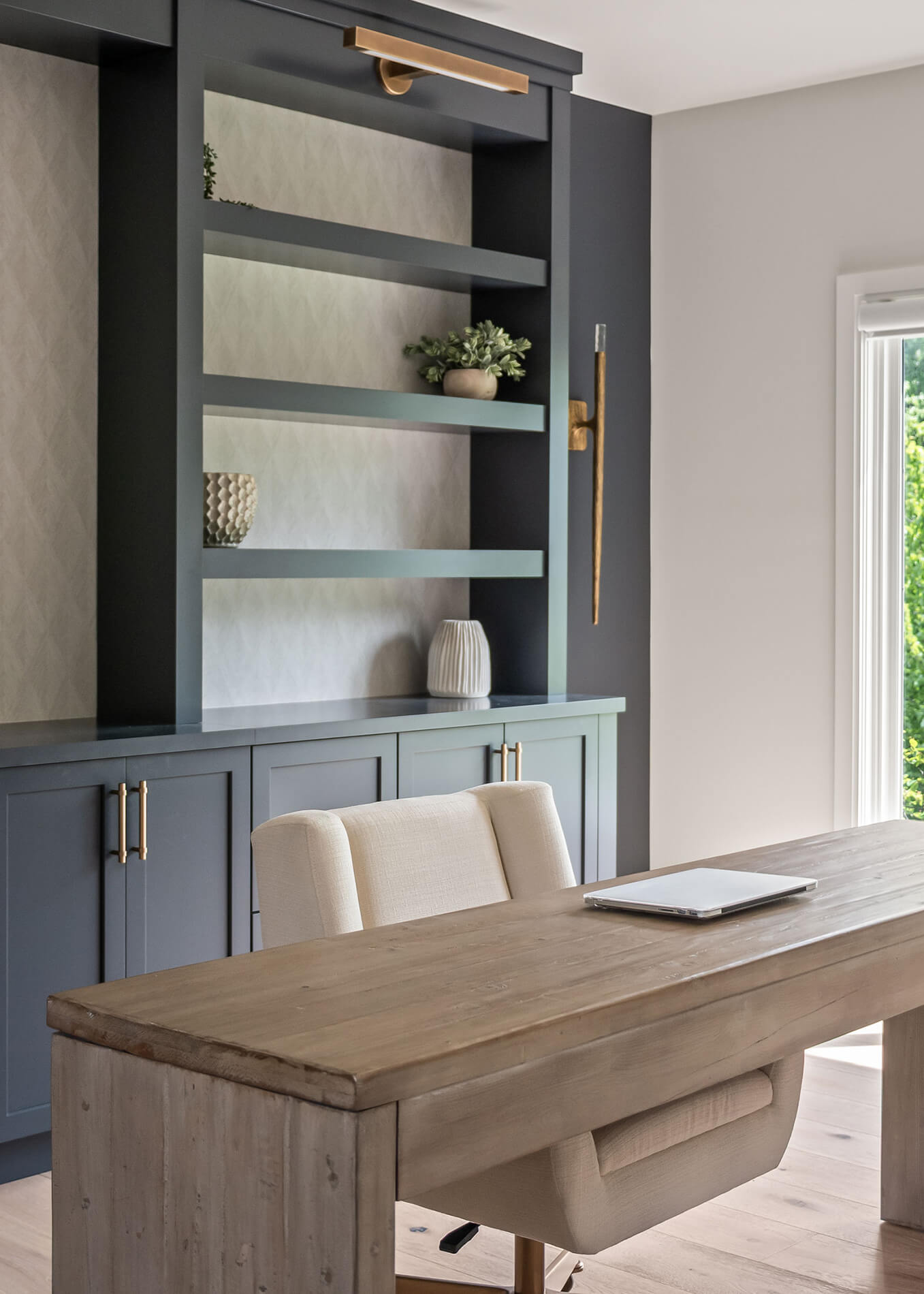 In the home office, we took a bolder approach – cabinetry using the Hudson door style in “Cyberspace” paint finish, bringing focus and sophistication to the space where work happens. It feels grounded, personal, and strong.