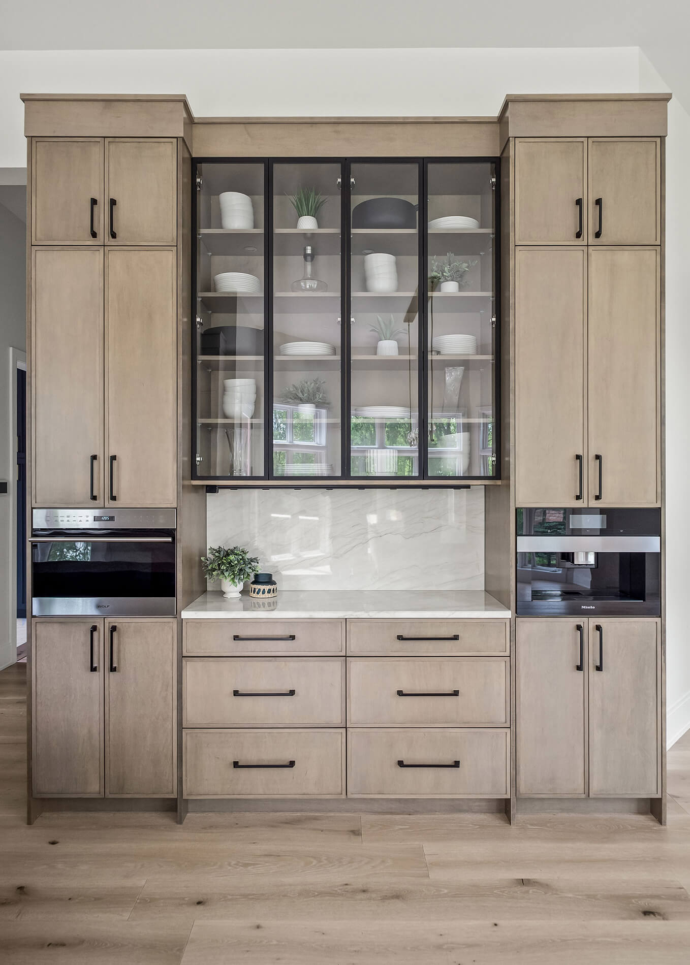 The glass accent doors on the hutch area feature Dura Supreme’s Aluminum Frame Door Style #1 in the “Onyx” matte black metal finish.
