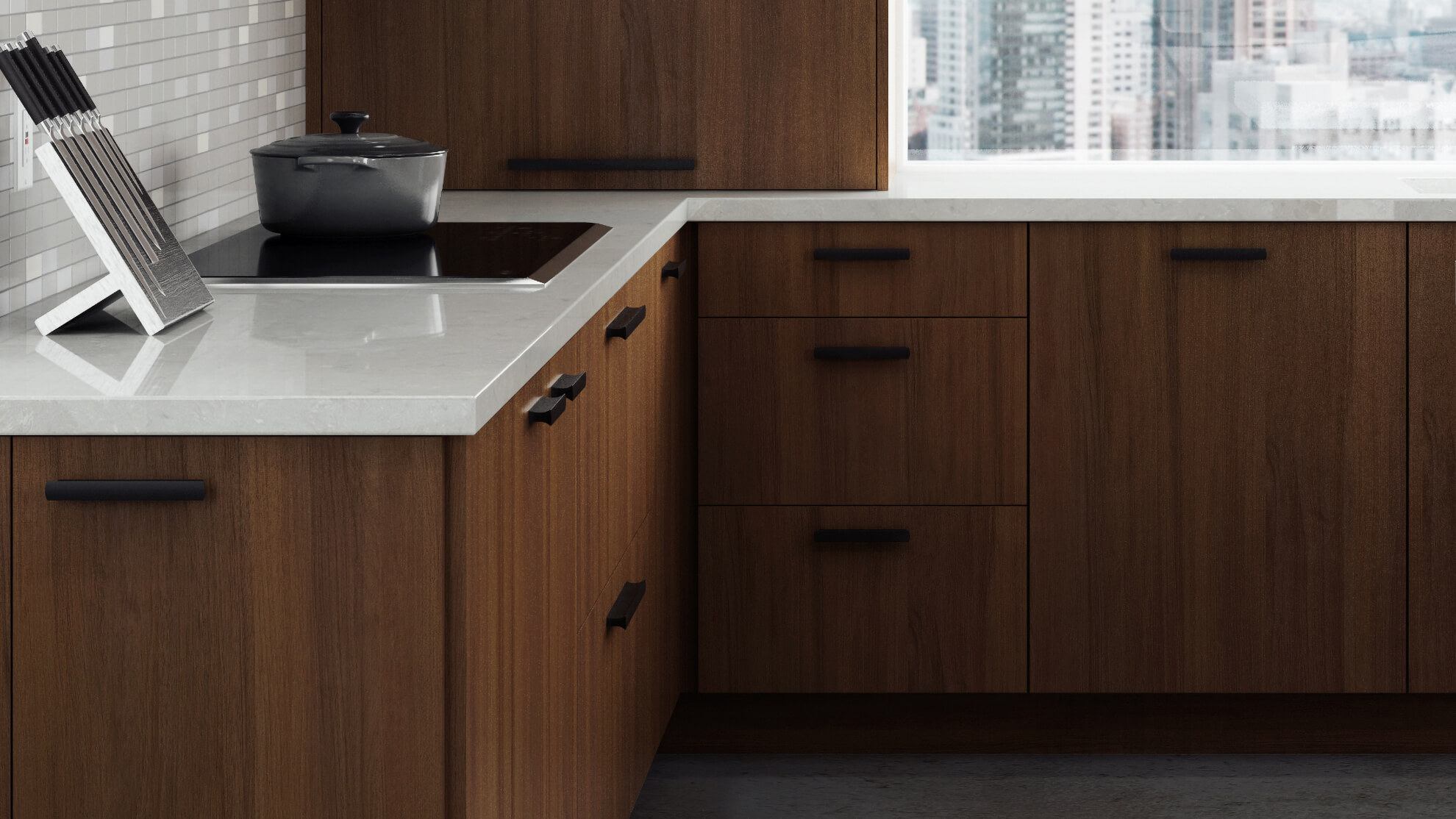 Kitchen corner cabinets, whether located in the walls or as base units, come in three main shapes: diagonal, square (also known as “pie-cut”), and blind. These cabinets can sometimes be challenging to access fully, but Dura Supreme does offer various internal accessories designed specifically to enhance their functionality. The most selected corner cabinet solutions include Lazy Susans in a square shaped corner and swing-out storage options to optimize blind shaped corners.