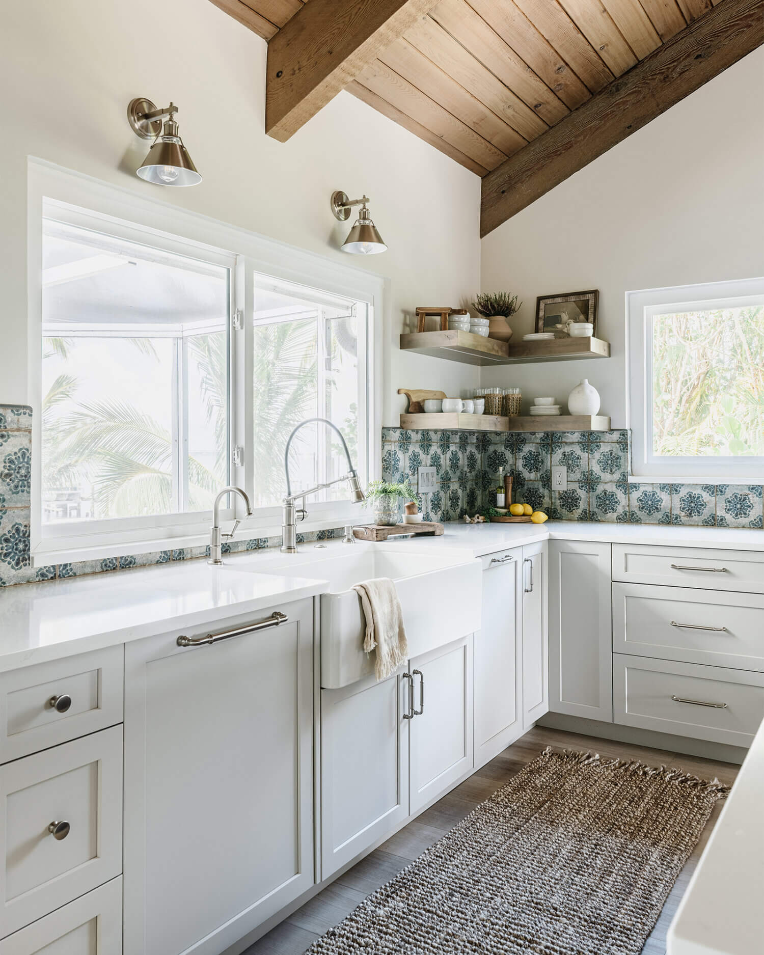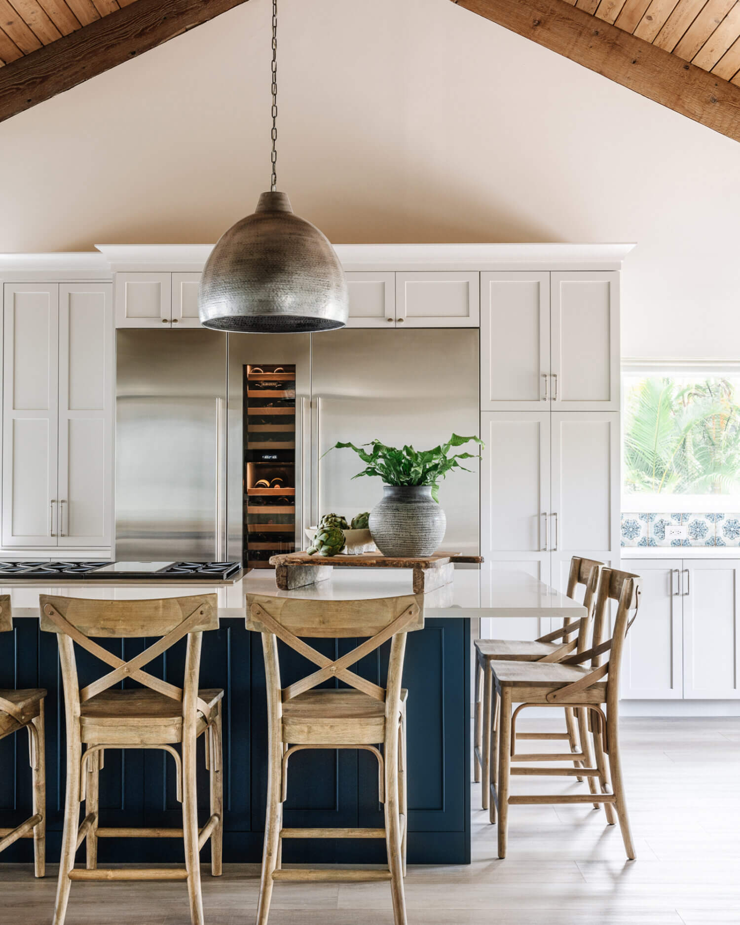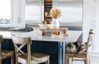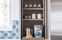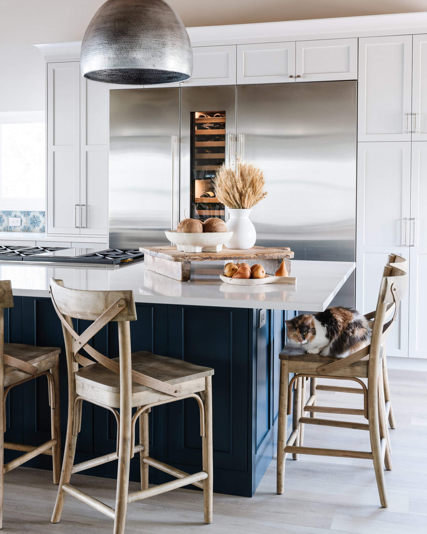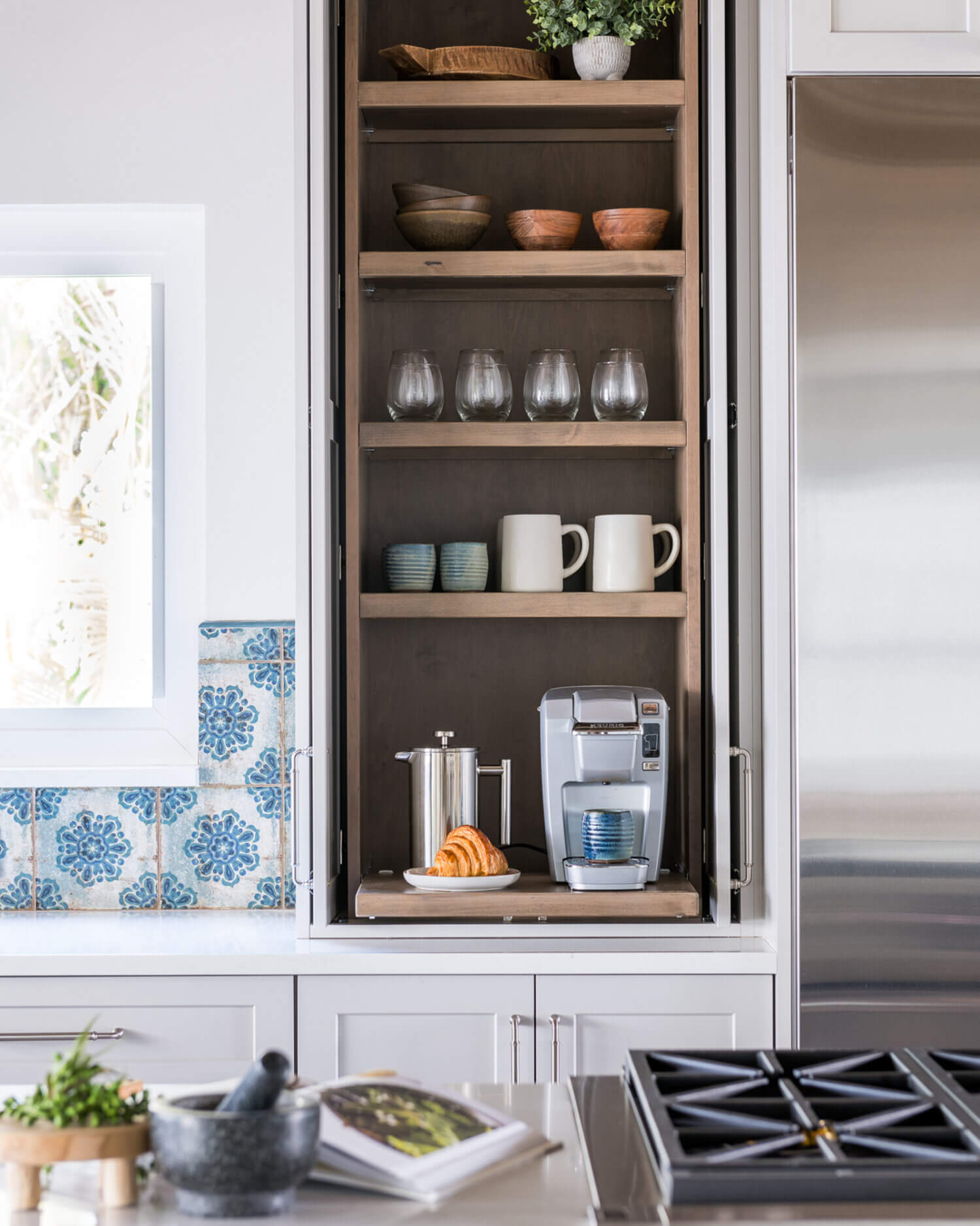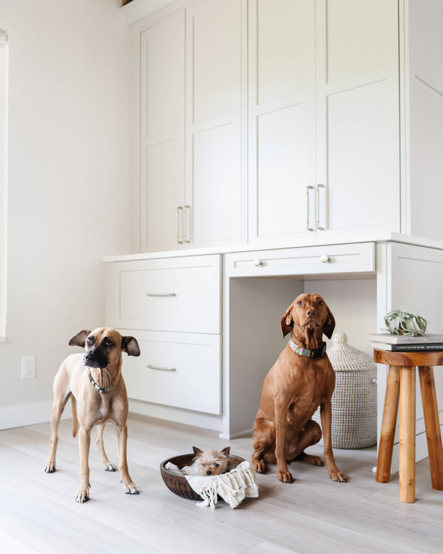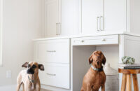 This kitchen color palette is delightful with cool whites, navy blues, earthy greenery, and accents of true brown wood tones. The homeowners keep everyday items within reach and displayed beautifully on two corner floating shelves next to the kitchen sink. This design features Dura Supreme’s Hudson shaker door style in “Pearl” paint for the perimeter cabinets, “Gale Force” paint for the kitchen island, and “Coriander” stain on Knotty Alder for the floating shelves and wood accents. The floating shelves are designed to coordinate seamlessly with the cabinets and millwork throughout the home and match the interior of the beverage station larder cabinet. The laundry room is designed to also accommodate the three dogs of the household and also uses the Hudson door in “Pearl” paint.