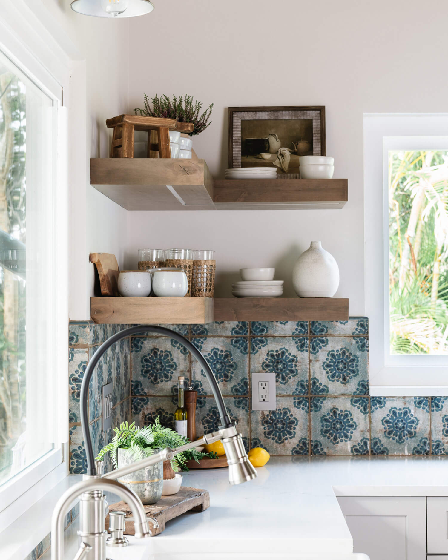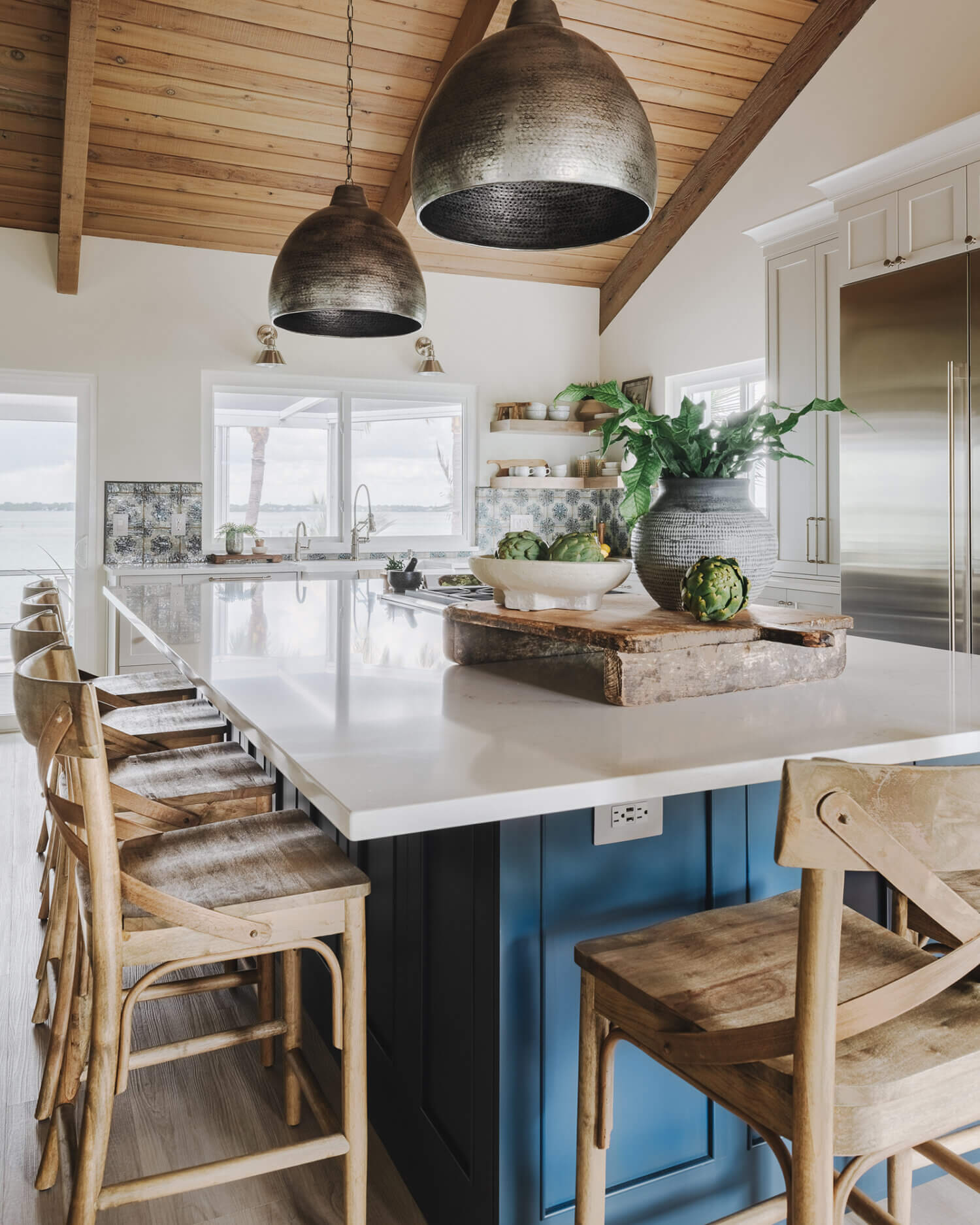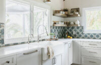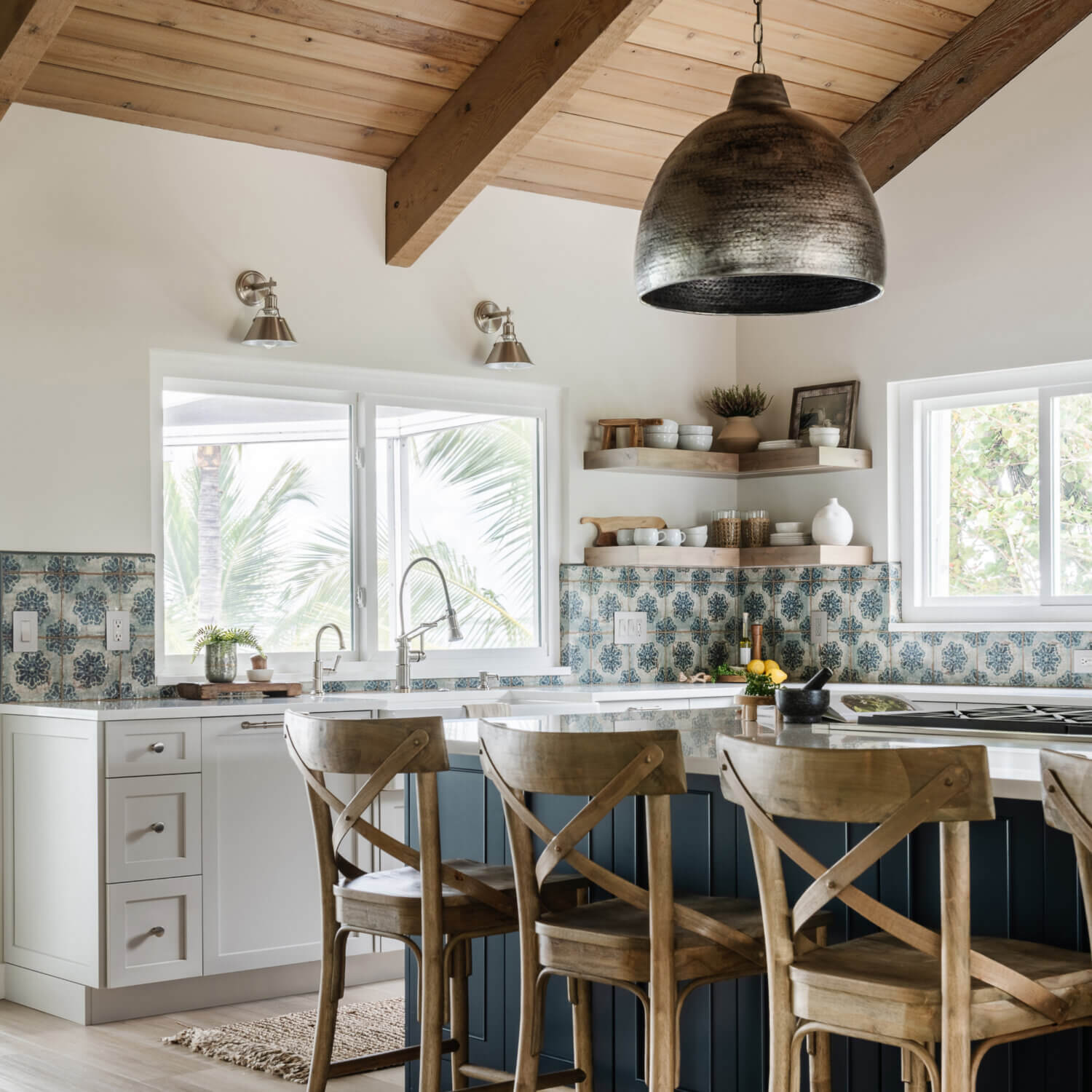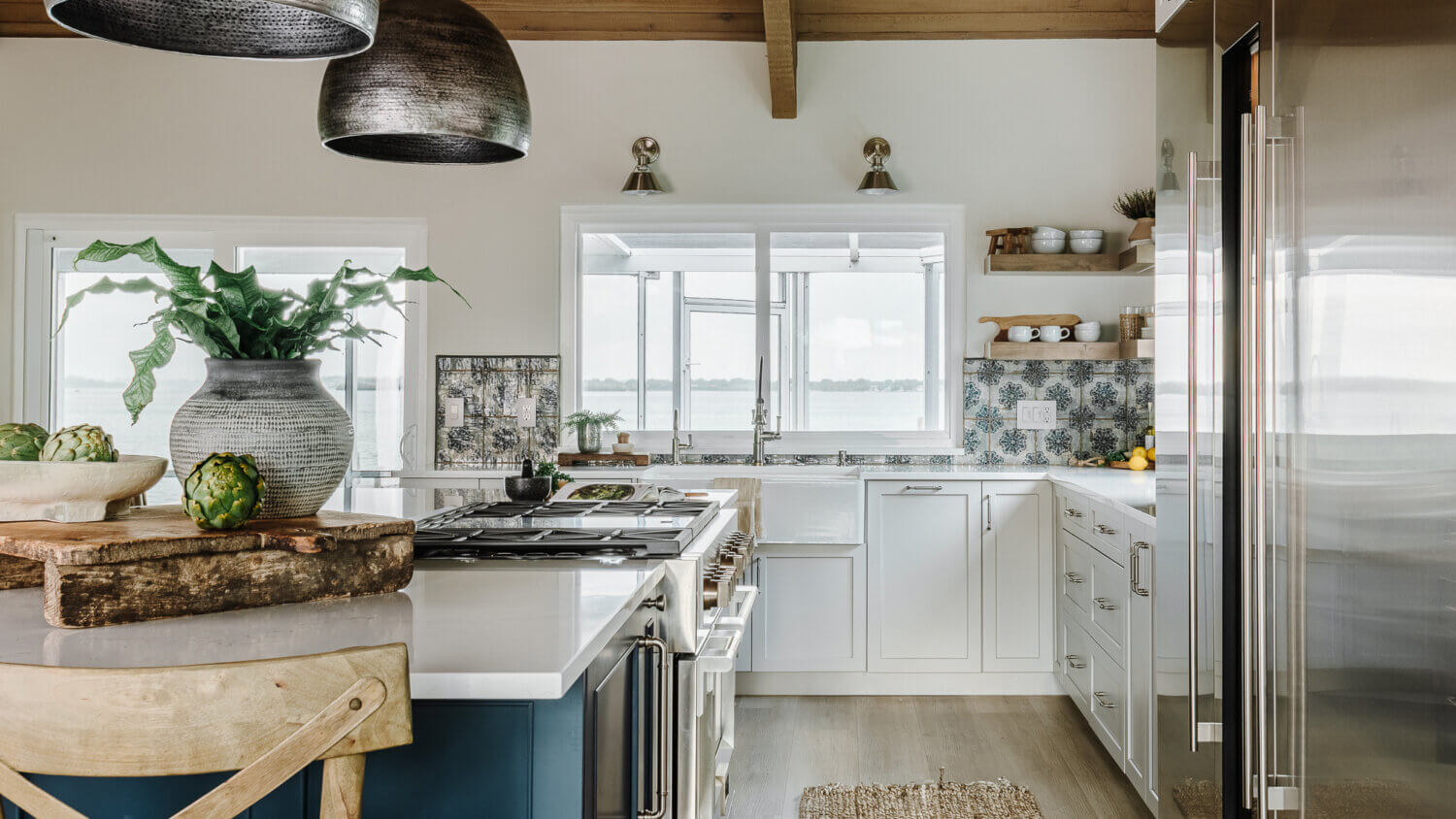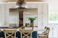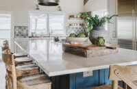 This kitchen color palette is delightful with cool whites, navy blues, earthy greenery, and accents of true brown wood tones. The homeowners keep everyday items within reach and displayed beautifully on two corner floating shelves next to the kitchen sink. This design features Dura Supreme’s Hudson shaker door style in “Pearl” paint for the perimeter cabinets, “Gale Force” paint for the kitchen island, and “Coriander” stain on Knotty Alder for the floating shelves and wood accents. The floating shelves are designed to coordinate seamlessly with the cabinets and millwork throughout the home and match the interior of the beverage station larder cabinet. The laundry room is designed to also accommodate the three dogs of the household and also uses the Hudson door in “Pearl” paint.