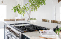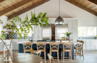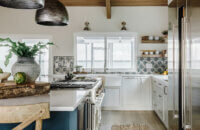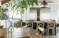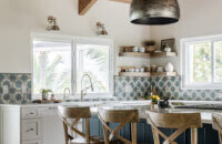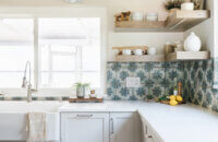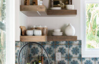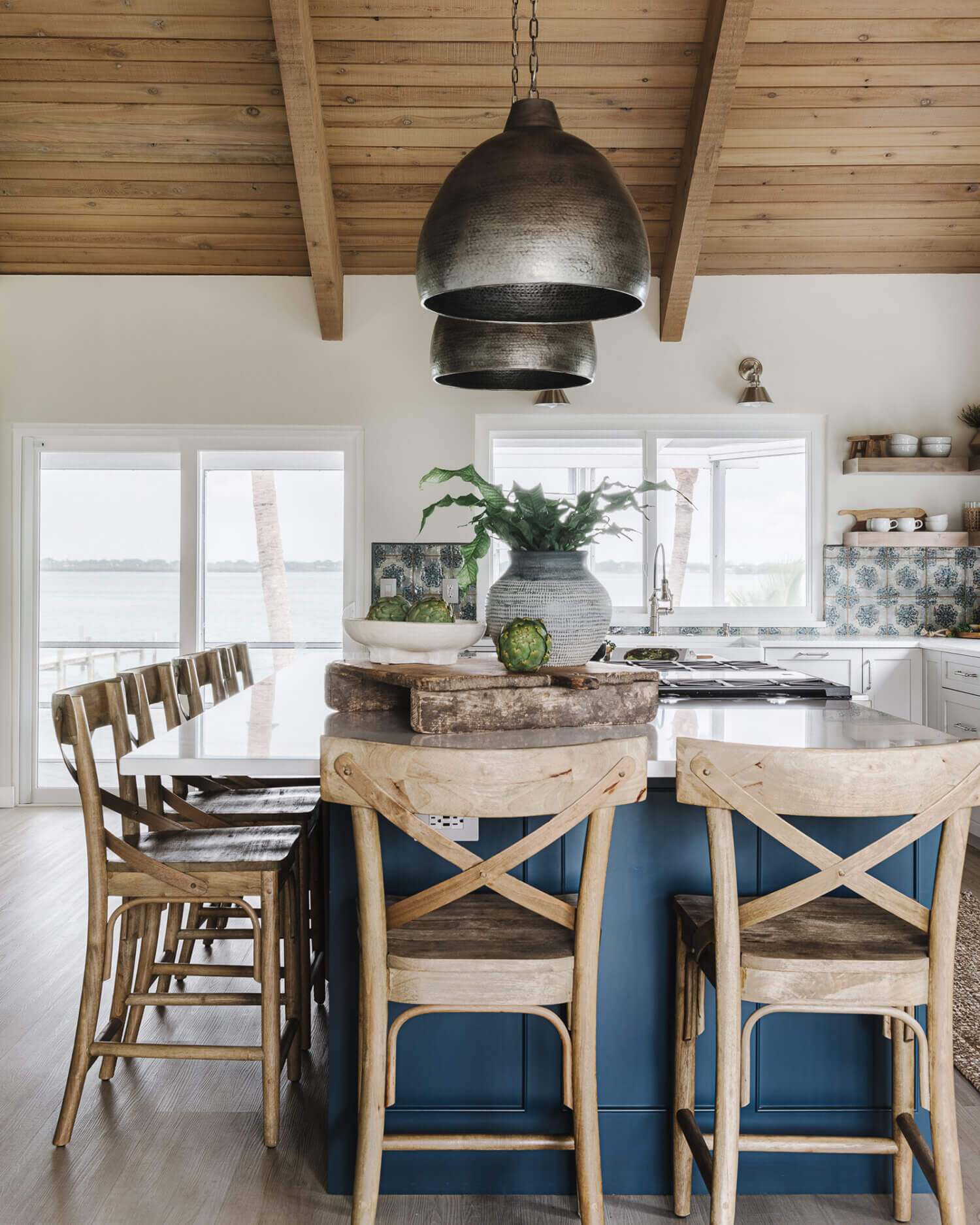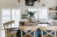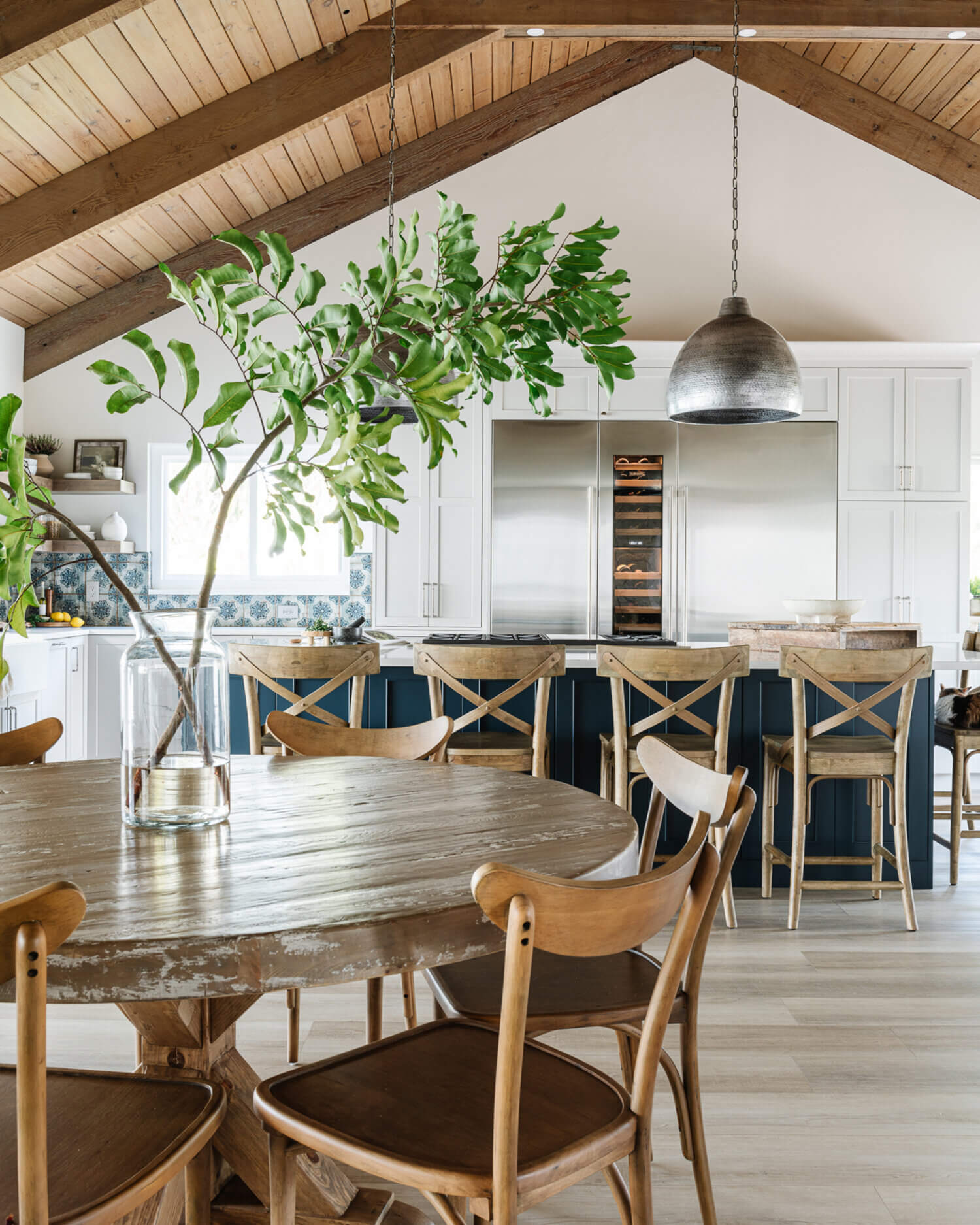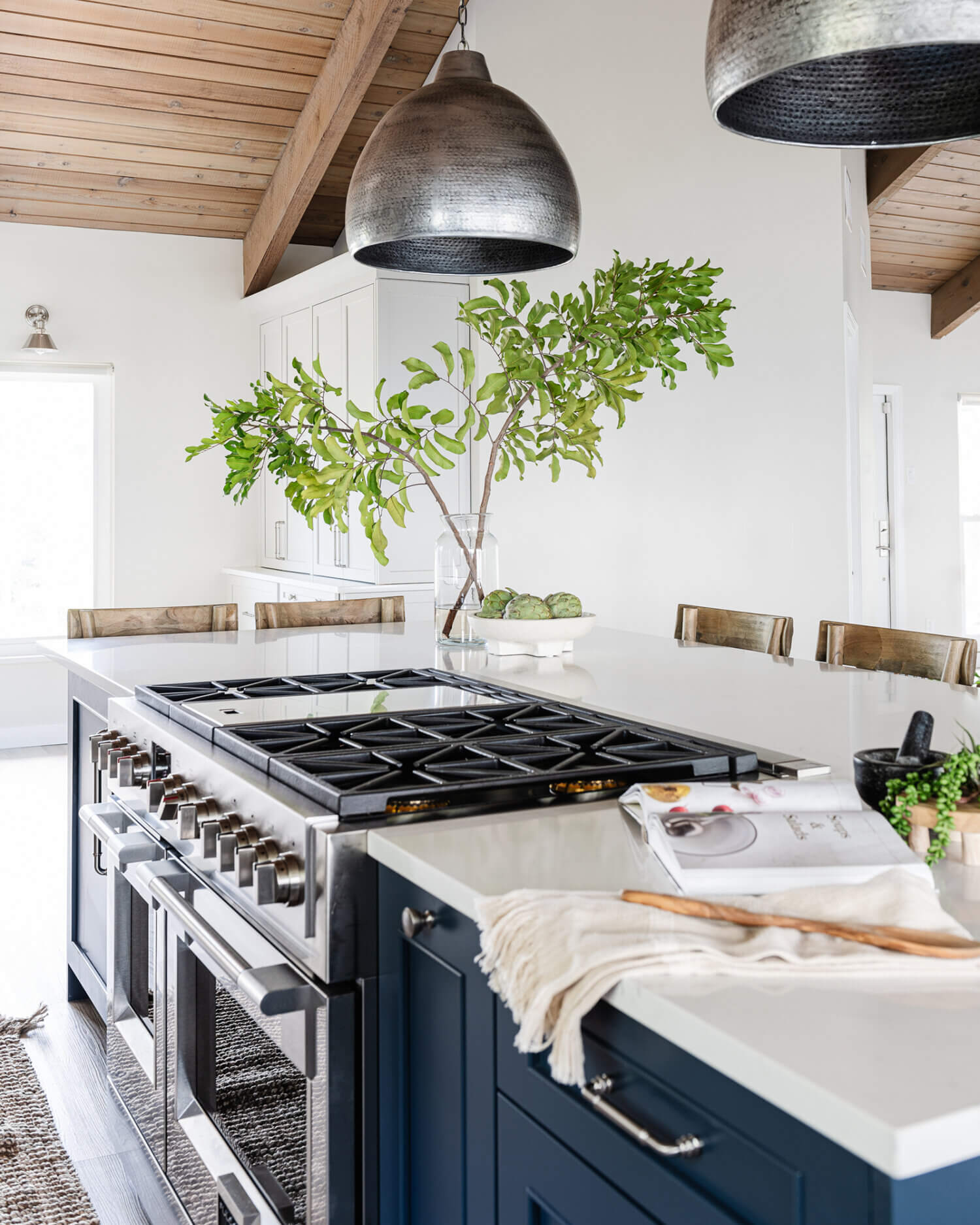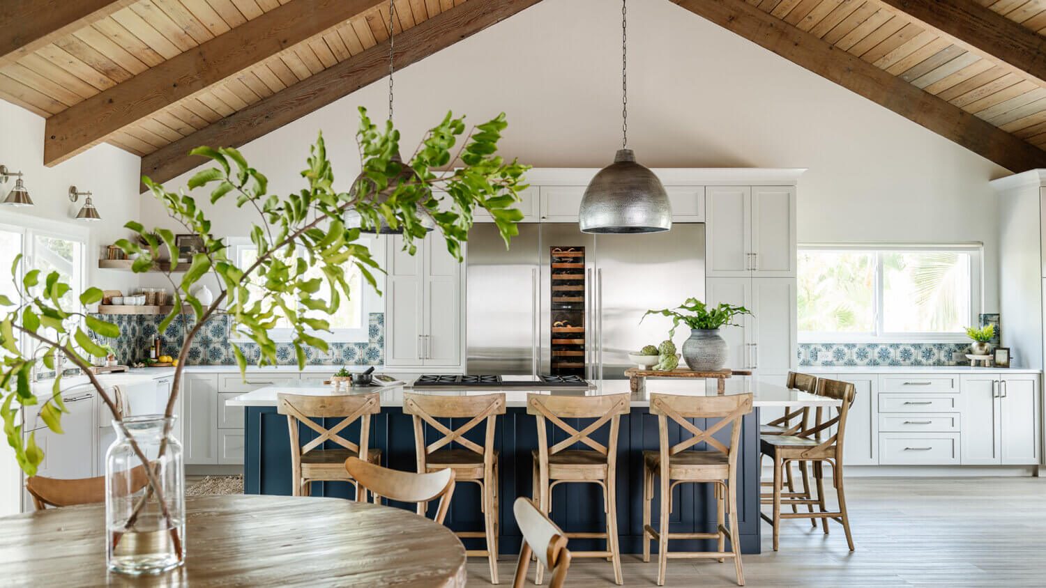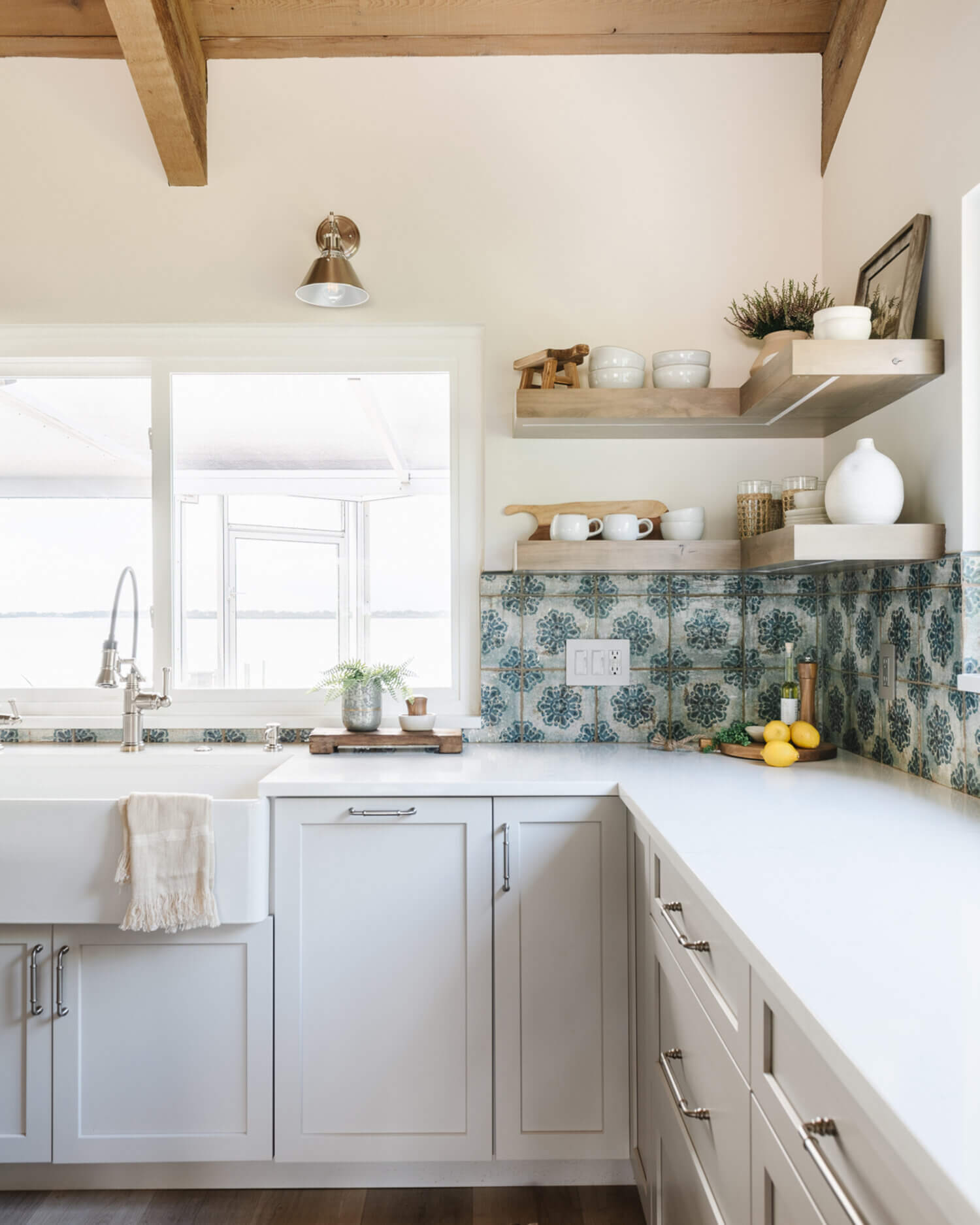 This kitchen color palette is delightful with cool whites, navy blues, earthy greenery, and accents of true brown wood tones. The homeowners keep everyday items within reach and displayed beautifully on two corner floating shelves next to the kitchen sink. This design features Dura Supreme’s Hudson shaker door style in “Pearl” paint for the perimeter cabinets, “Gale Force” paint for the kitchen island, and “Coriander” stain on Knotty Alder for the floating shelves and wood accents. The floating shelves are designed to coordinate seamlessly with the cabinets and millwork throughout the home and match the interior of the beverage station larder cabinet. The laundry room is designed to also accommodate the three dogs of the household and also uses the Hudson door in “Pearl” paint.