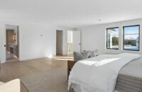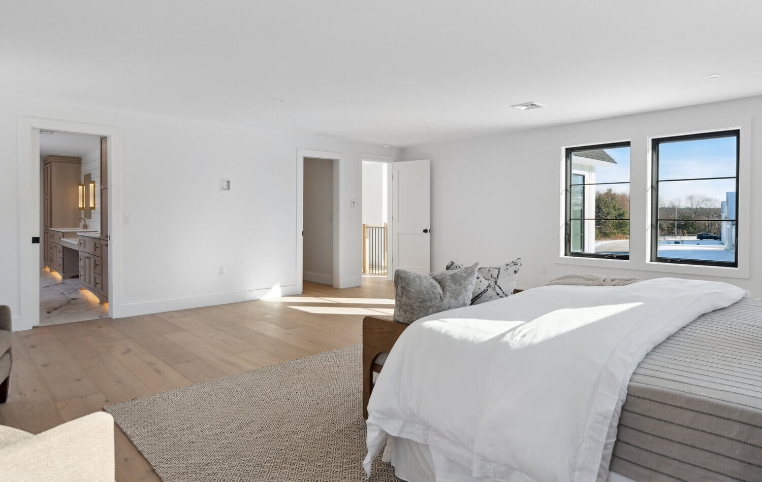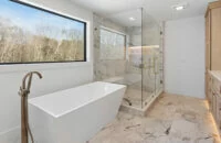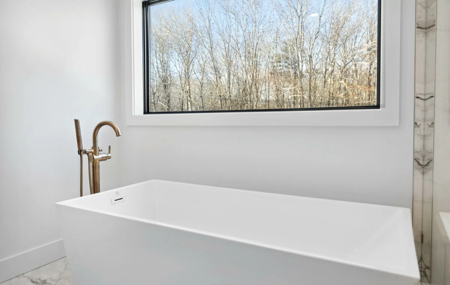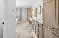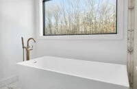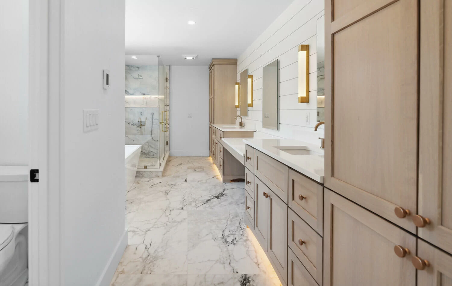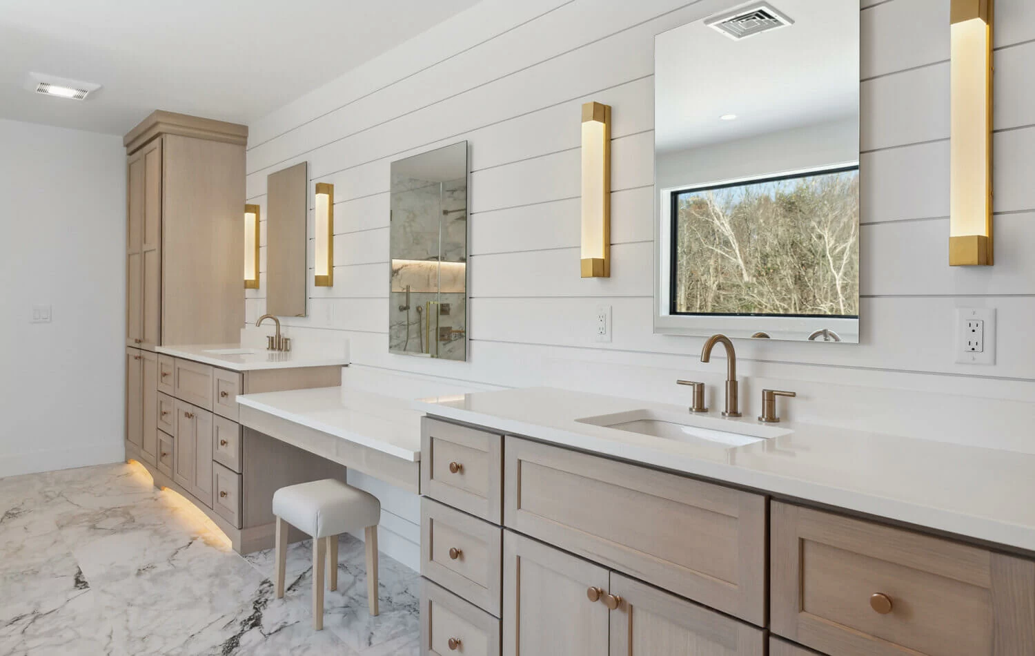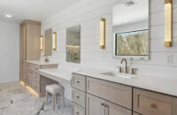 An organic, modern farmhouse master bathroom suite featuring Dura Supreme’s Homestead Panel cabinet door style in the “Alabaster” stain on Quarter-Sawn White Oak. White, shiplap wall panels add a farmhouse feeling to the space while the contemporary gold faucets, fixtures, and hardware add a pinch of modern vibes to the space.