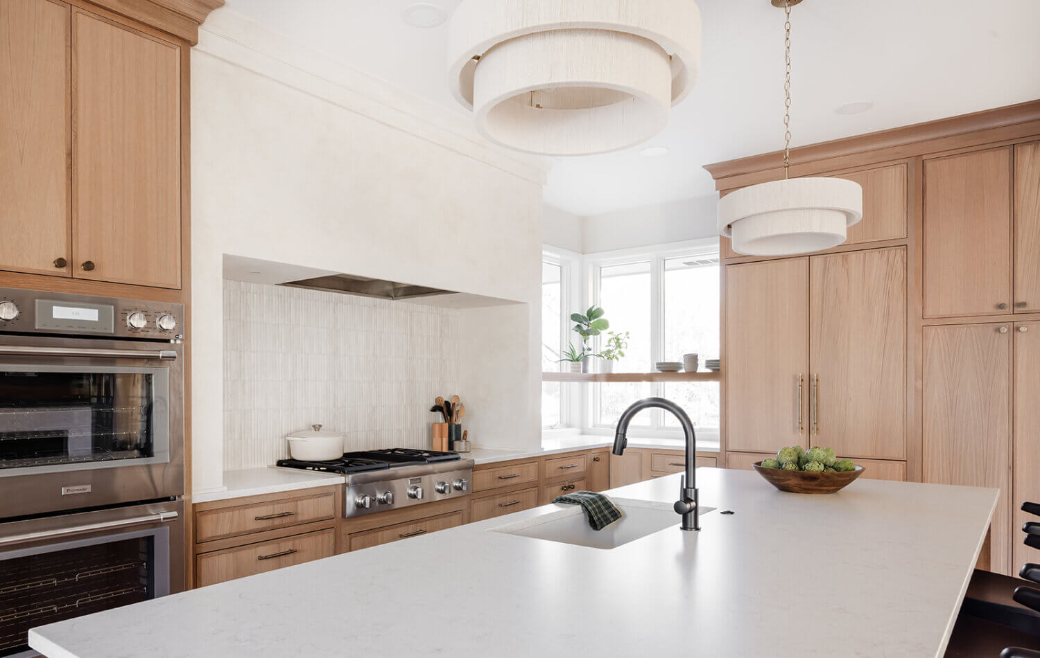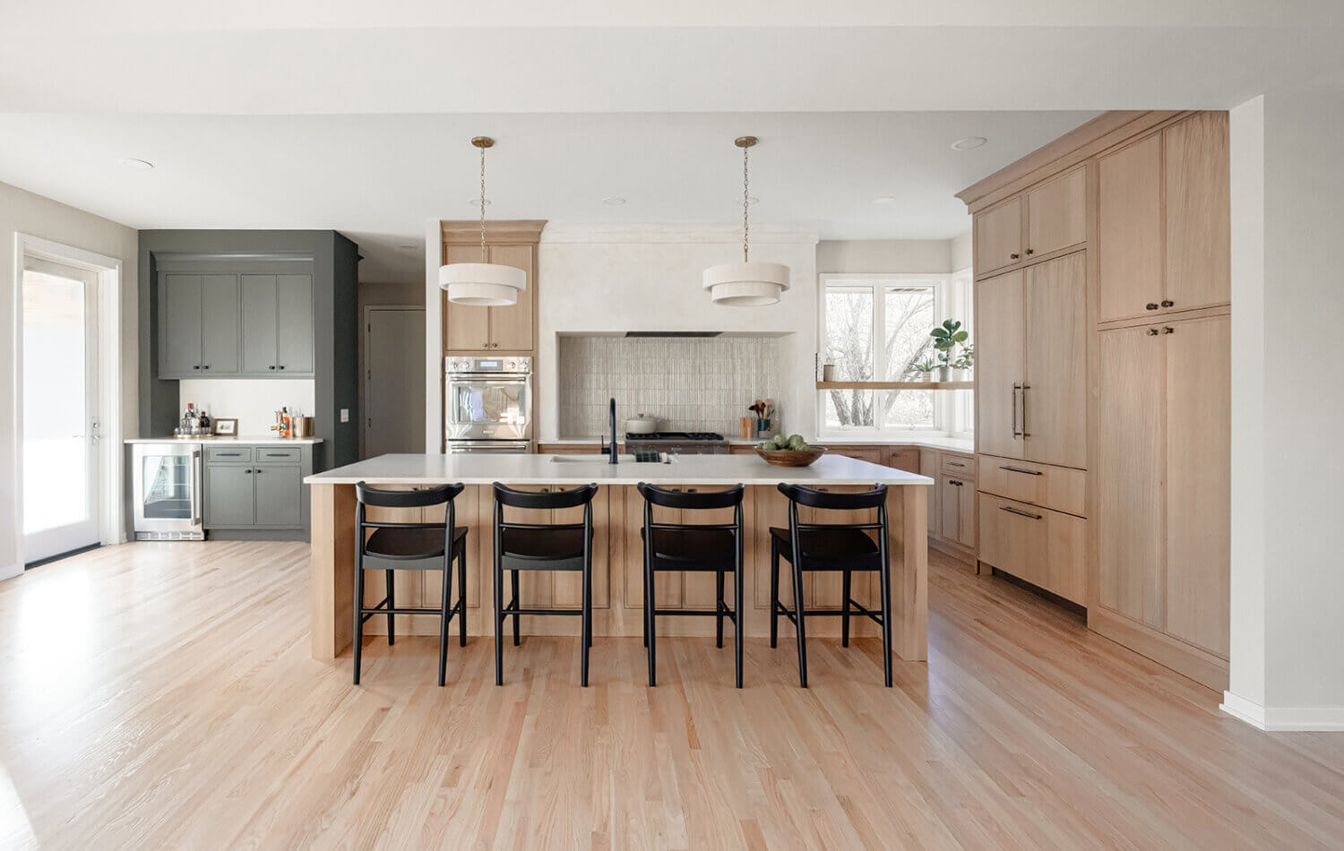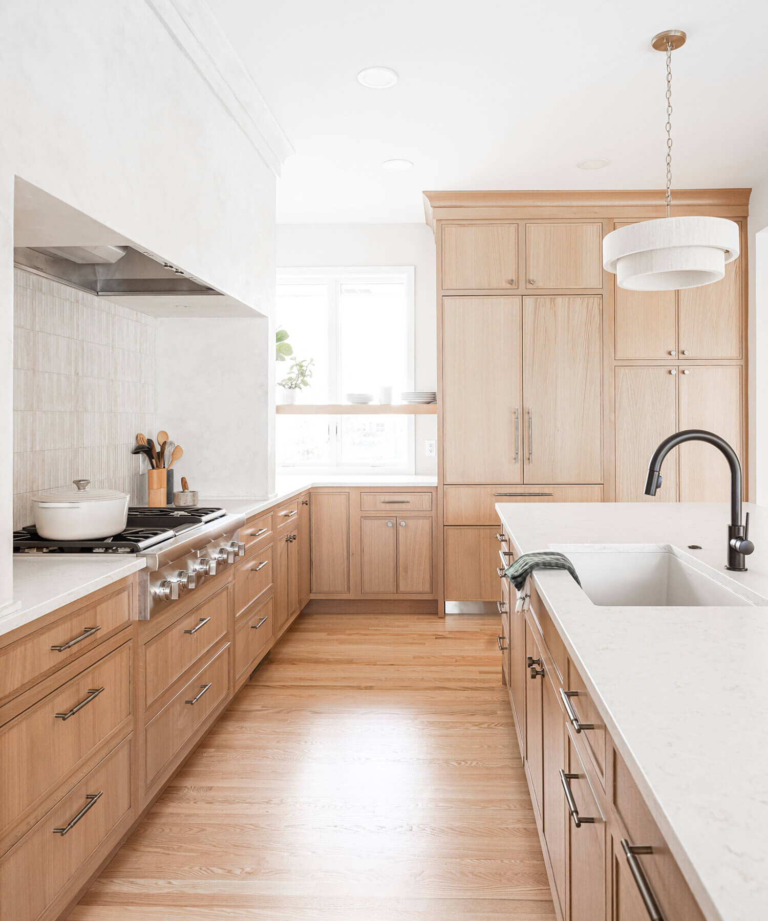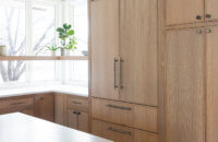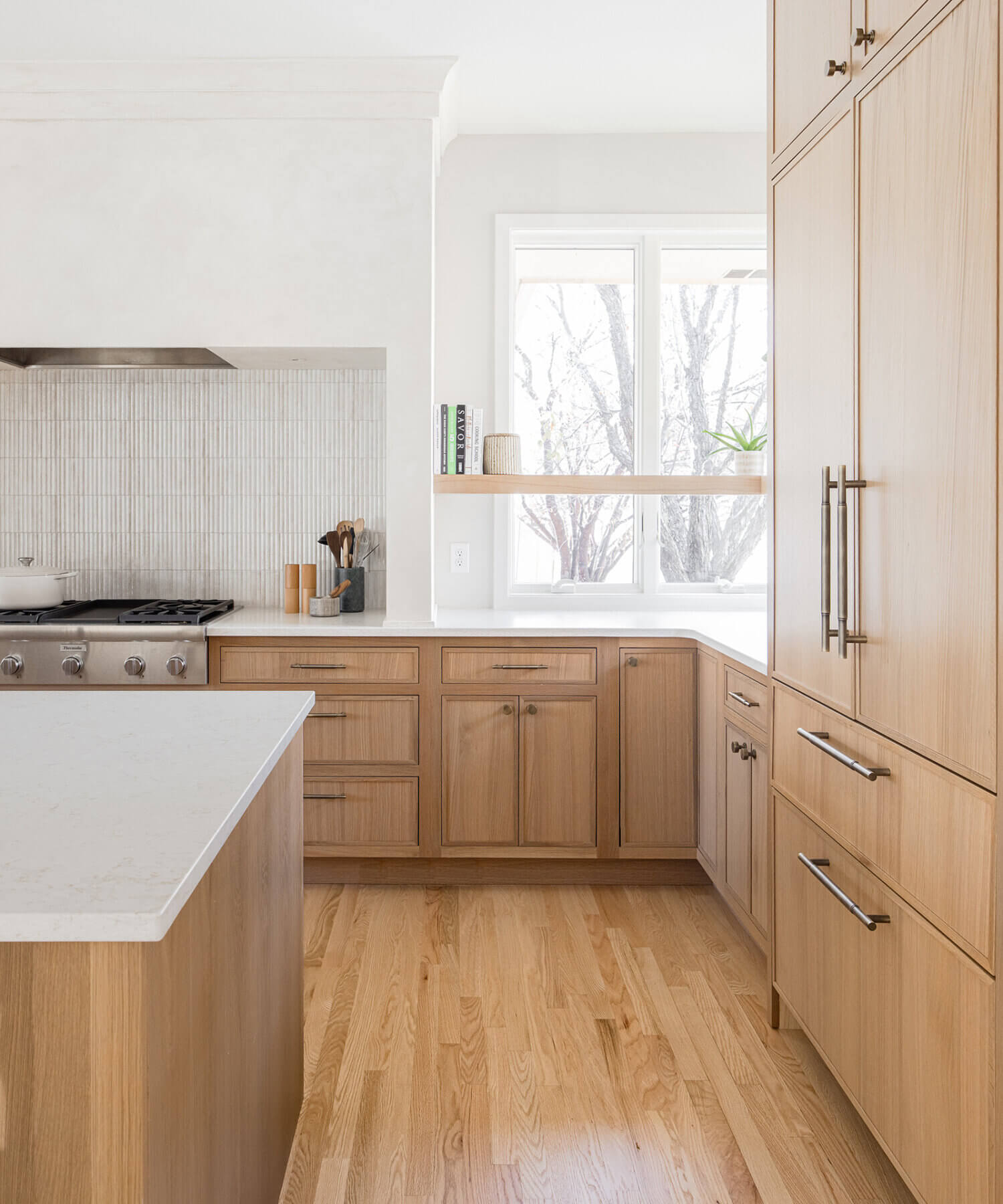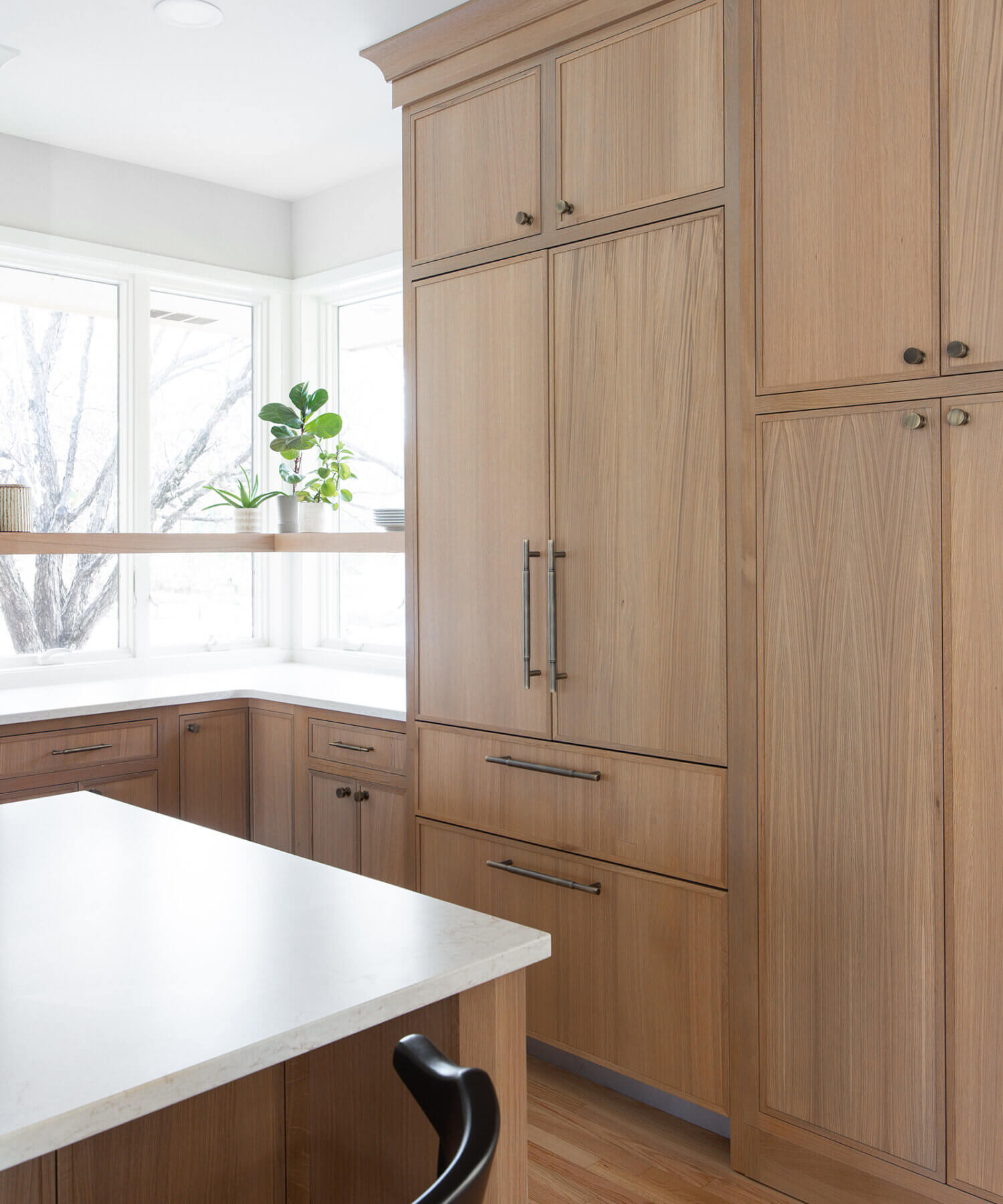 Abundant natural light pours in, illuminating the spacious alcove cooking area and white walls, creating a bright and airy atmosphere without relying on white painted cabinets. The floating shelves by the window are perfect for showcasing the homeowner’s favorite plants, succulents, or fresh herbs, bringing a touch of authentic greenery to the space. The appliance panels help seamlessly conceal the typically large metal appliances with the warmth of natural quarter-sawn white oak.