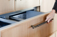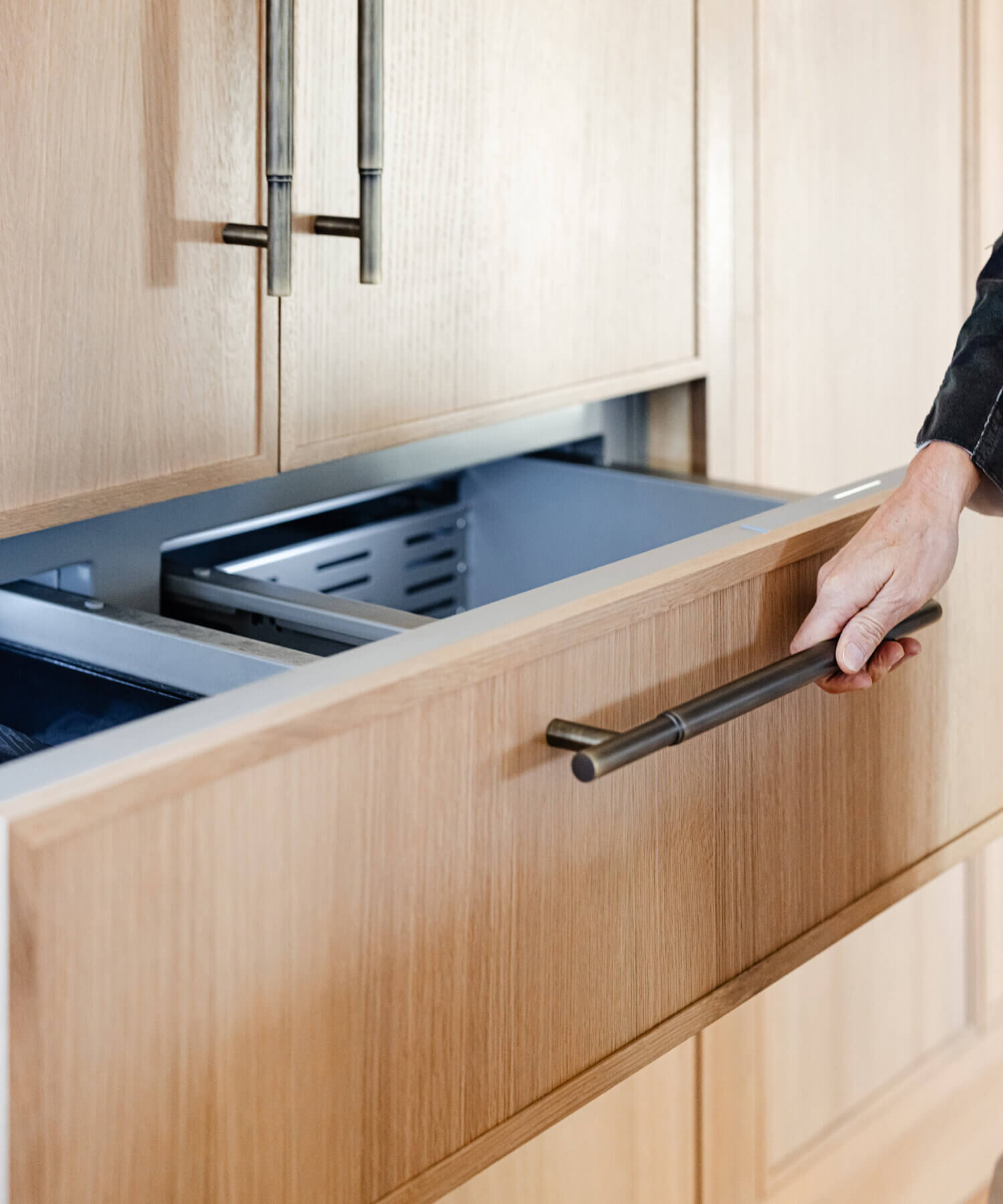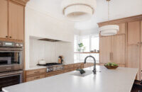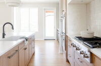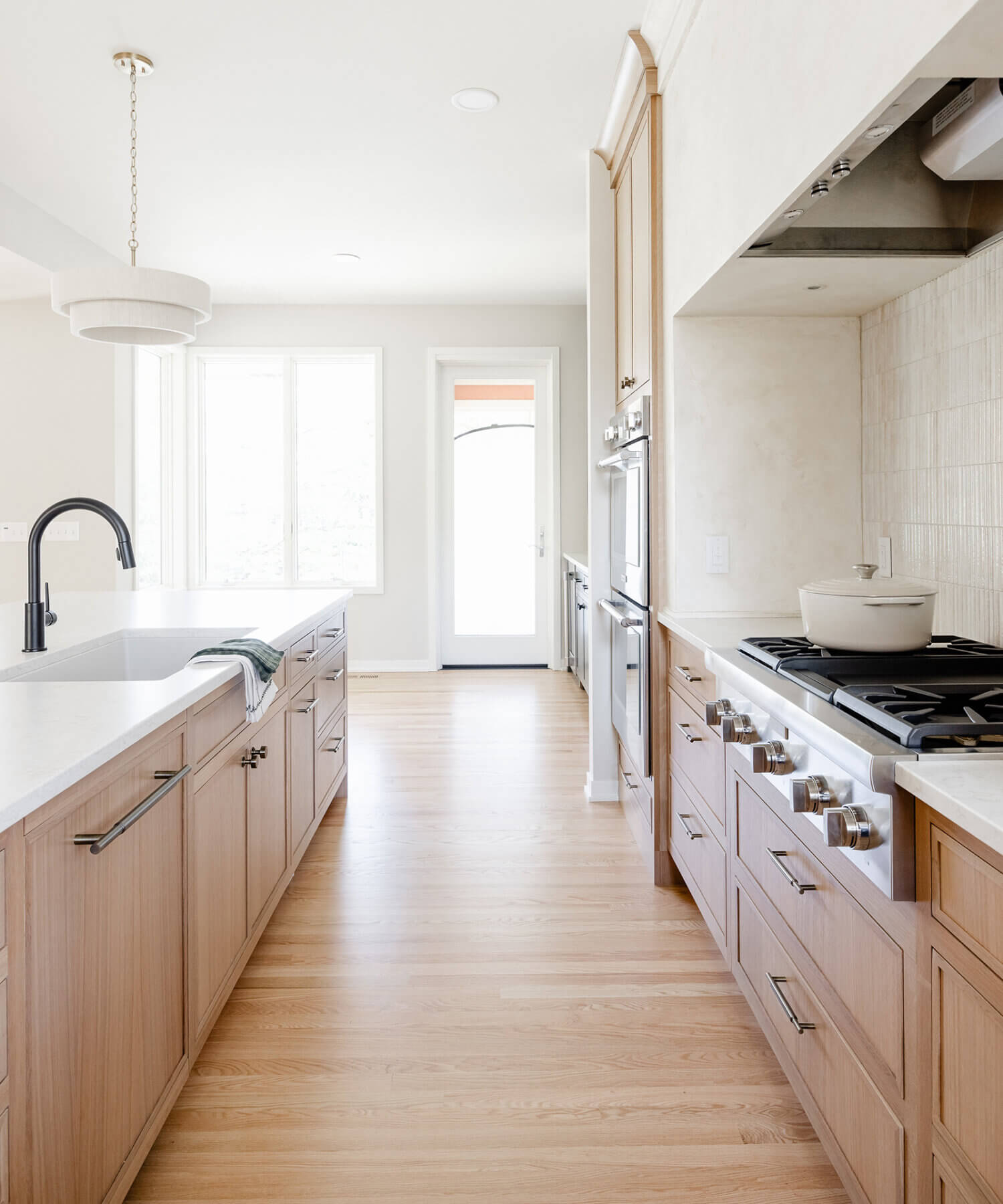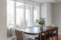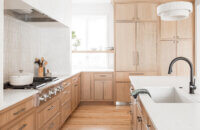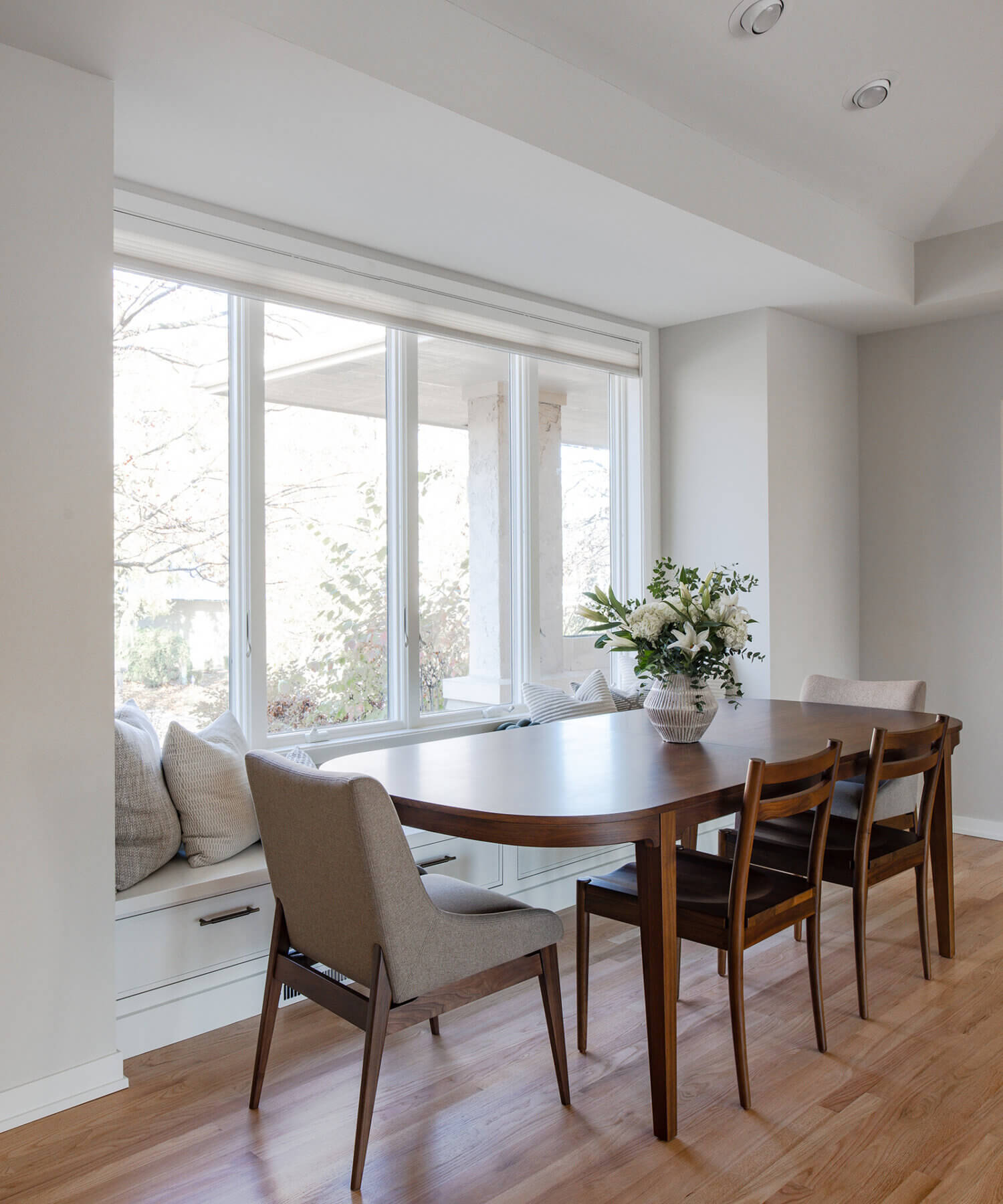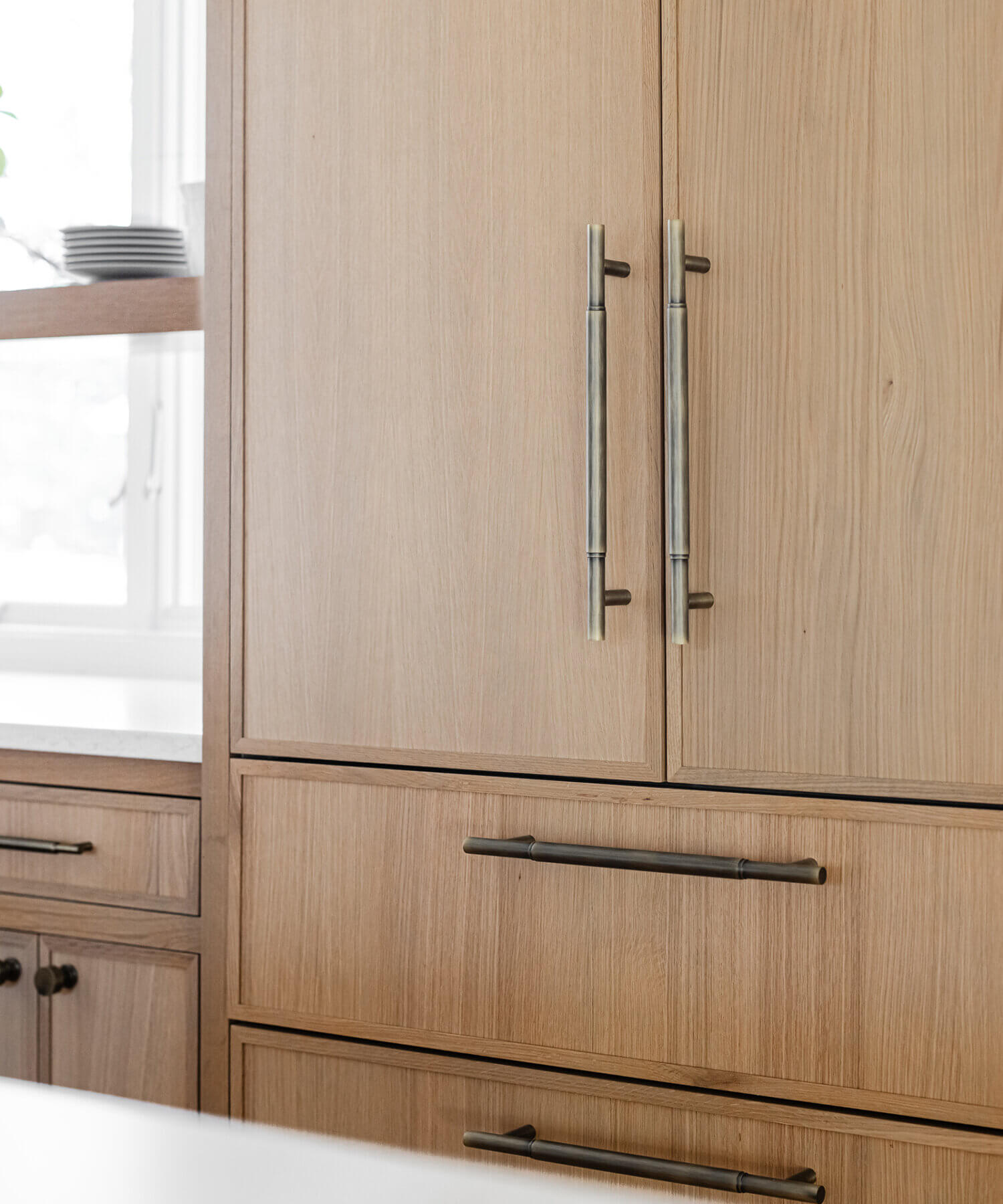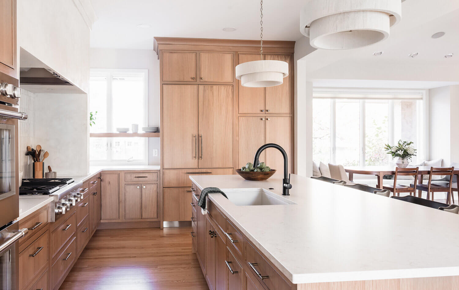 Abundant natural light pours in, illuminating the spacious alcove cooking area and white walls, creating a bright and airy atmosphere without relying on white painted cabinets. The floating shelves by the window are perfect for showcasing the homeowner’s favorite plants, succulents, or fresh herbs, bringing a touch of authentic greenery to the space. The appliance panels help seamlessly conceal the typically large metal appliances with the warmth of natural quarter-sawn white oak.