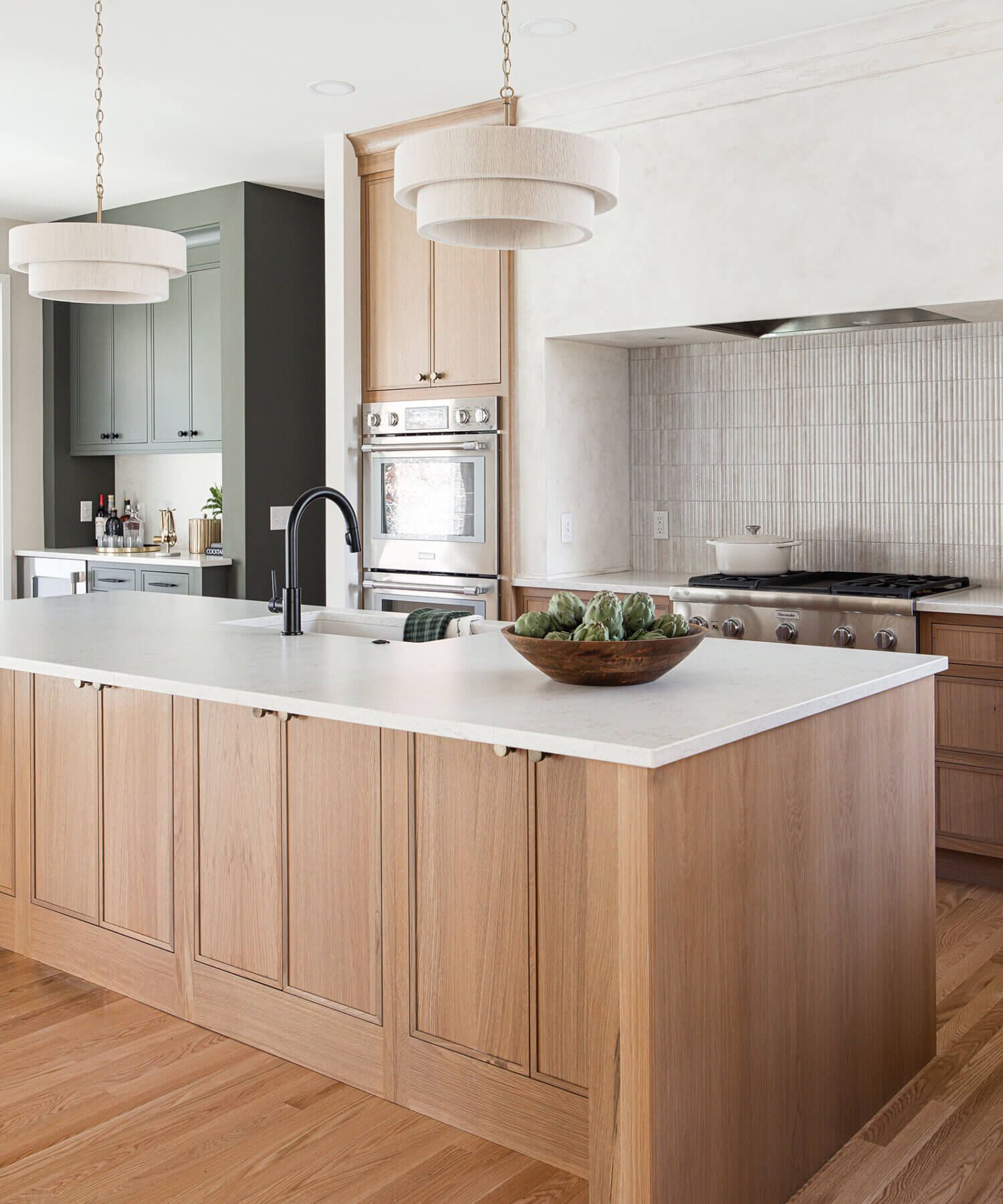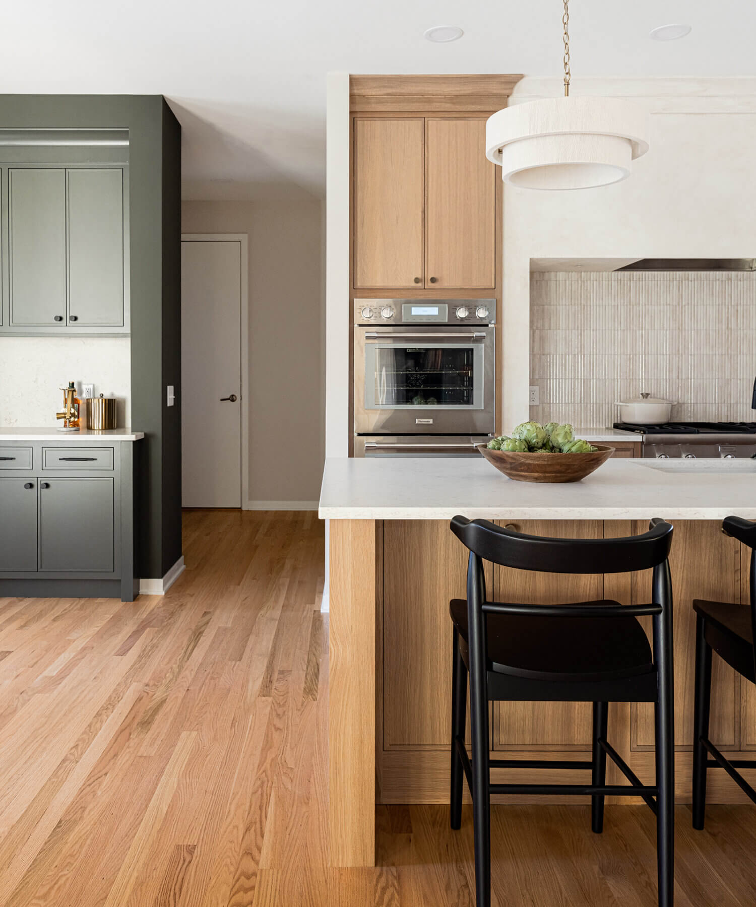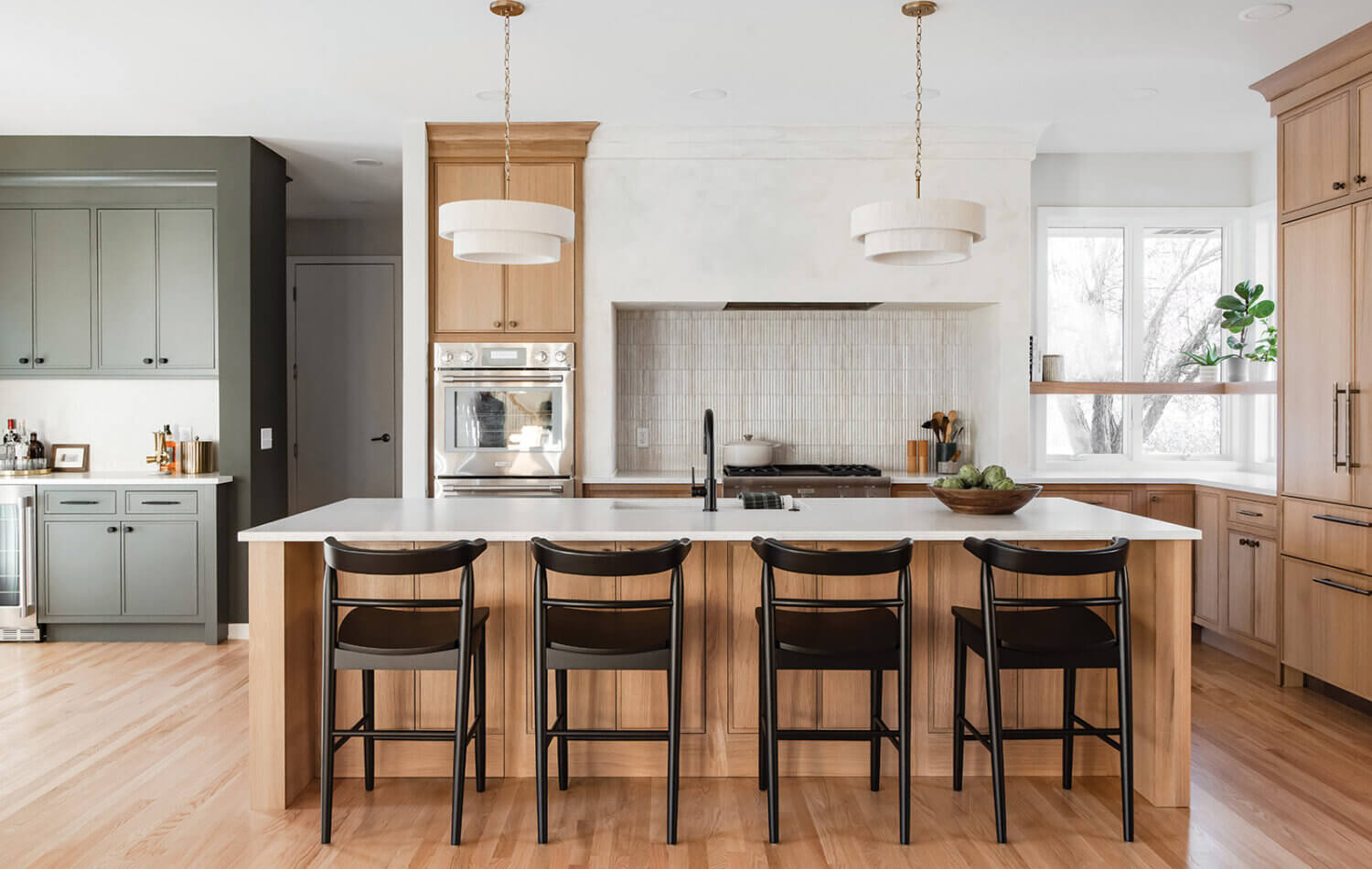 Step into this stunning open-concept home, where earthy tones and nature-inspired elements blend seamlessly. The kitchen boasts the distinguished character of Natural Quarter-Sawn White Oak cabinets, complemented by inviting earthy green painted cabinets. As one of our popular skinny shaker doors, the Reese door style adds a sleek and modern touch to this beautifully designed kitchen. Reese is known for its thin, shallow, minimalistic rails.