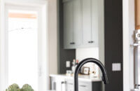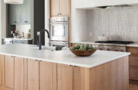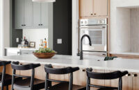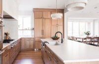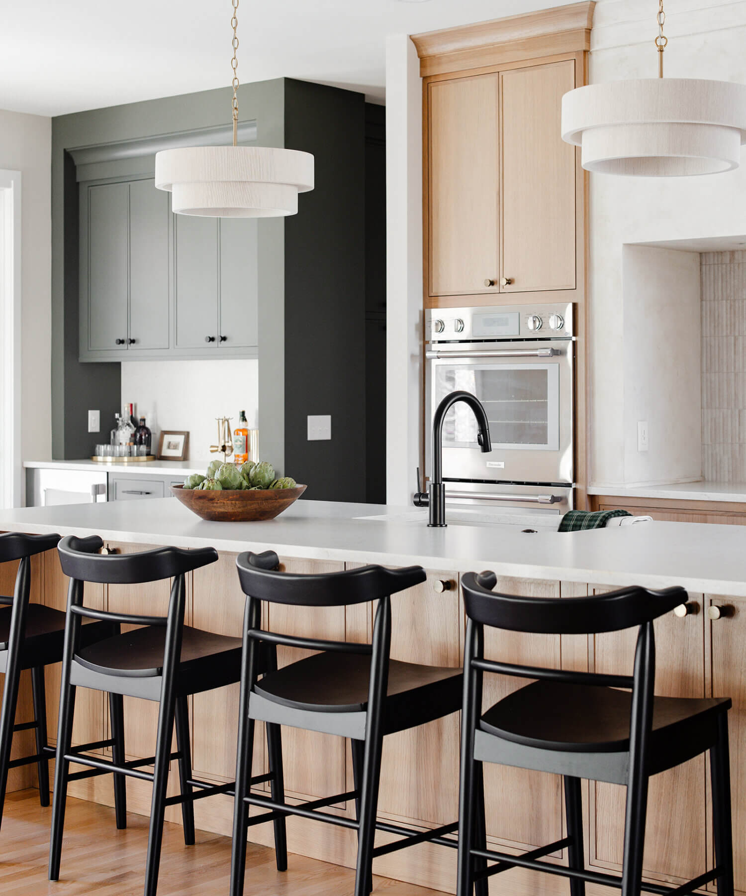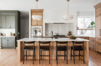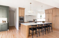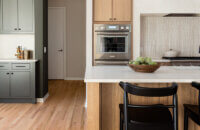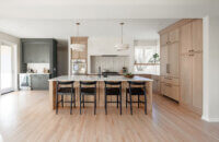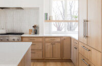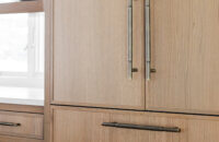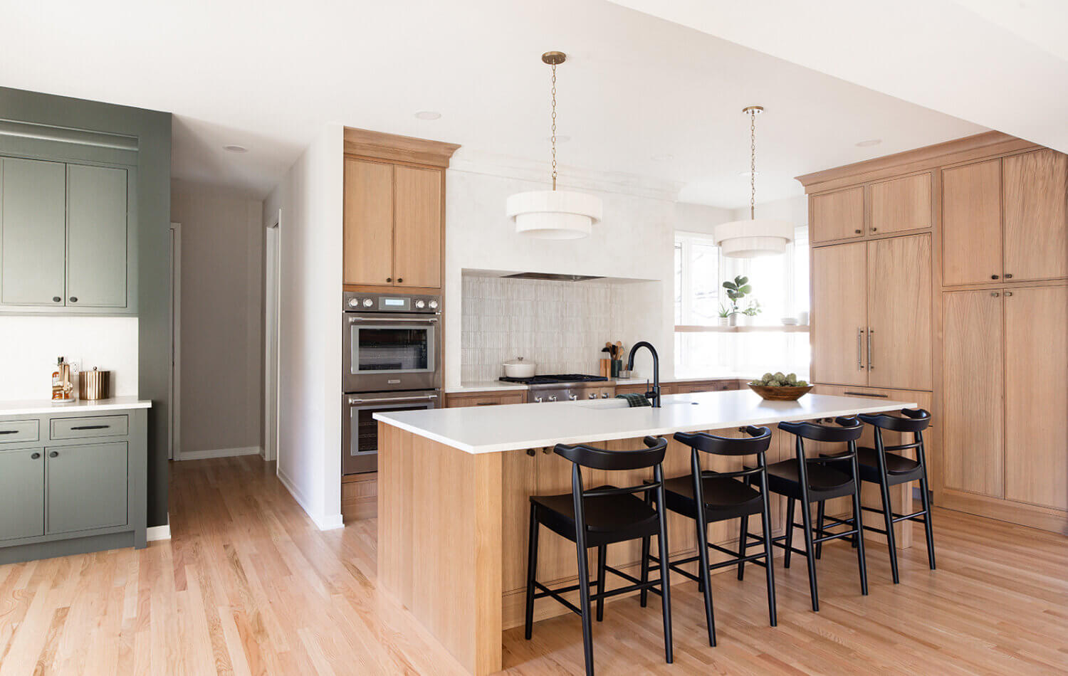 Step into this stunning open-concept home, where earthy tones and nature-inspired elements blend seamlessly. The kitchen boasts the distinguished character of Natural Quarter-Sawn White Oak cabinets, complemented by inviting earthy green painted cabinets. As one of our popular skinny shaker doors, the Reese door style adds a sleek and modern touch to this beautifully designed kitchen. Reese is known for its thin, shallow, minimalistic rails.