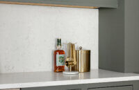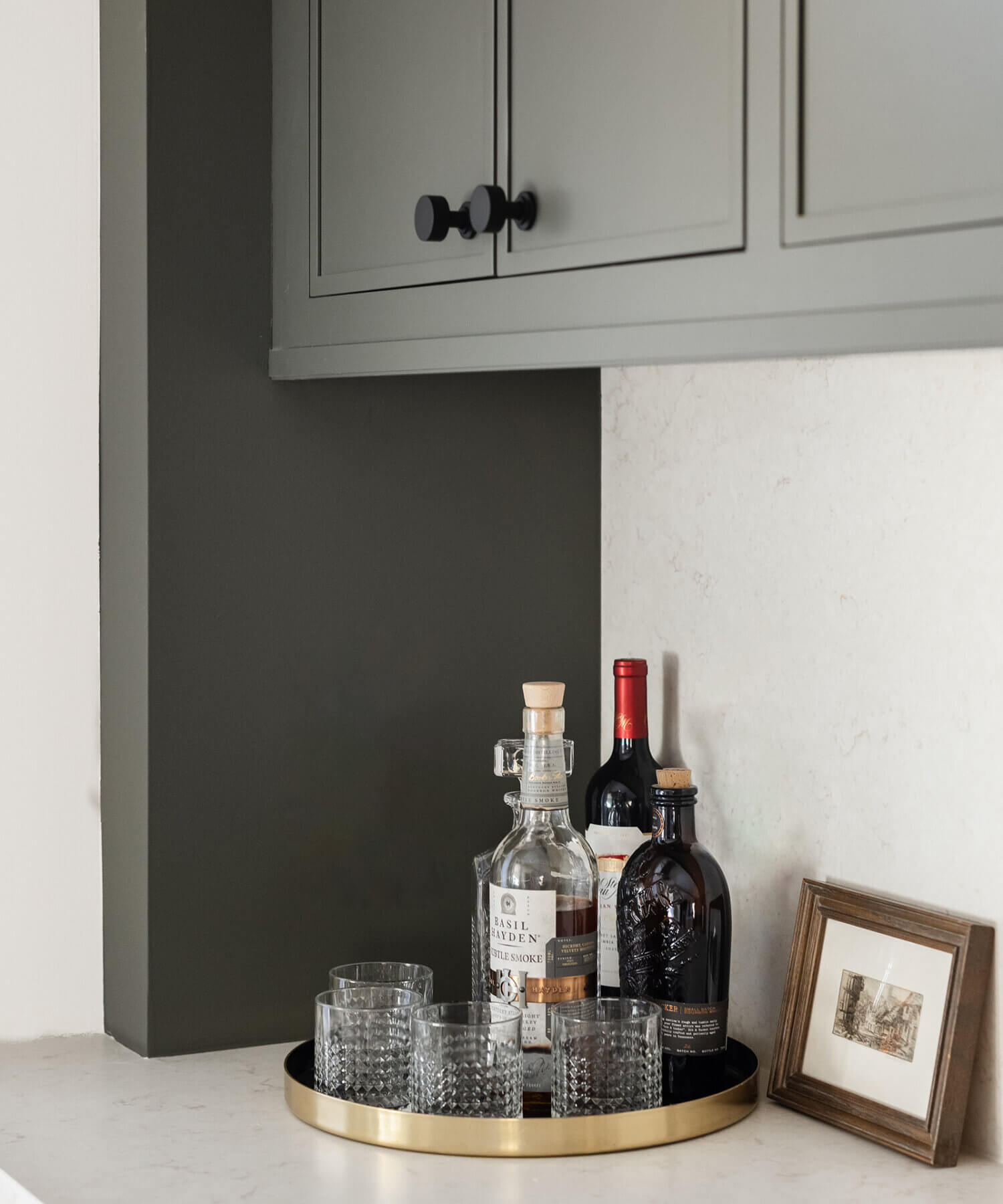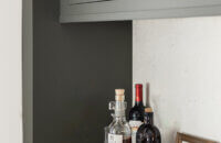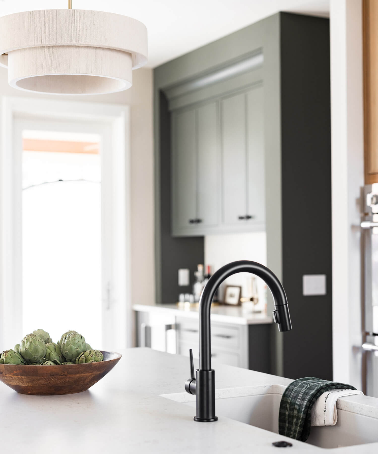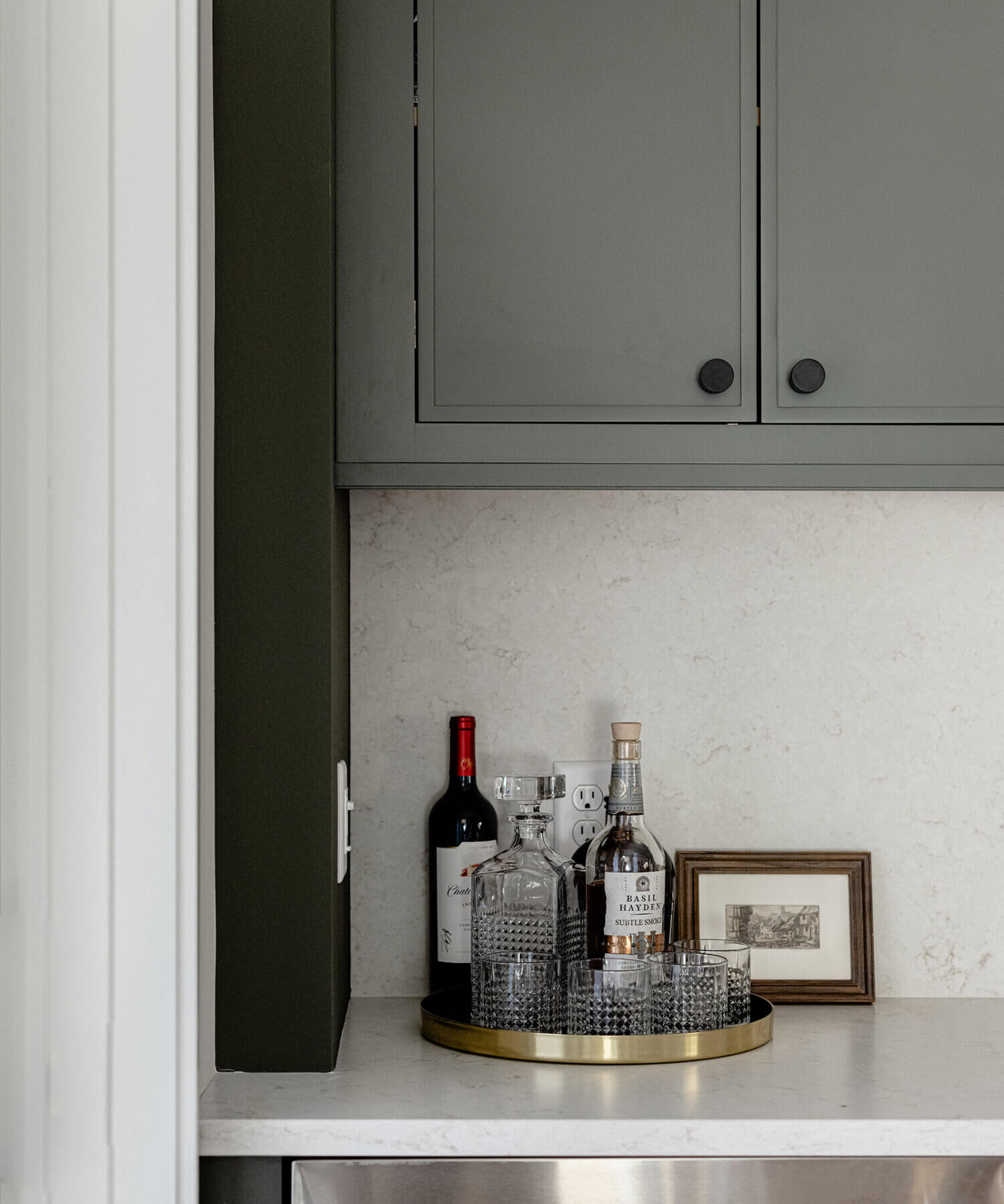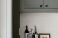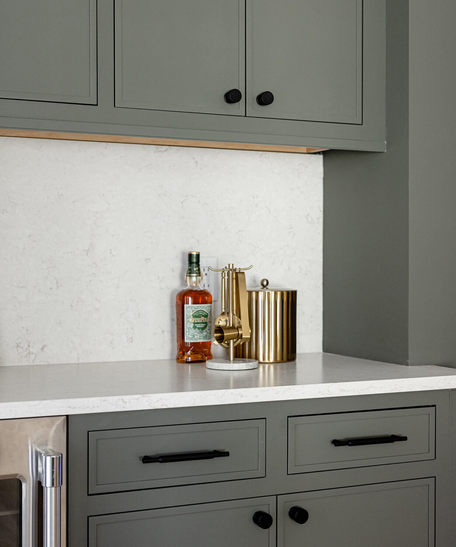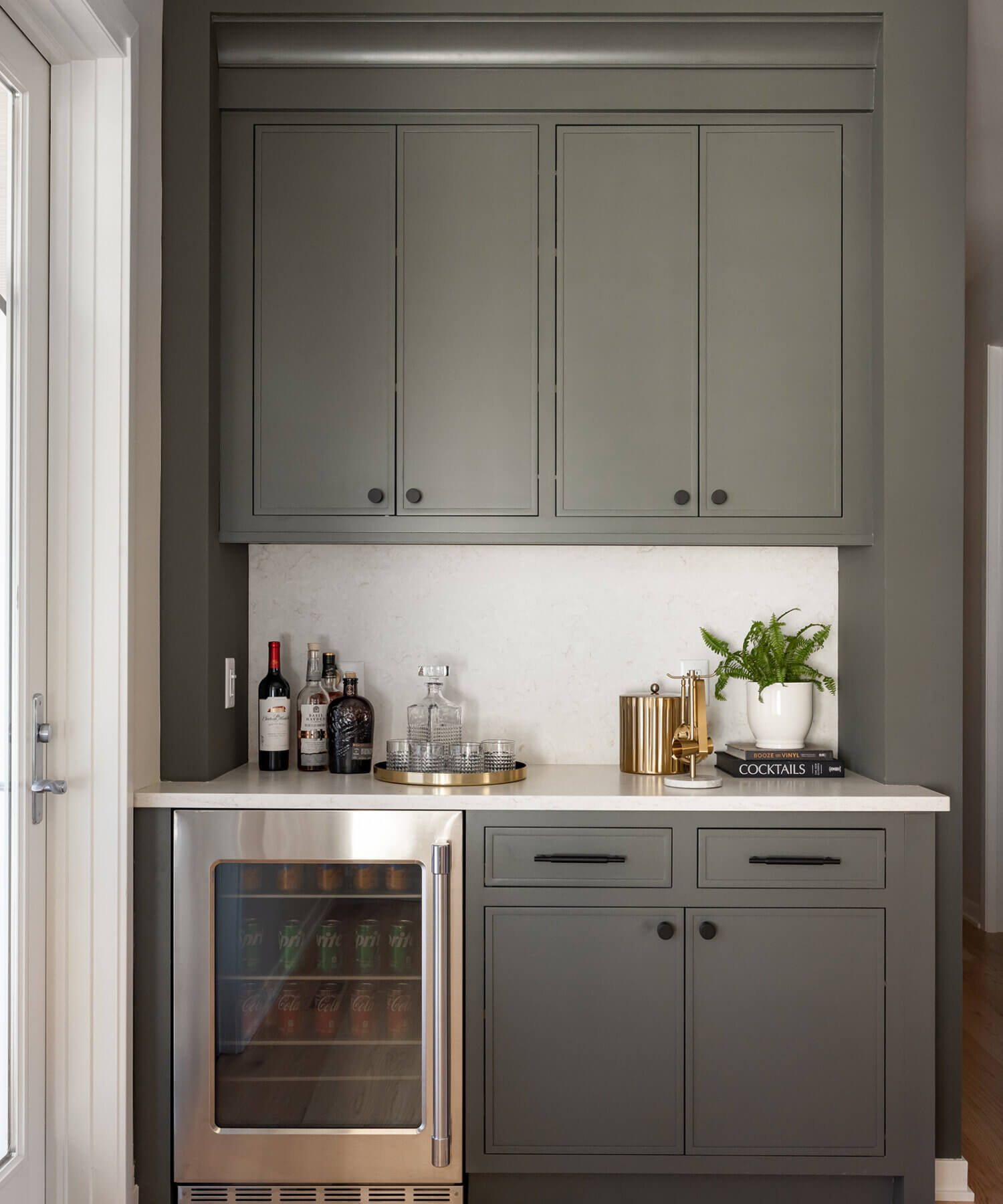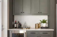 A dedicated beverage station adjacent to the kitchen provides additional storage and entertaining space for the dining area, with cabinets and a fireplace built-in featuring the “Evergreen Fog” paint color also in the Reese door style.