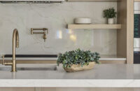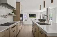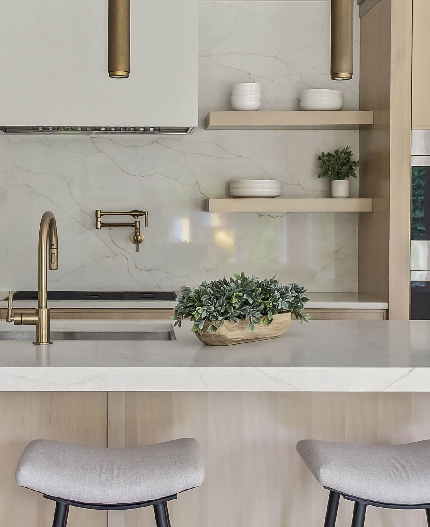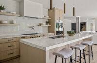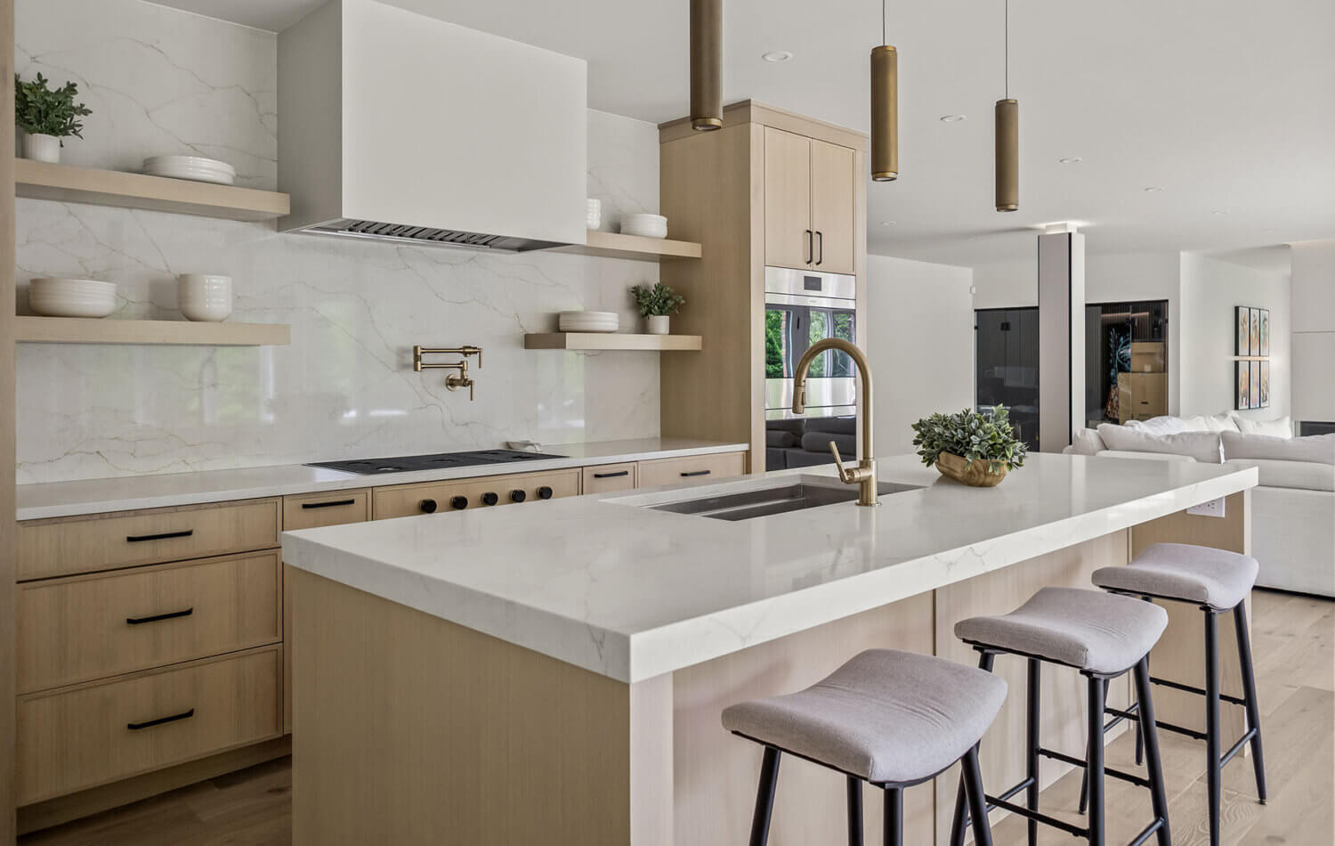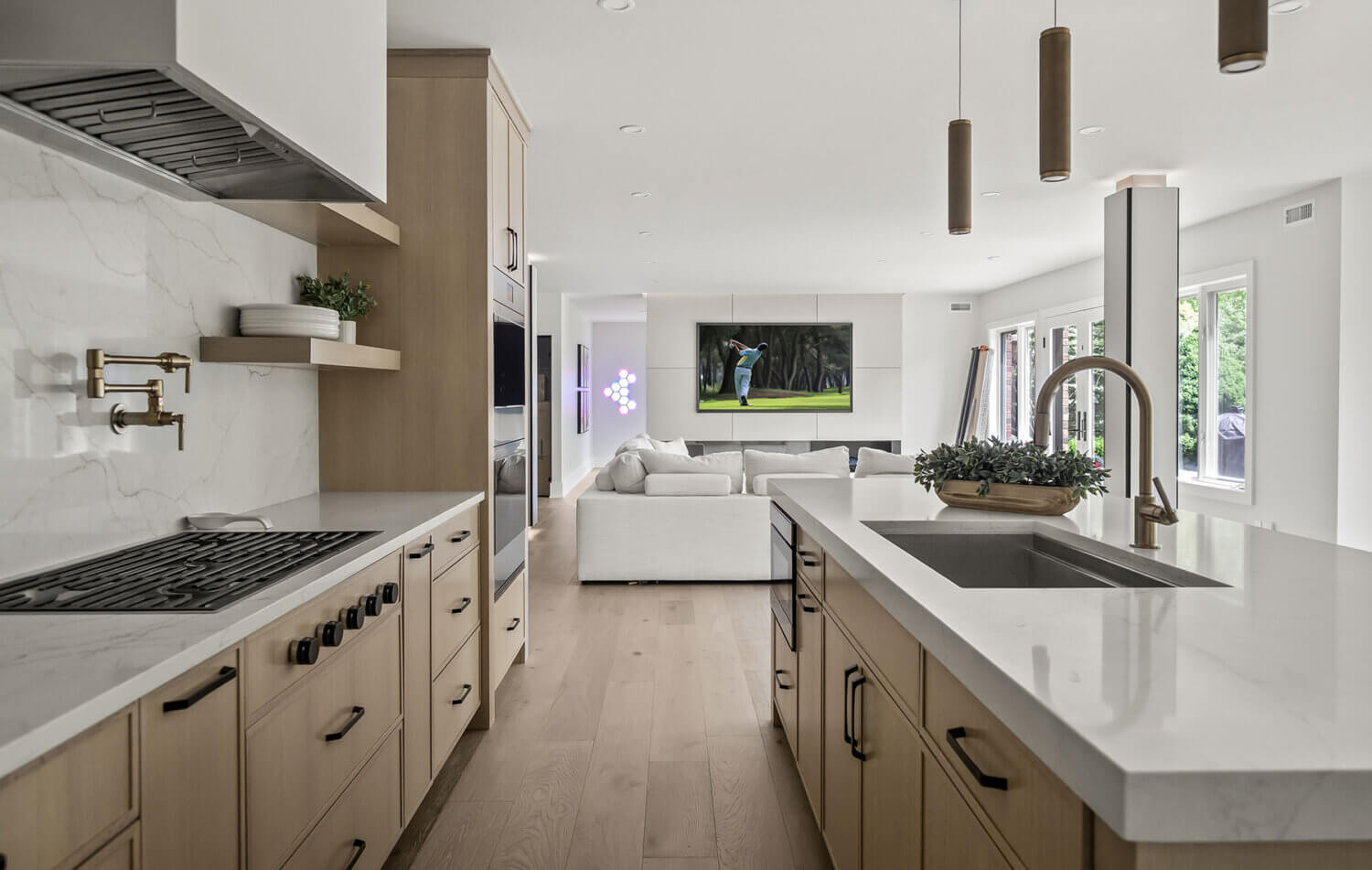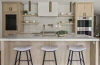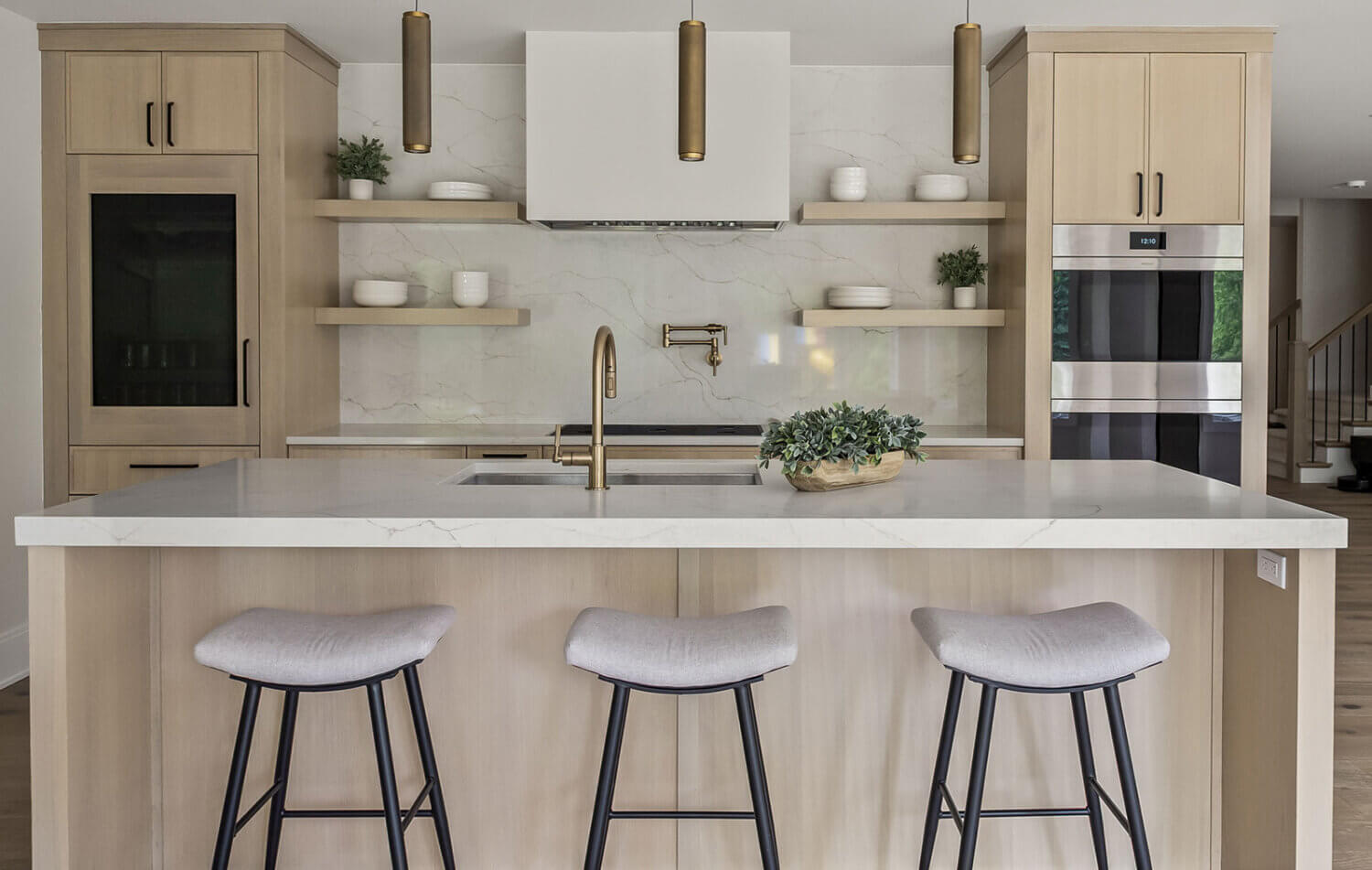 This home was built with hosting in mind! Downstairs, the designer at KSI Kitchens & Baths created a second kitchen designed for entertaining. With clean-lined Quarter-Sawn White Oak cabinetry in the Alabaster stain, integrated appliances, and a palette that feels both modern and relaxed, it is the perfect place for guests to gather. The skinny shaker, Reese door style adds a modern elegance to the space.
