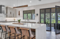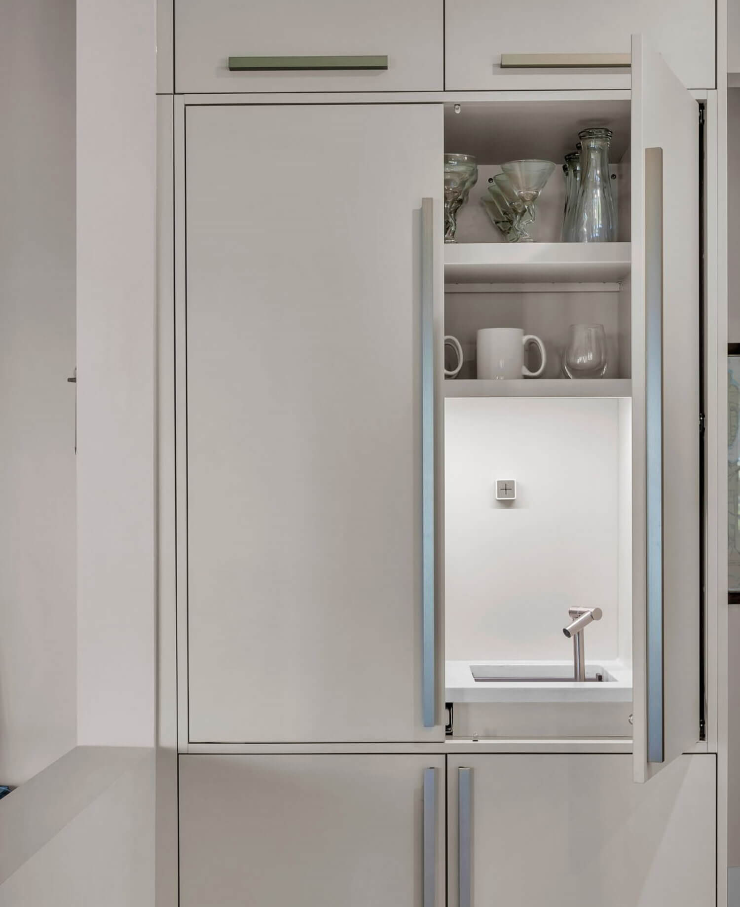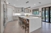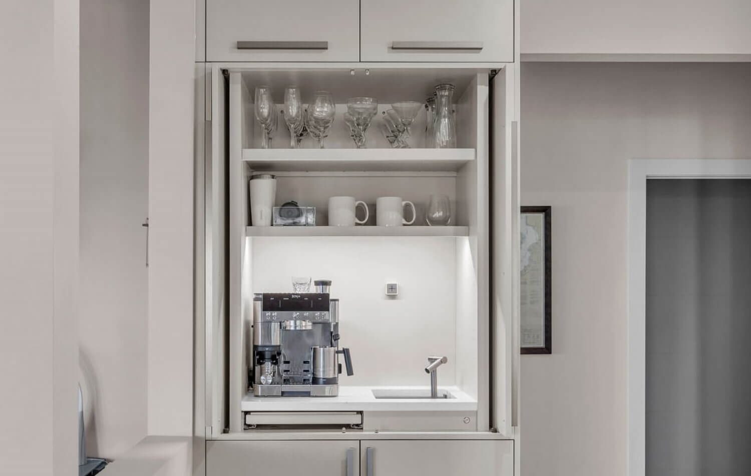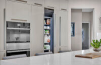 There is also lots of practical storage, for example, there is ample counterspace near the sink that facilitates food preparation, while a lift-up mixer cabinet and paper towel holder drawer above a pull-out trash and recycling bin cabinet streamline the process. A dedicated beverage center cabinet is another thoughtfully planned storage space located just to the side of the main work area. This placement and design provides a convenient space for others in the household to prepare a drink while not interrupting the flow of the chef in the kitchen.