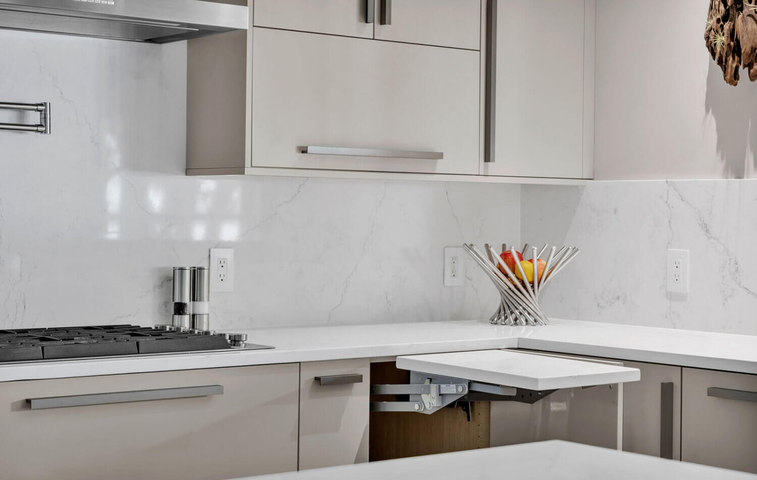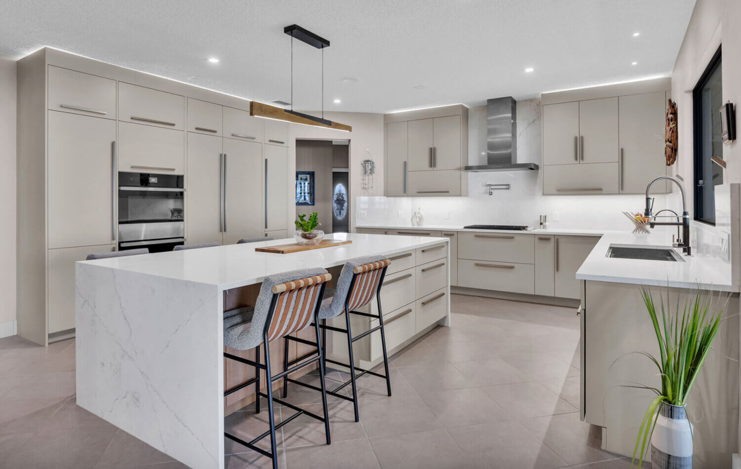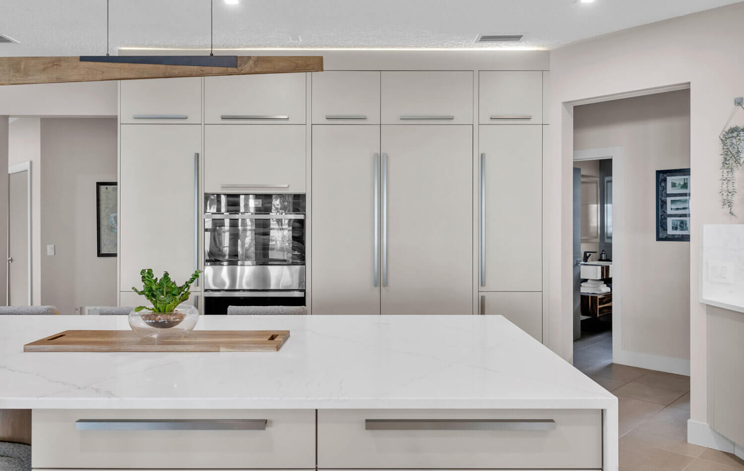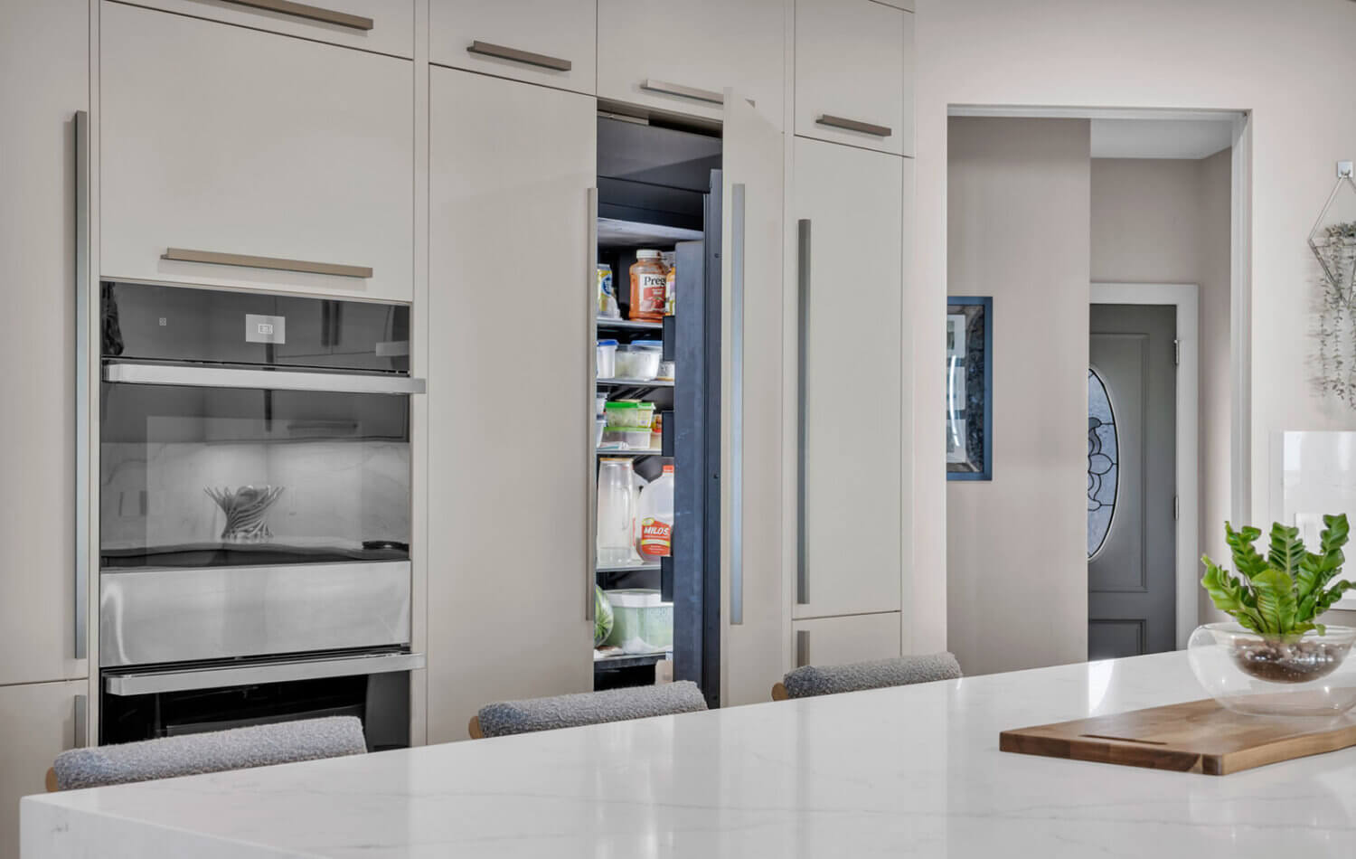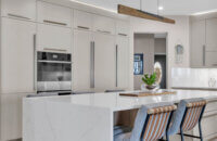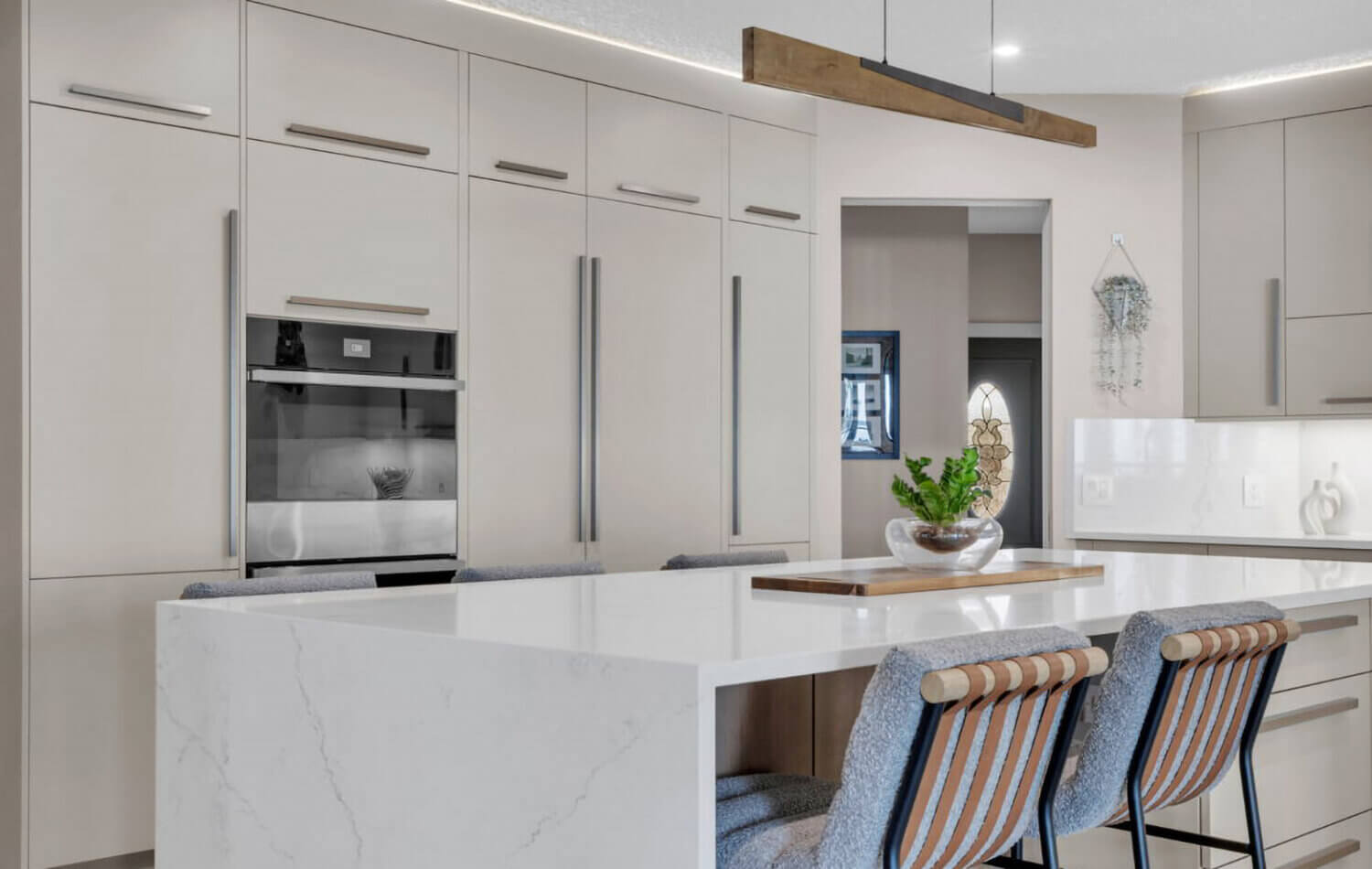 This kitchen is a masterful blend of modern aesthetics and cutting-edge functionality. The U-shaped layout showcases the Chroma slab door style in a sophisticated, off-white “Canvas” paint color, complemented by accents of the Moda Vertical door style in “Coriander” stain on Cherry wood. The thoughtful design ensures a seamless, optimized workflow throughout the kitchen, making meal prep and cleanup efficient.