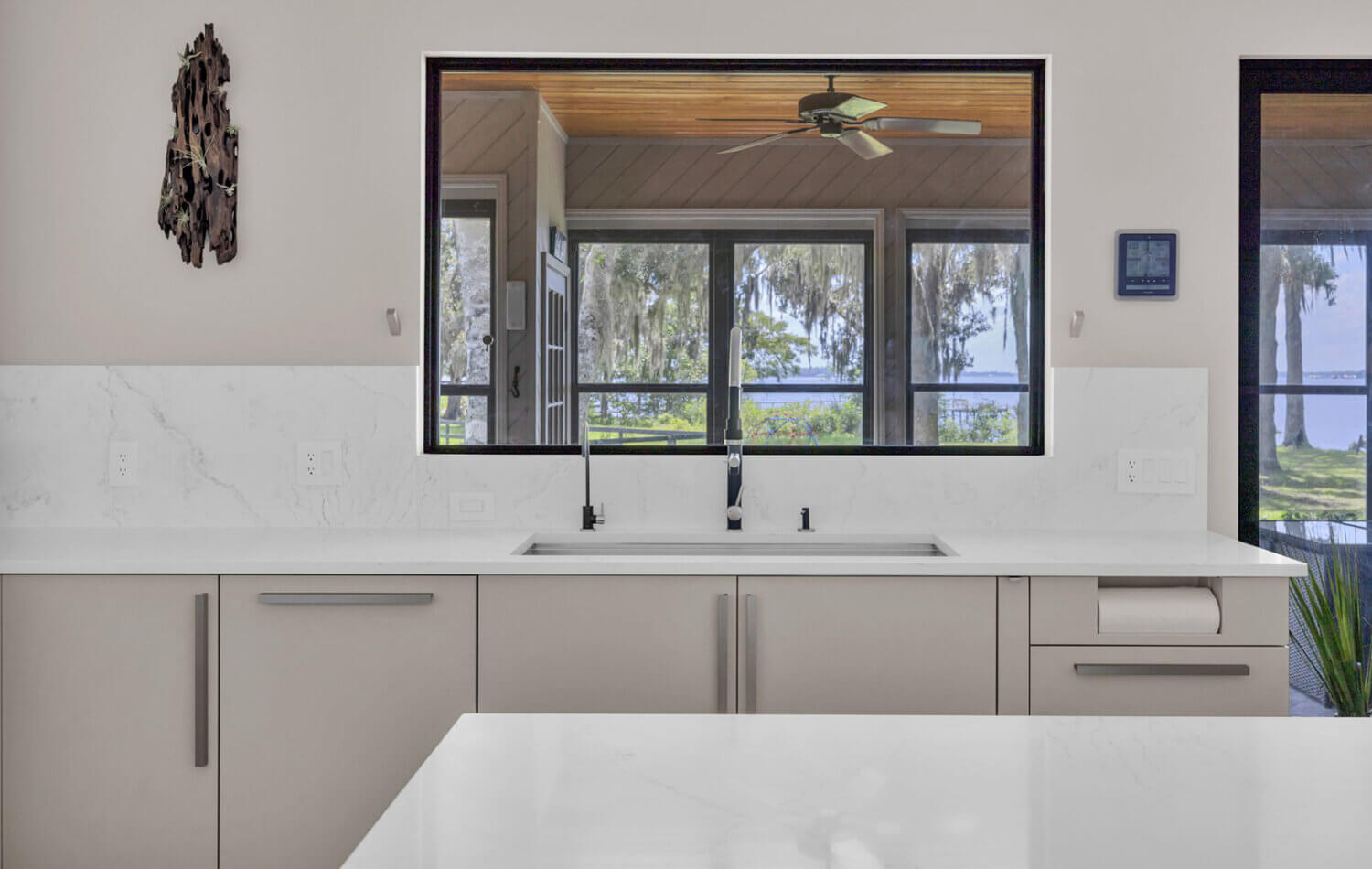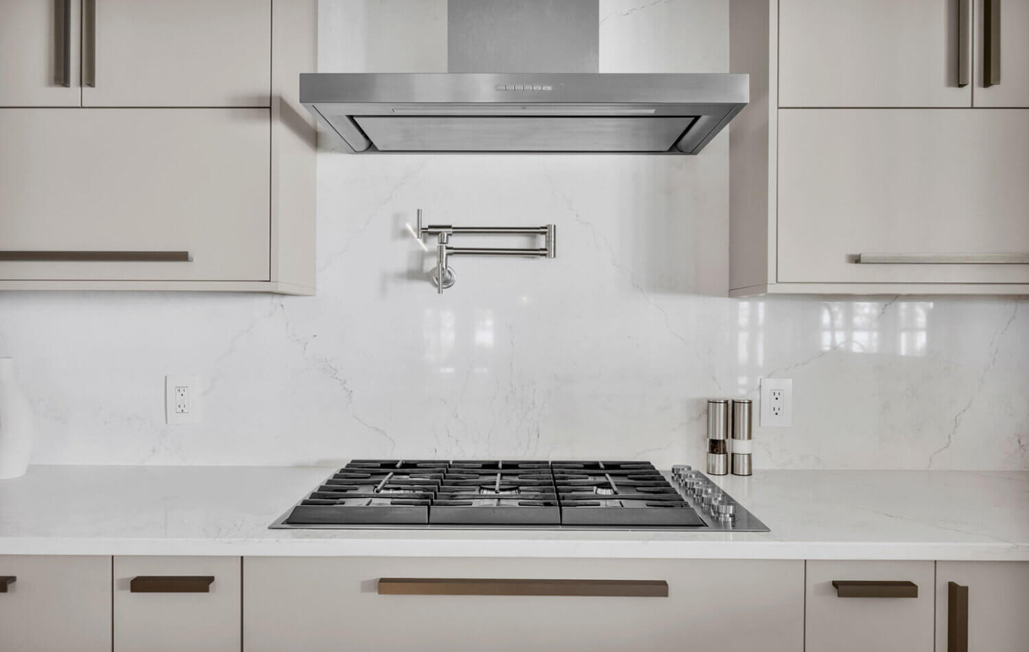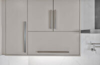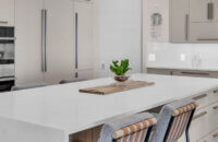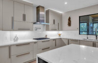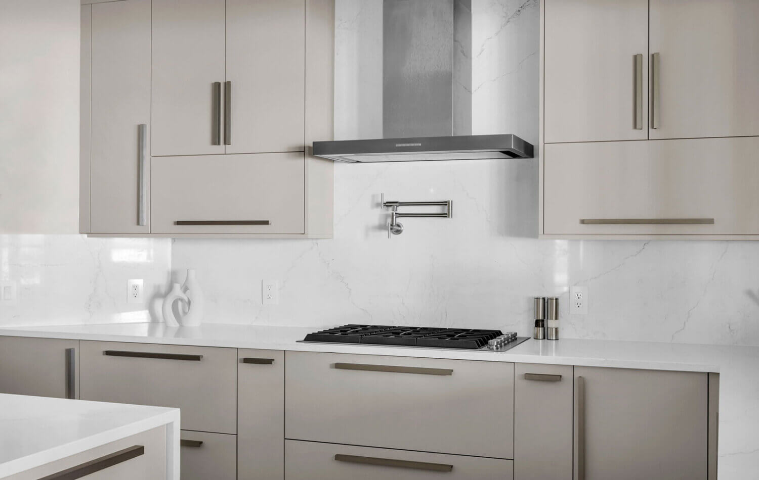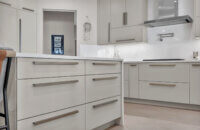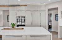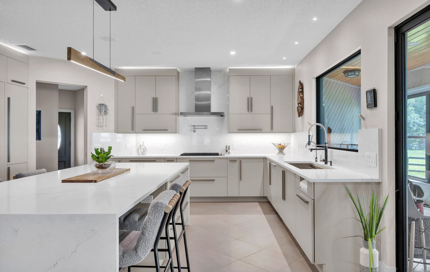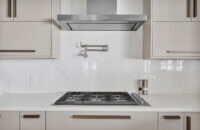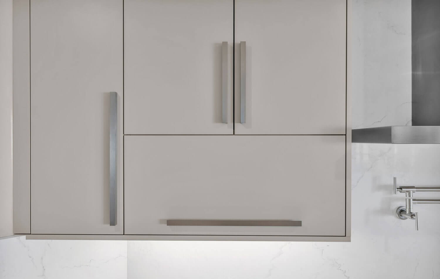 This kitchen is a masterful blend of modern aesthetics and cutting-edge functionality. The U-shaped layout showcases the Chroma slab door style in a sophisticated, off-white “Canvas” paint color, complemented by accents of the Moda Vertical door style in “Coriander” stain on Cherry wood. The thoughtful design ensures a seamless, optimized workflow throughout the kitchen, making meal prep and cleanup efficient.