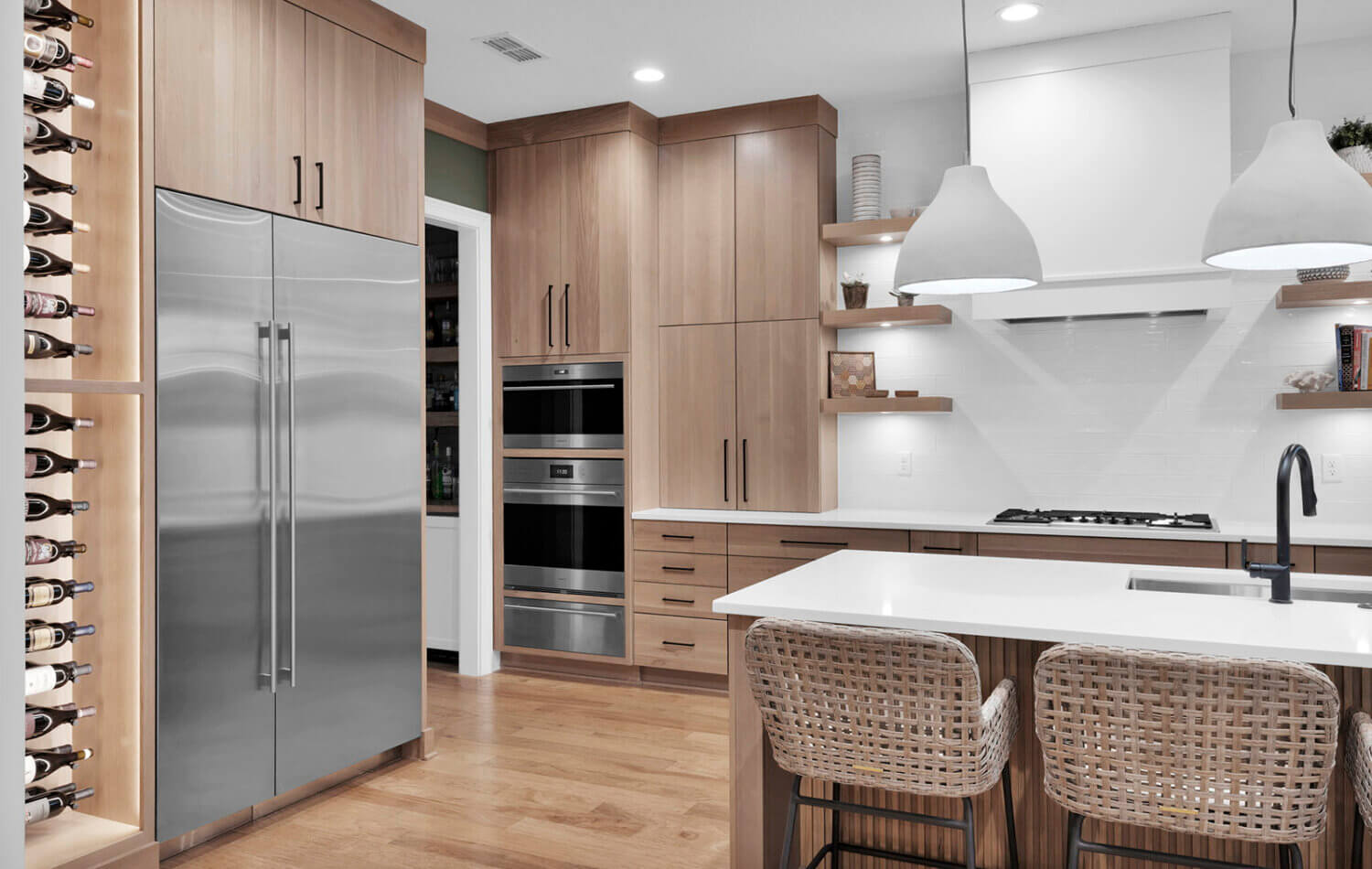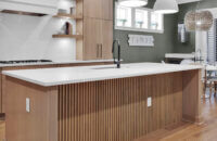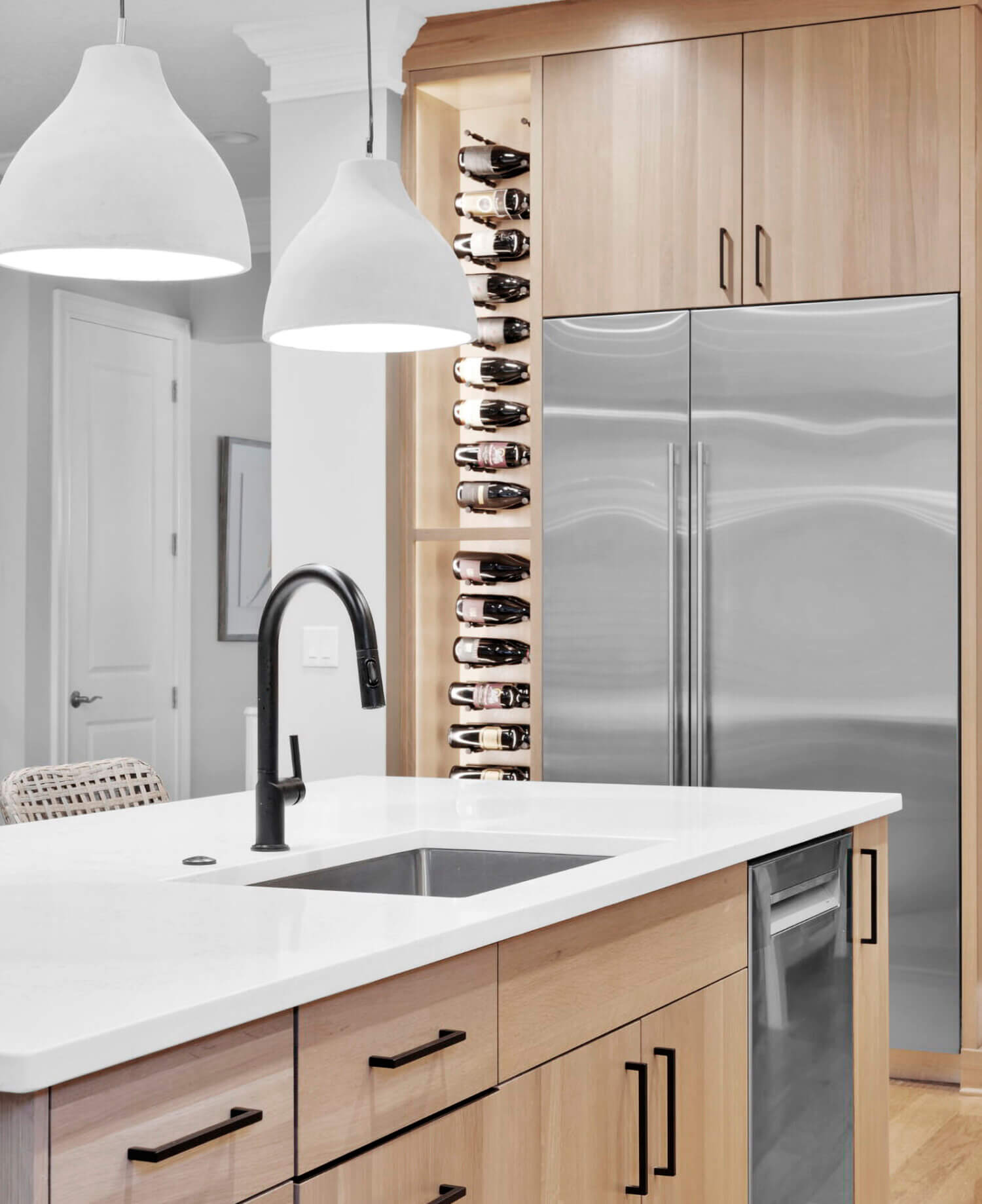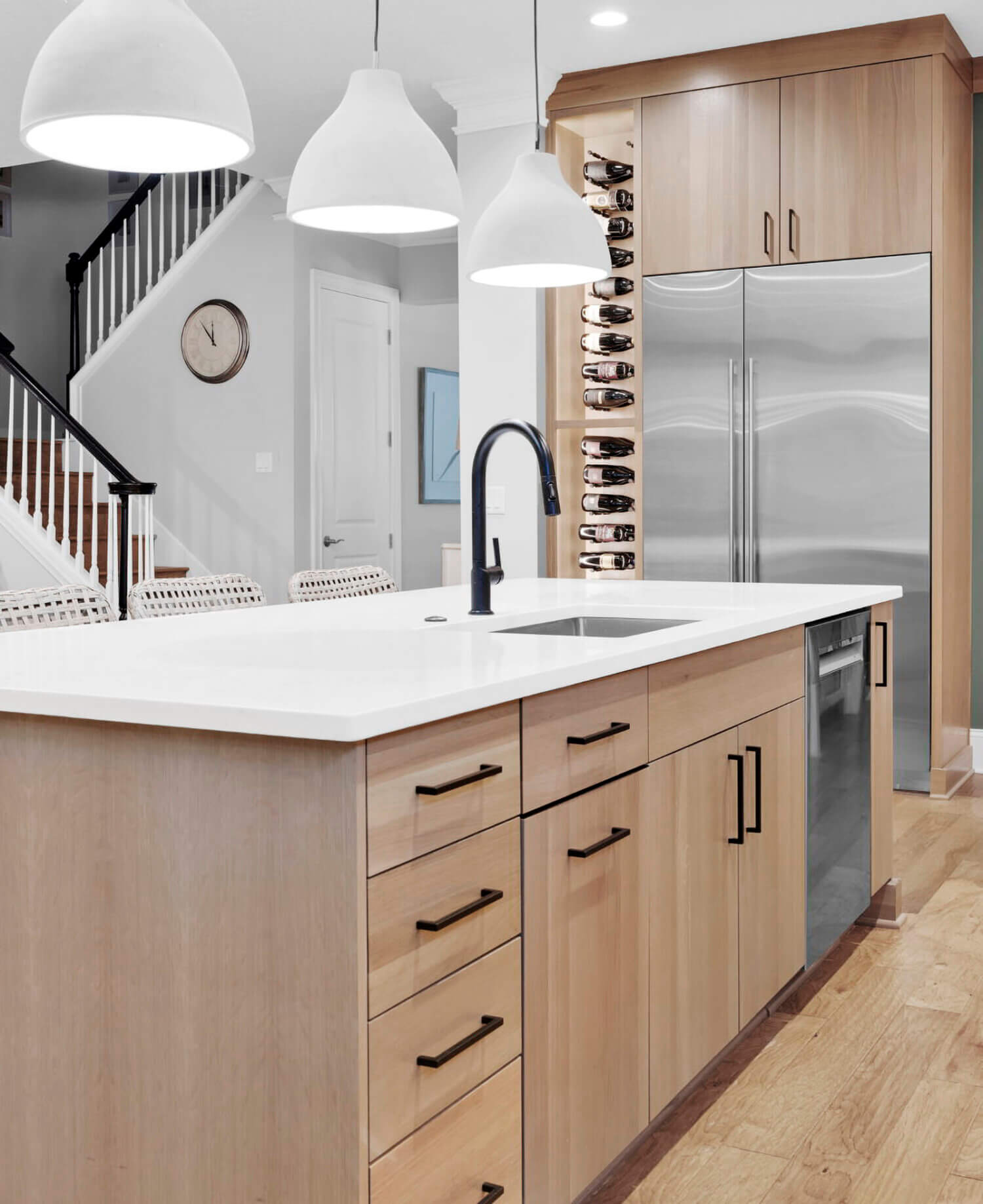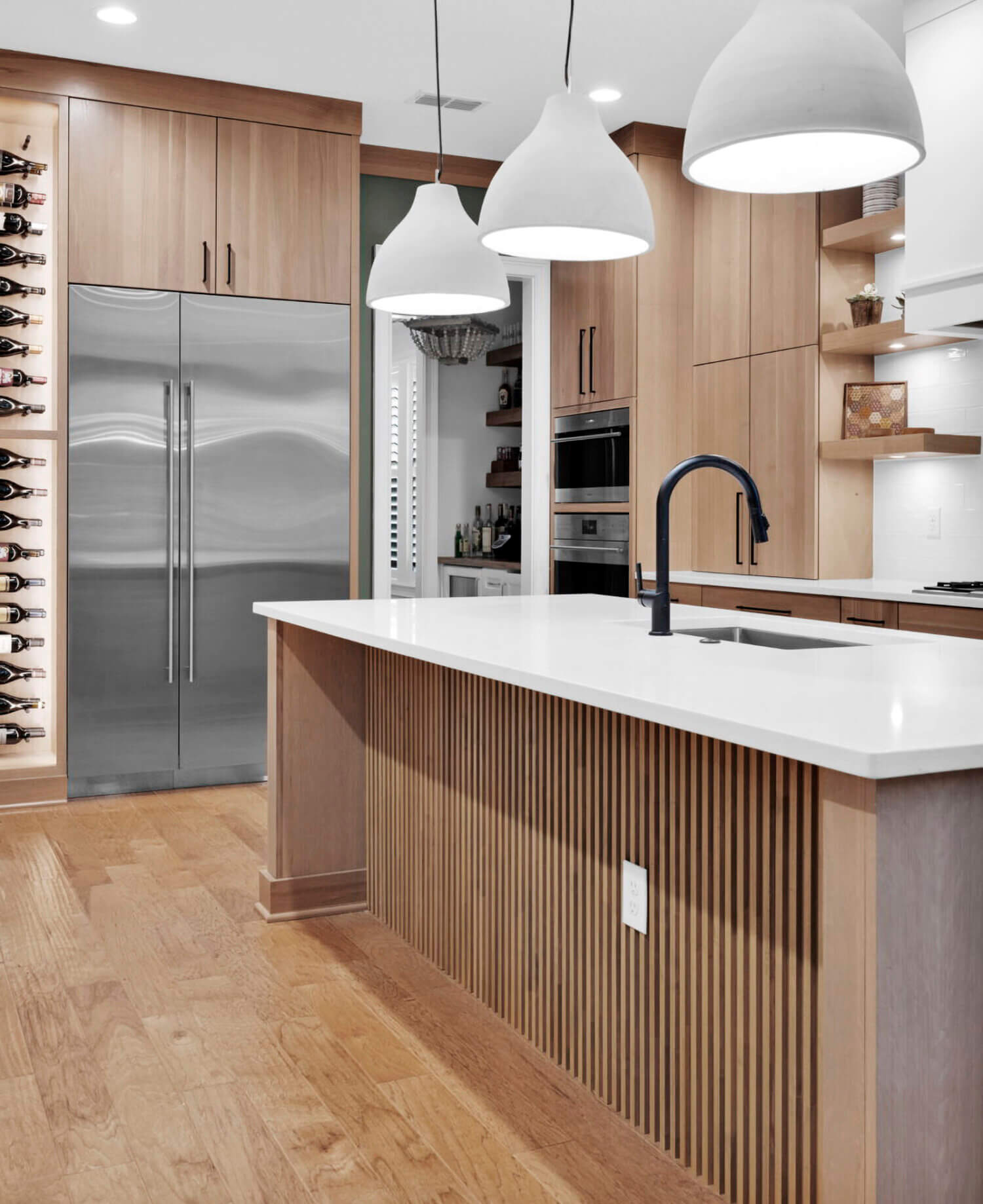 Sleek lines, warm wood tones, and a dash of sophistication. This kitchen’s Quarter-Sawn White Oak cabinets add the perfect combination of raw and natural textures to the room. This design uses Dura Supreme Cabinetry’s Camden door style in the “Coriander” stain on Quarter-Sawn White Oak.