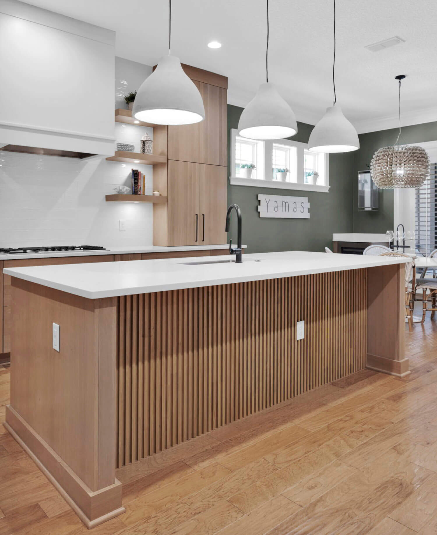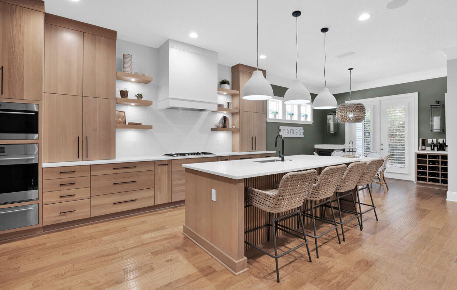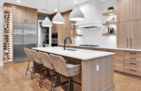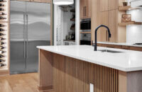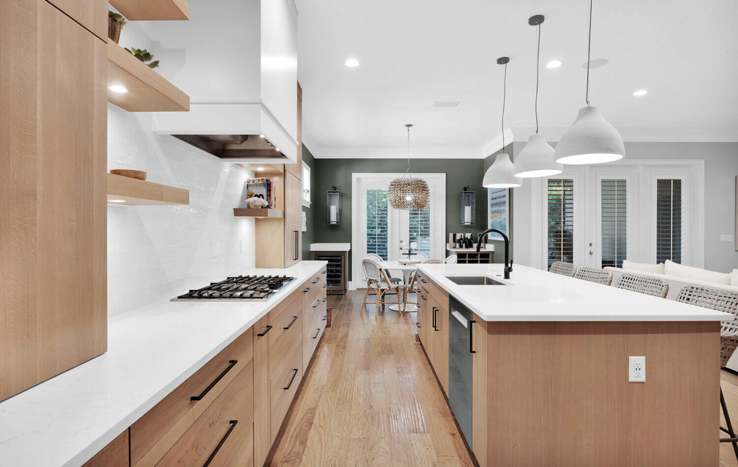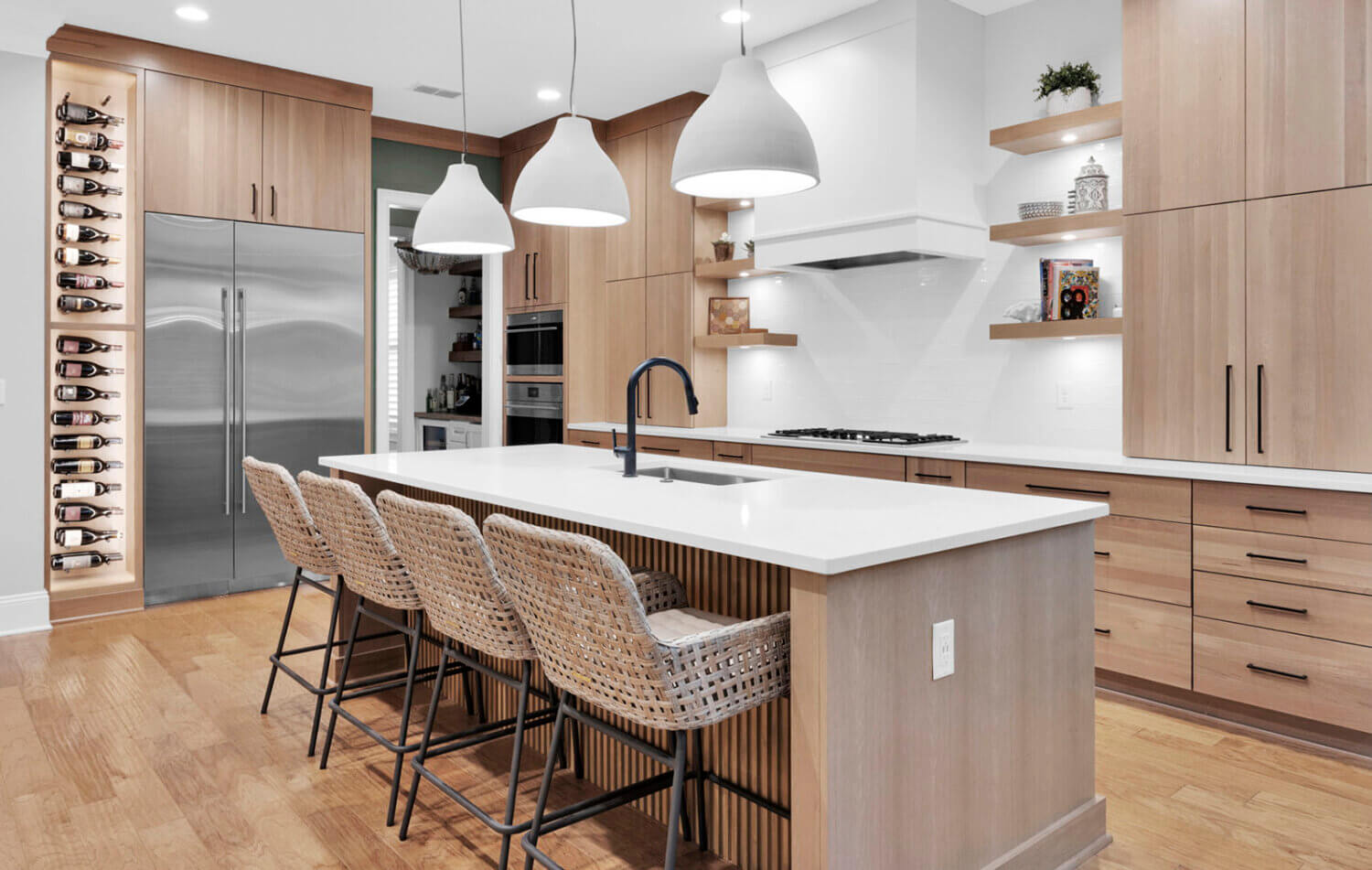 Sleek lines, warm wood tones, and a dash of sophistication. This kitchen’s Quarter-Sawn White Oak cabinets add the perfect combination of raw and natural textures to the room. This design uses Dura Supreme Cabinetry’s Camden door style in the “Coriander” stain on Quarter-Sawn White Oak.