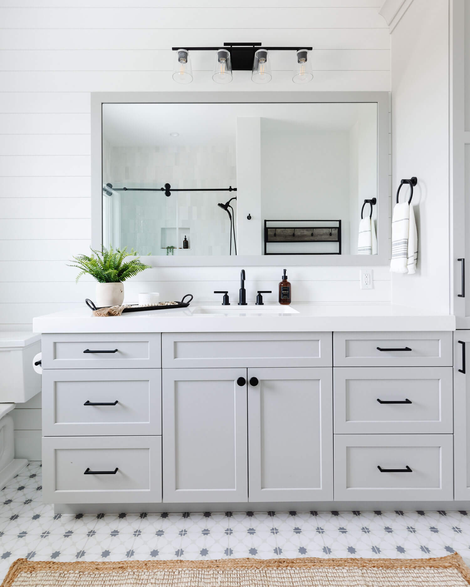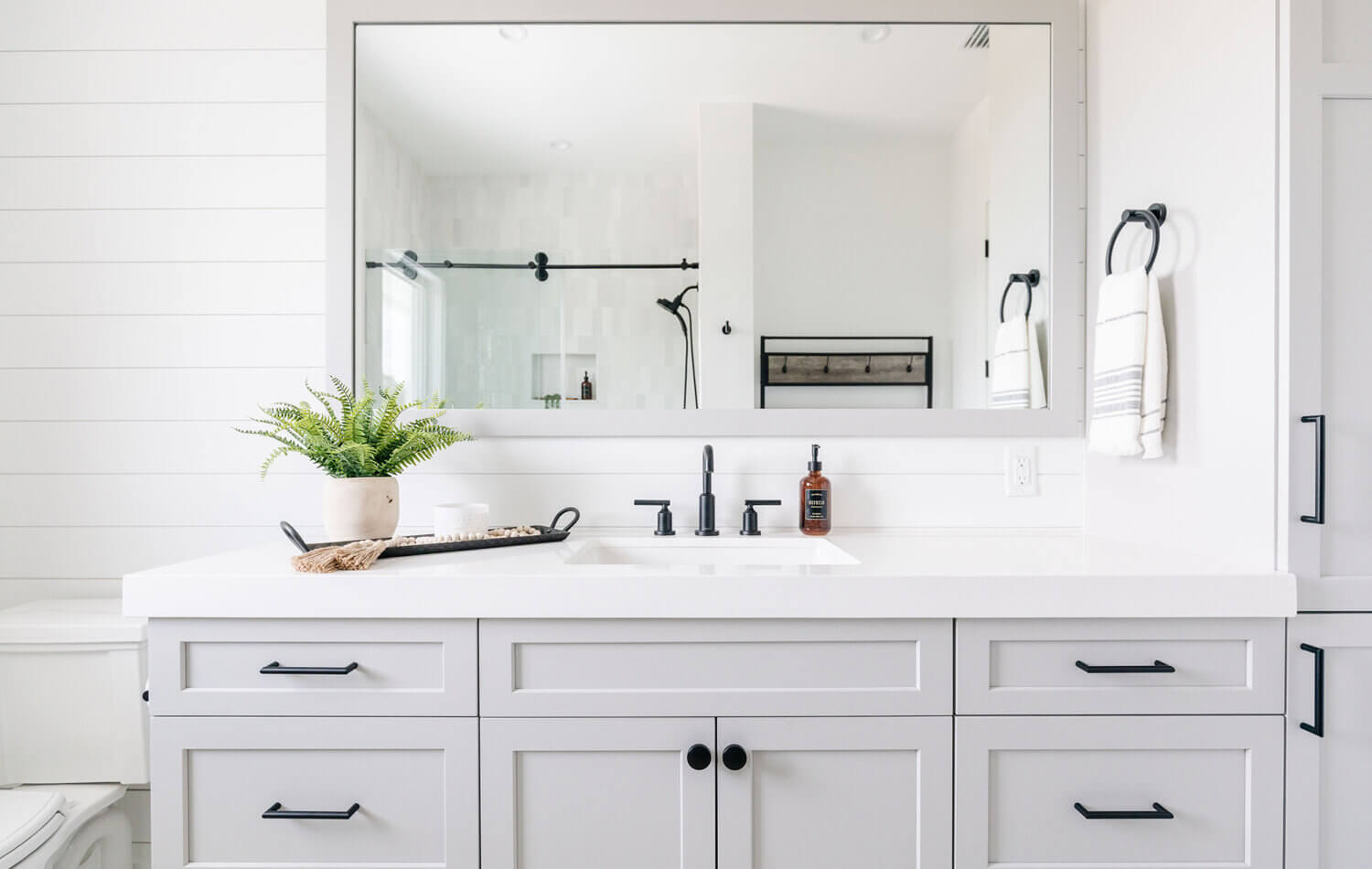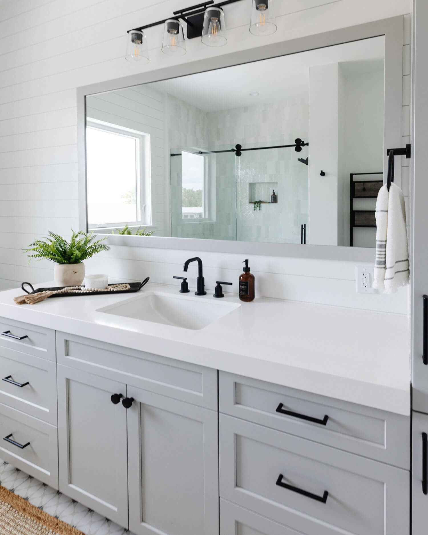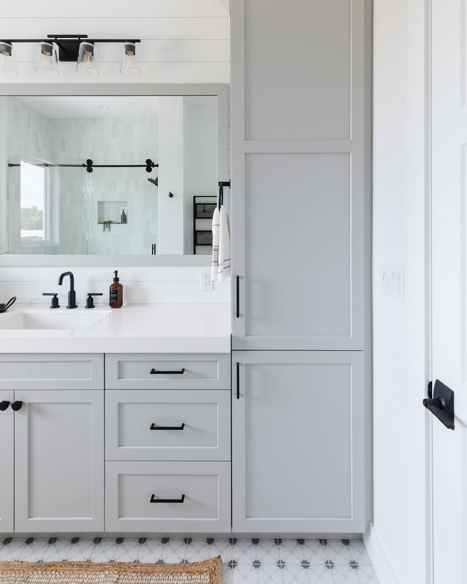 The modern farmhouse bathroom features Dura Supreme’s “Pearl” paint finish on the Hudson door style, which is contrasted by bright white finishes with black accents.