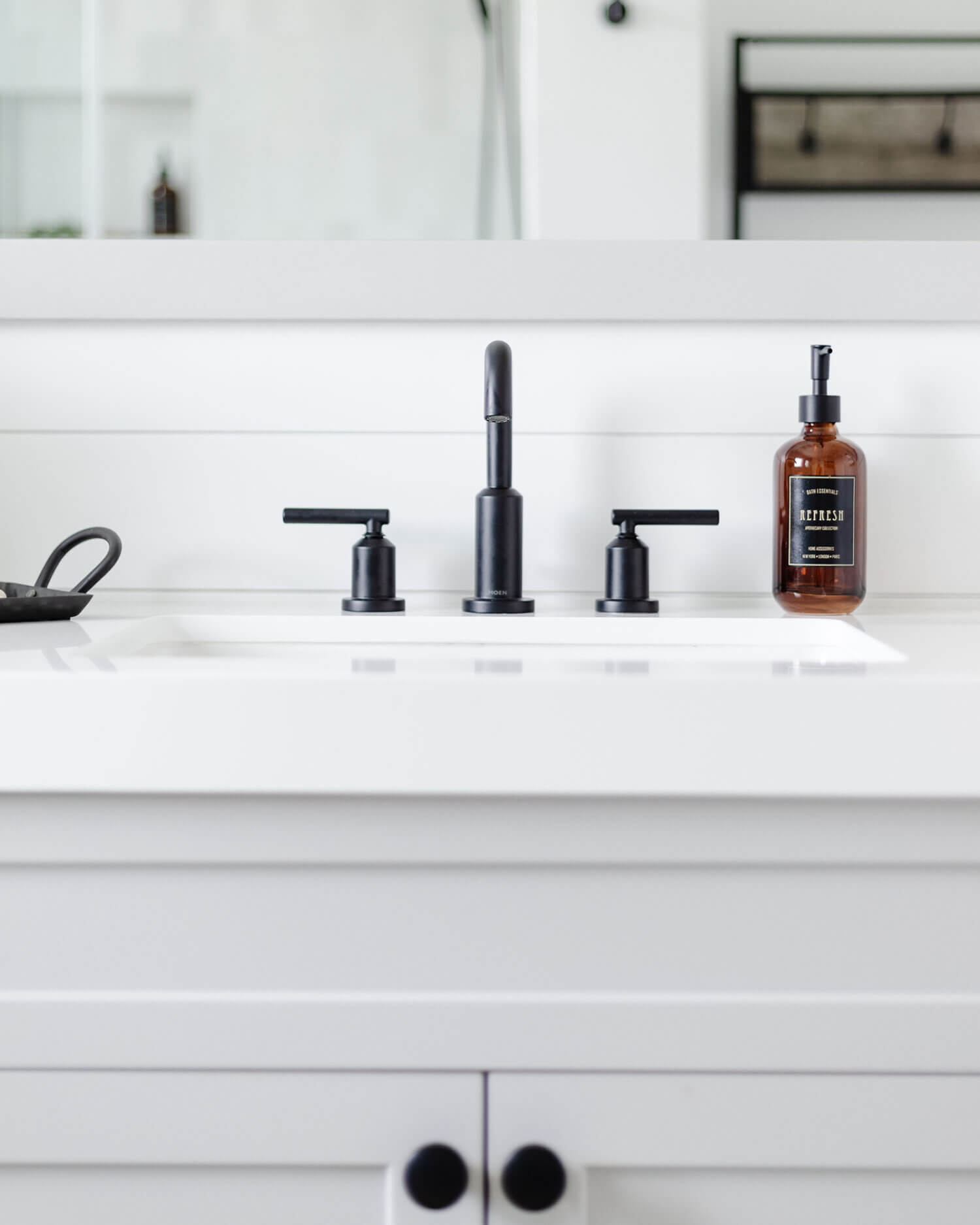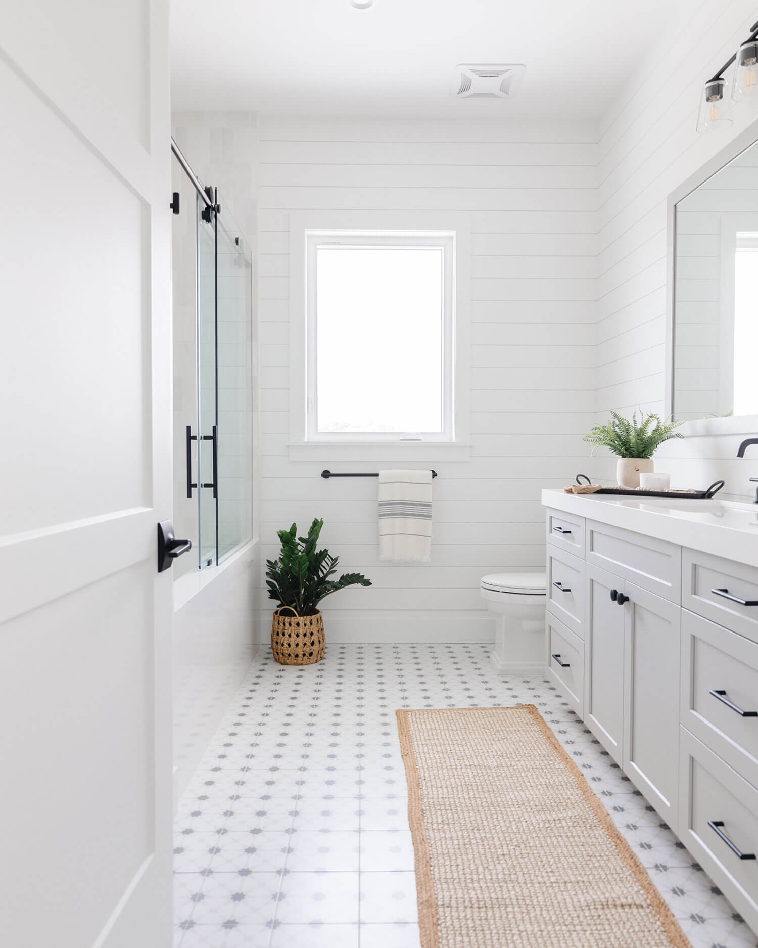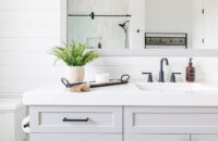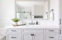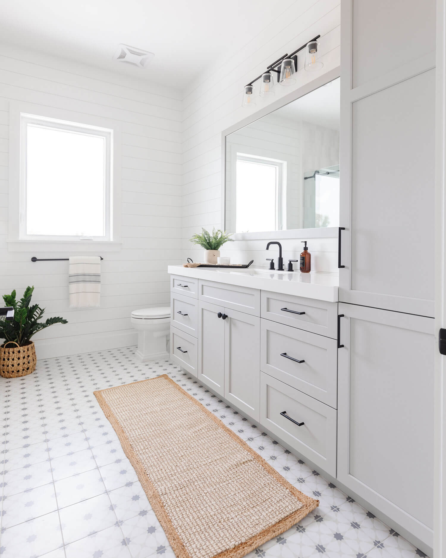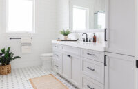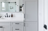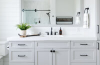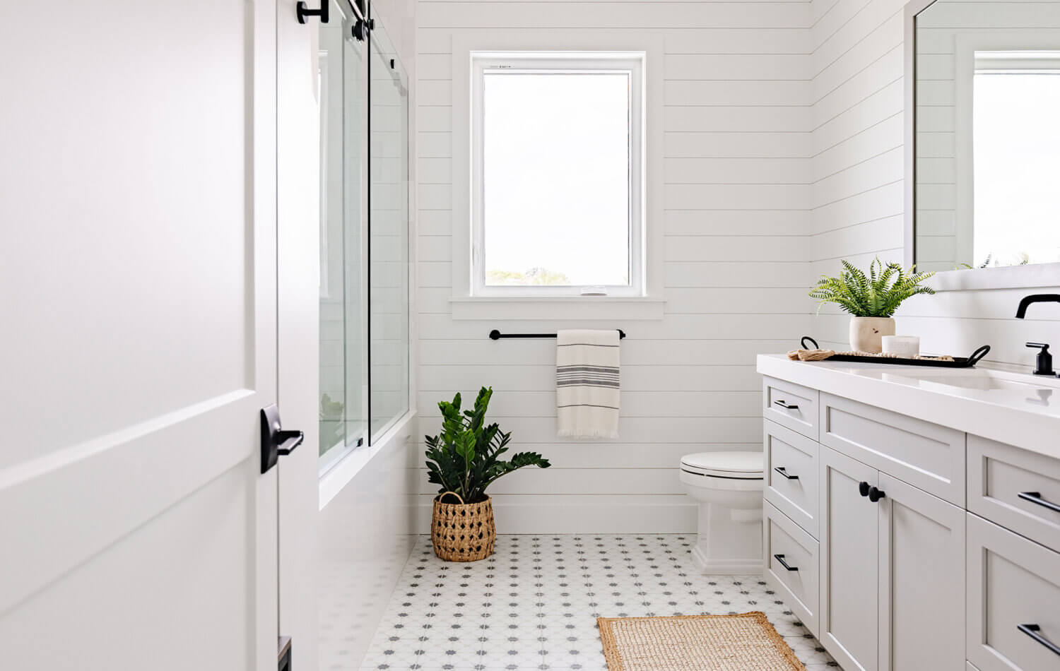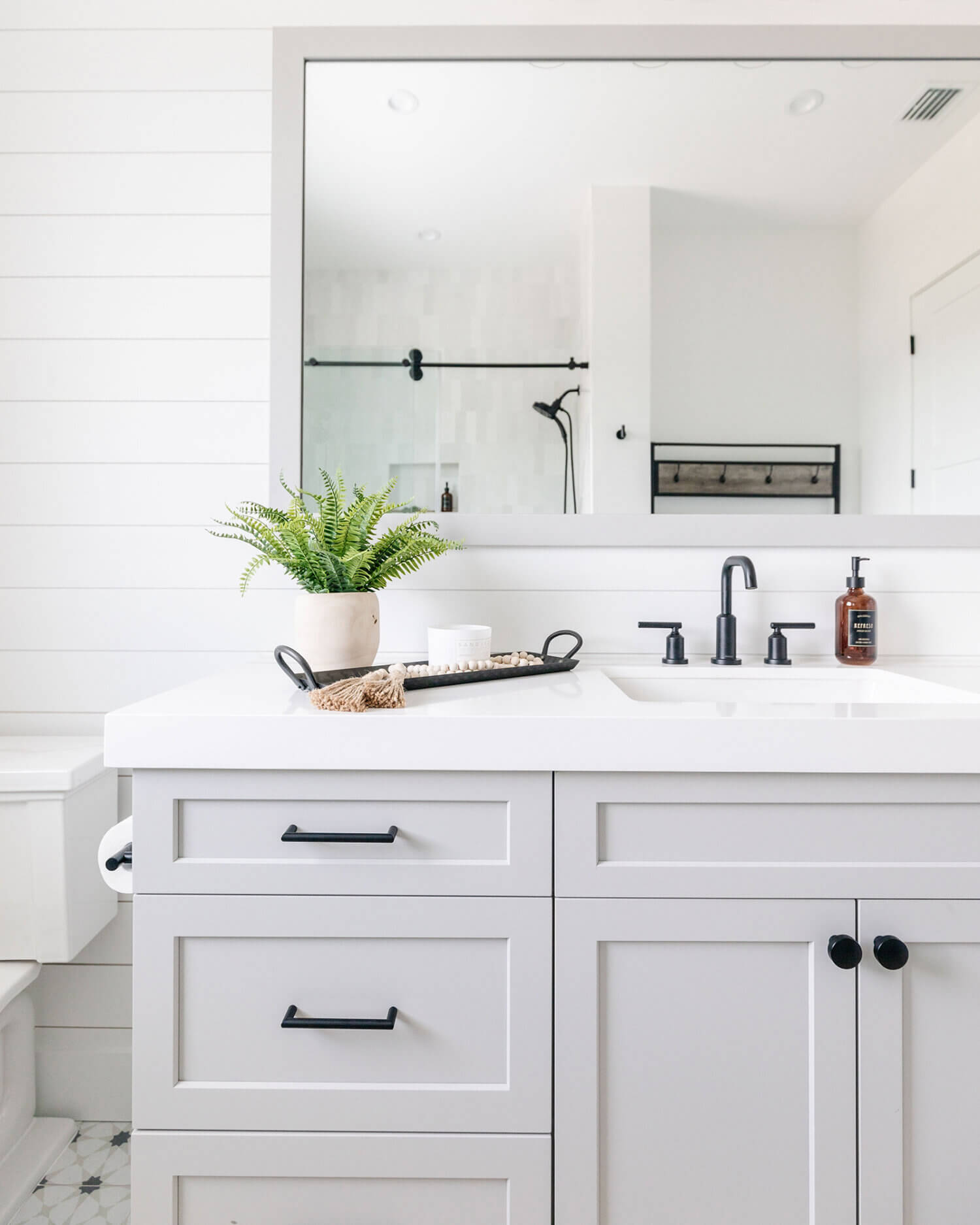 The modern farmhouse bathroom features Dura Supreme’s “Pearl” paint finish on the Hudson door style, which is contrasted by bright white finishes with black accents.