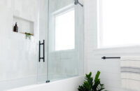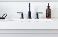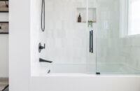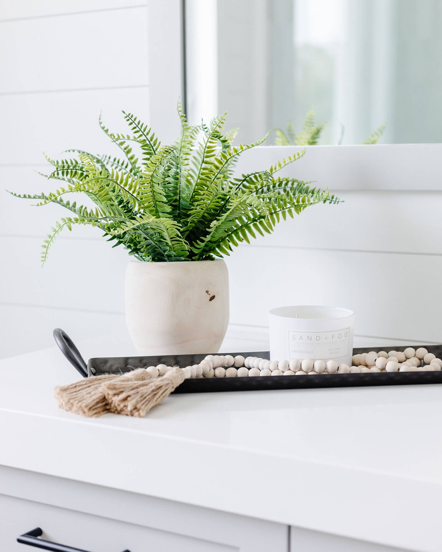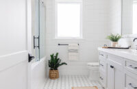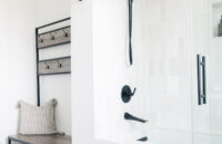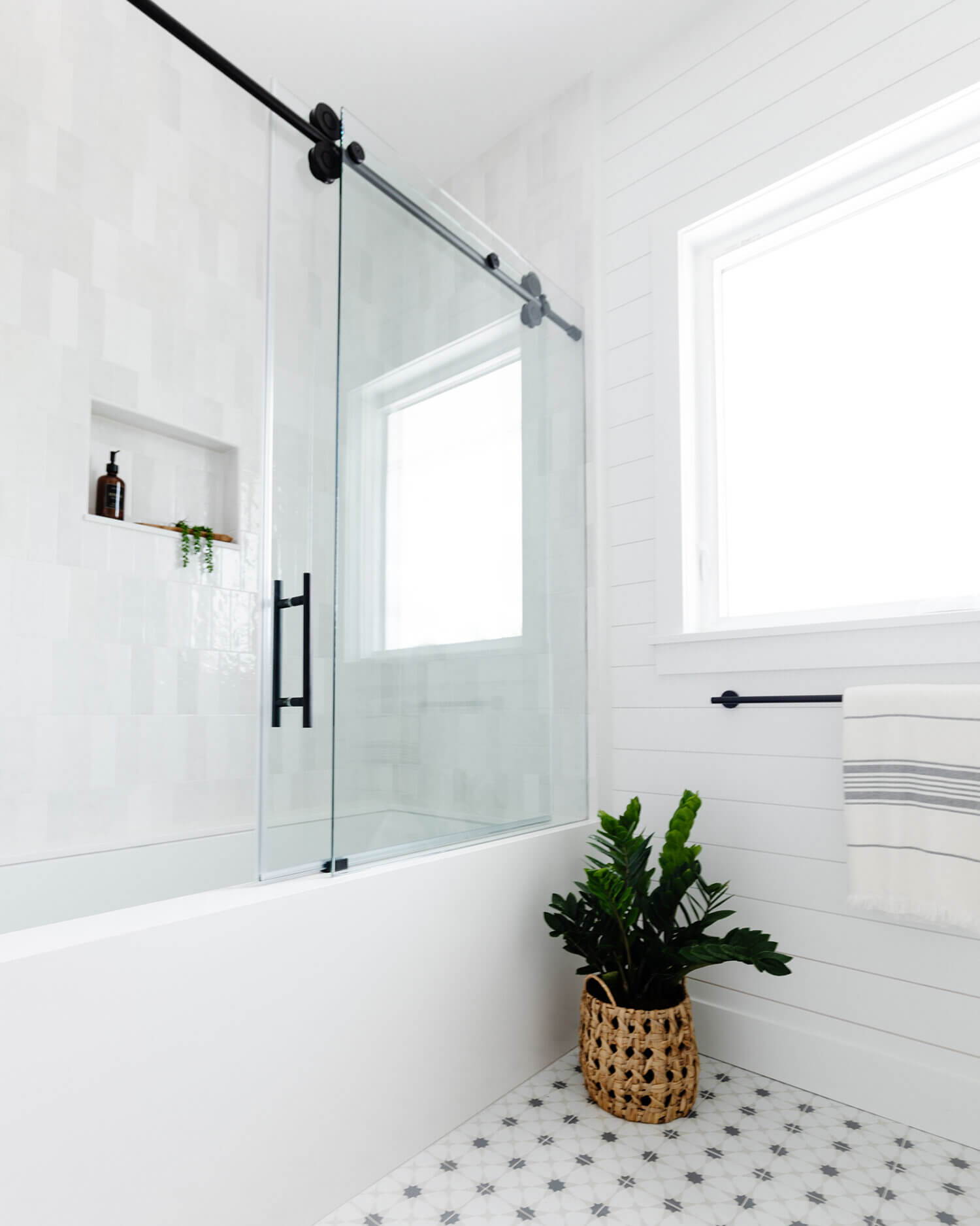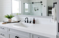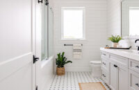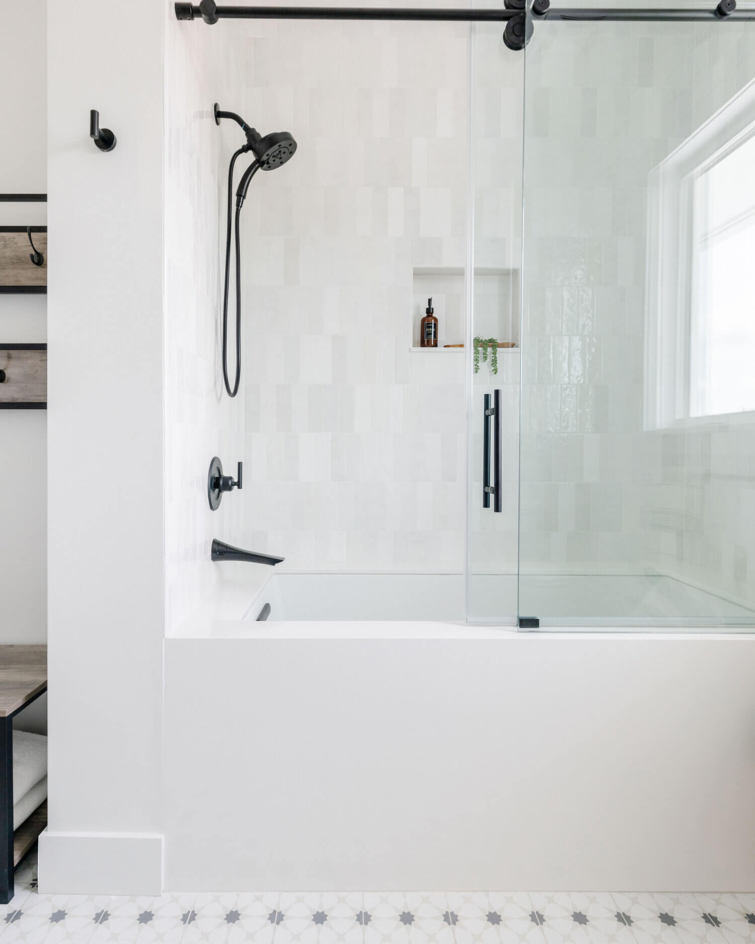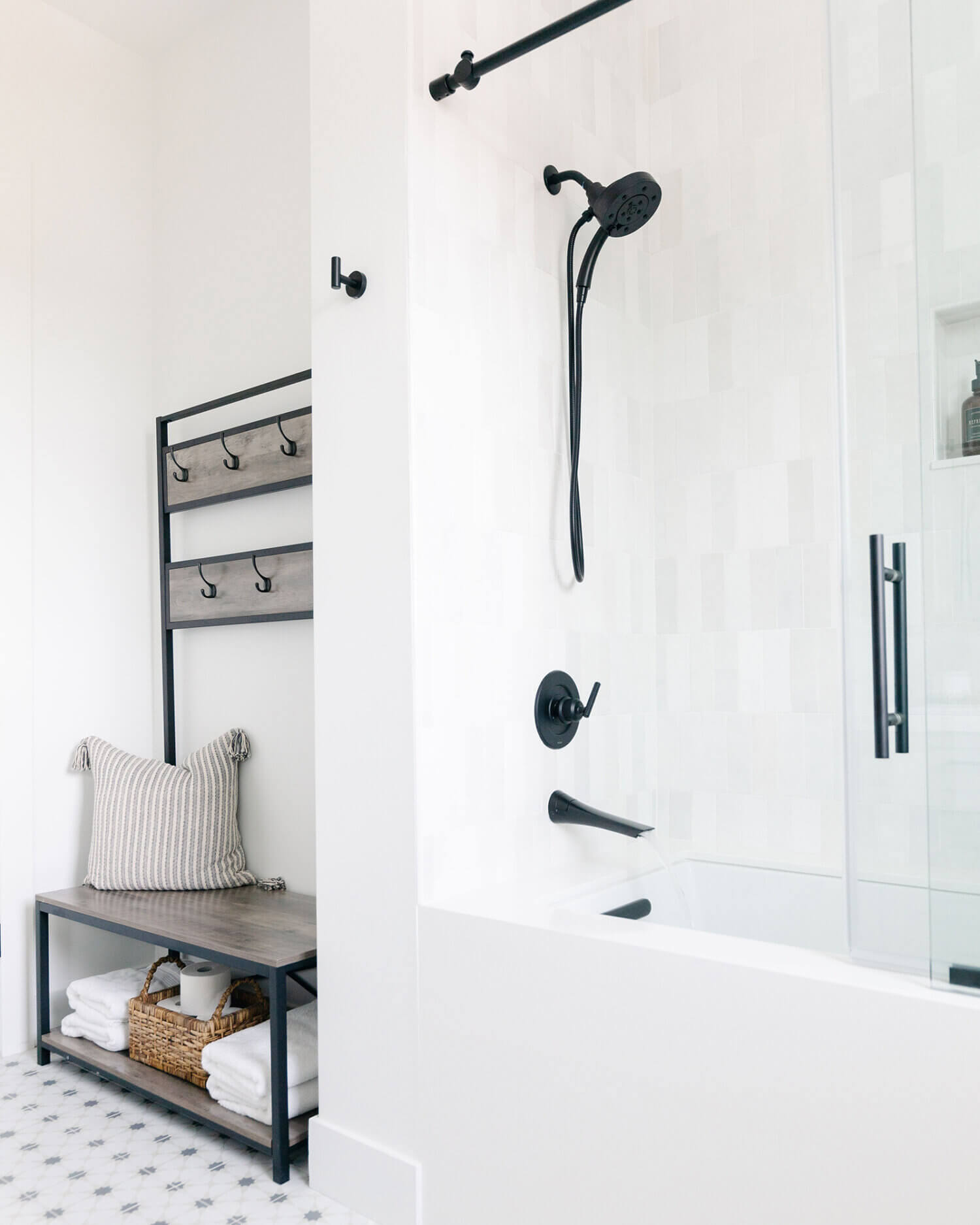 The modern farmhouse bathroom features Dura Supreme’s “Pearl” paint finish on the Hudson door style, which is contrasted by bright white finishes with black accents.