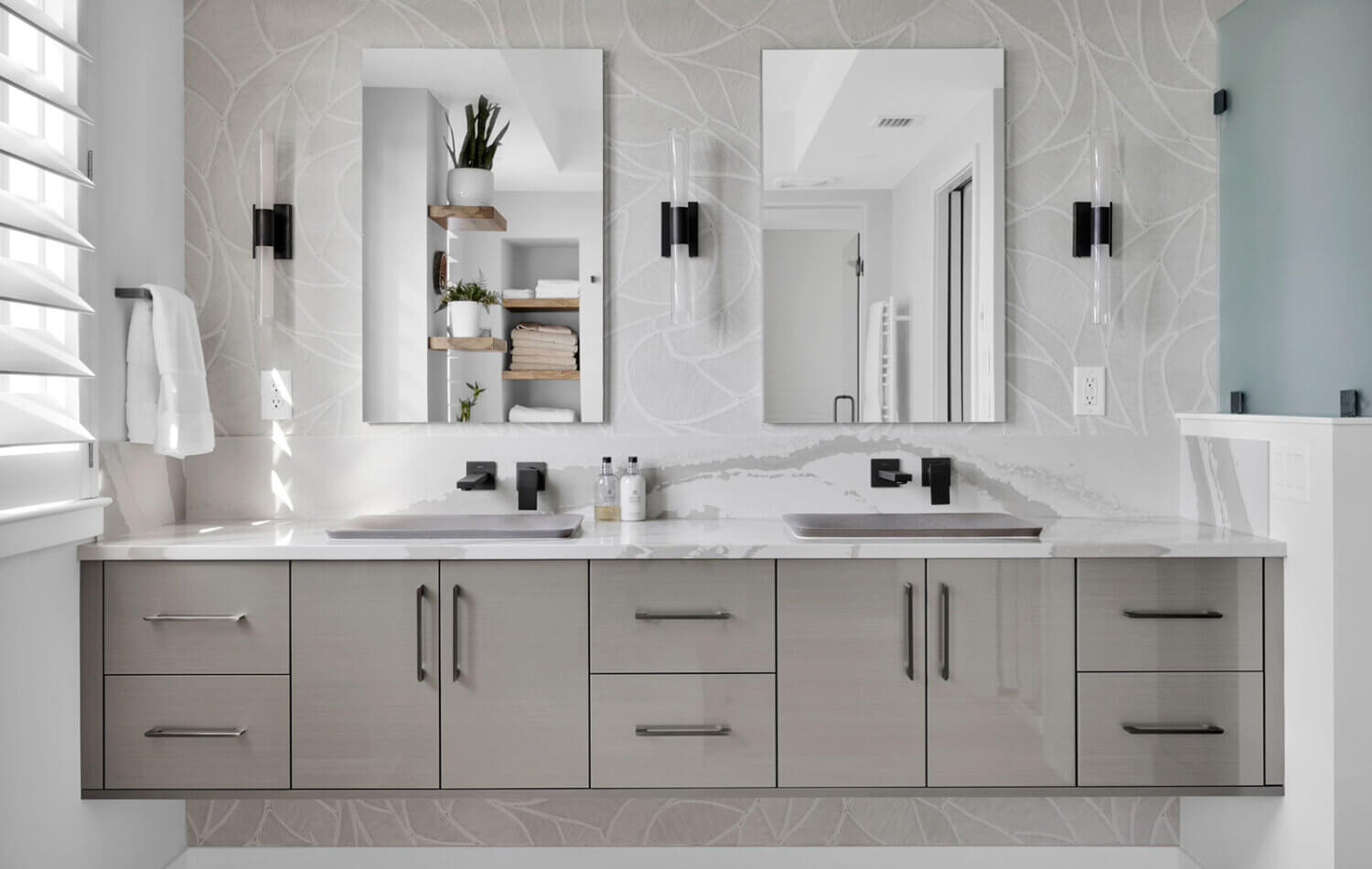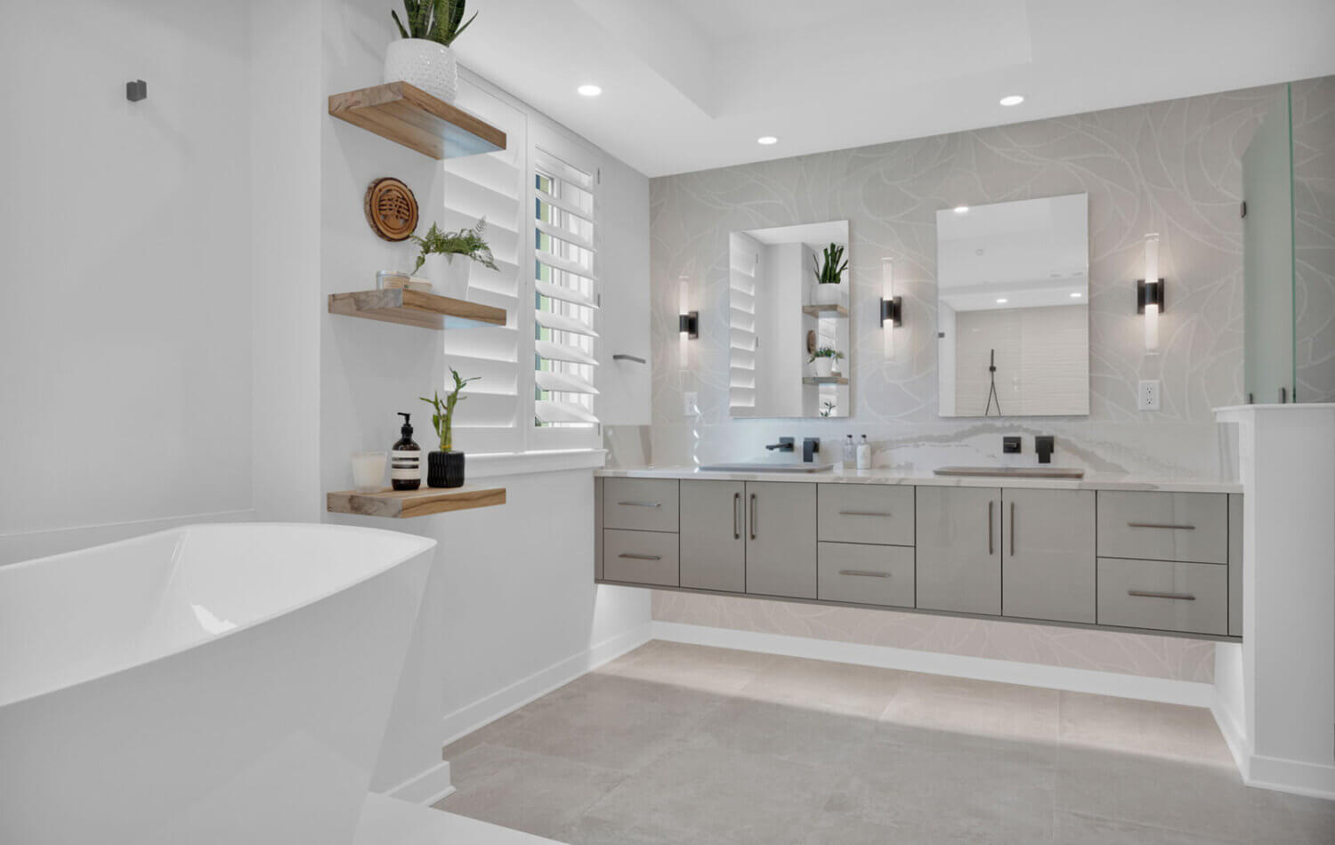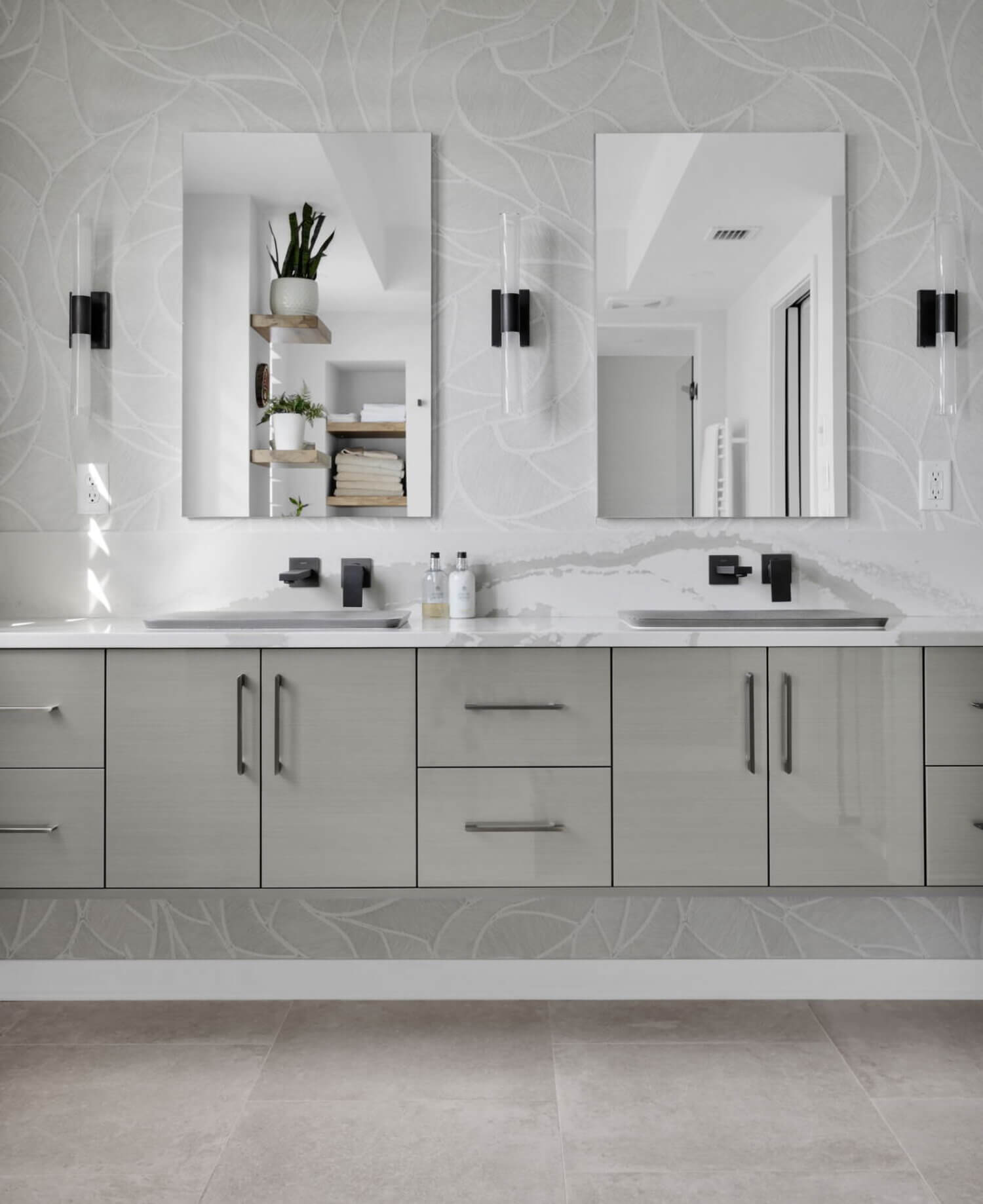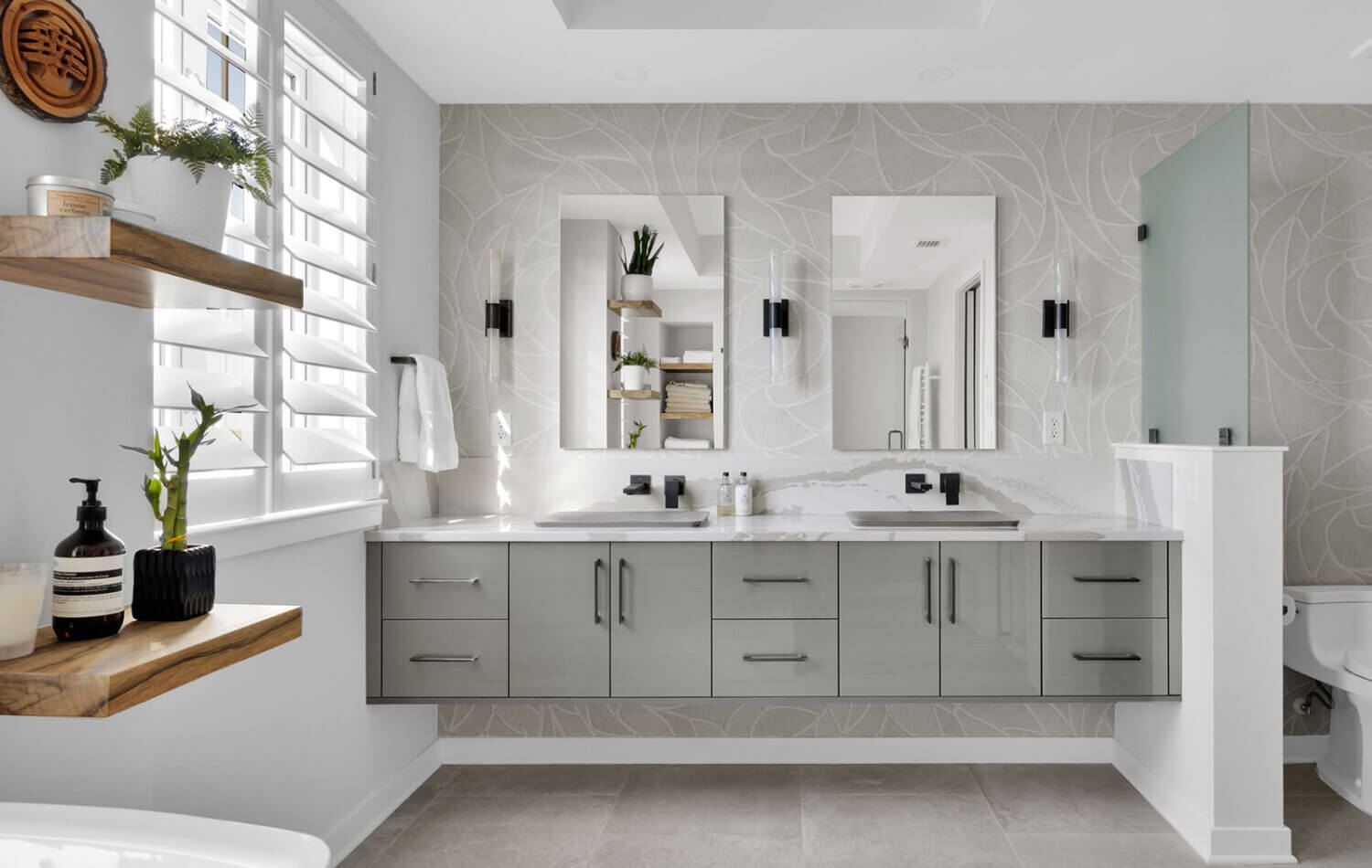 Step into luxury! This modern master bathroom retreat features sleek, glossy floating vanity cabinets that take relaxation to the next level. The cabinets feature Dura-Supreme’s Talia Horizontal door style in the “Wired Mercury” Wired Gloss Foil with the optional matching finished edgeband.