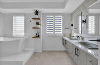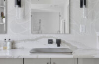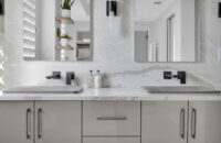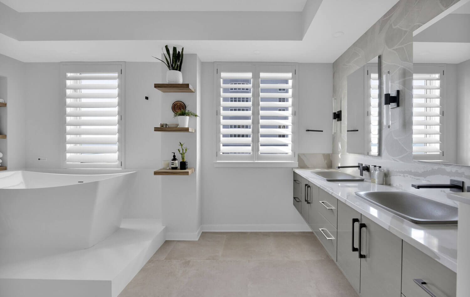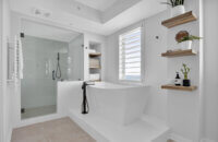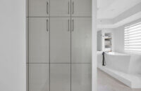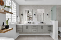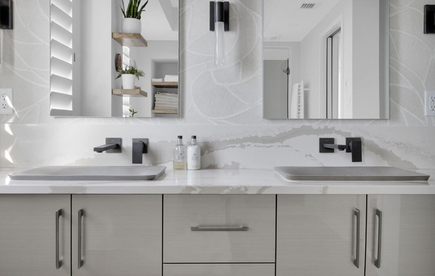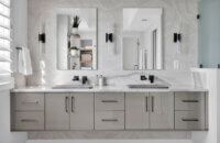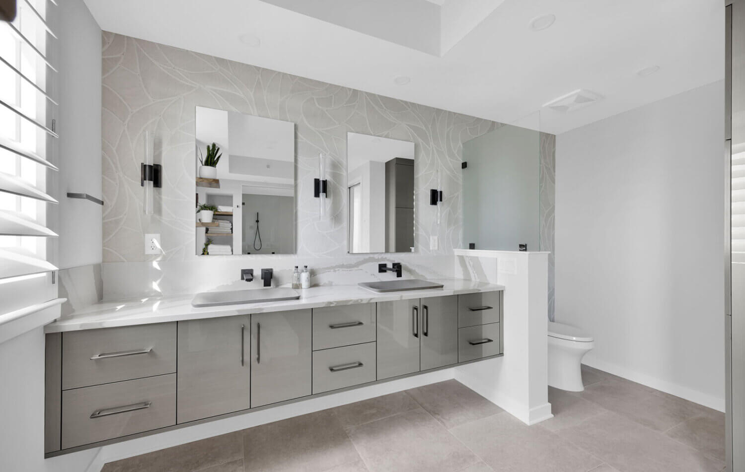Step into luxury! This modern master bathroom retreat features sleek, glossy floating vanity cabinets that take relaxation to the next level. The cabinets feature Dura-Supreme’s Talia Horizontal door style in the “Wired Mercury” Wired Gloss Foil with the optional matching finished edgeband.