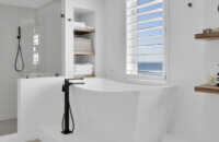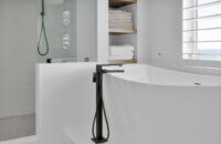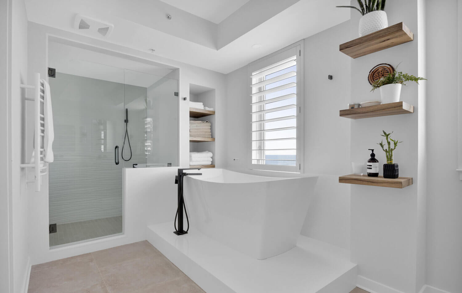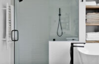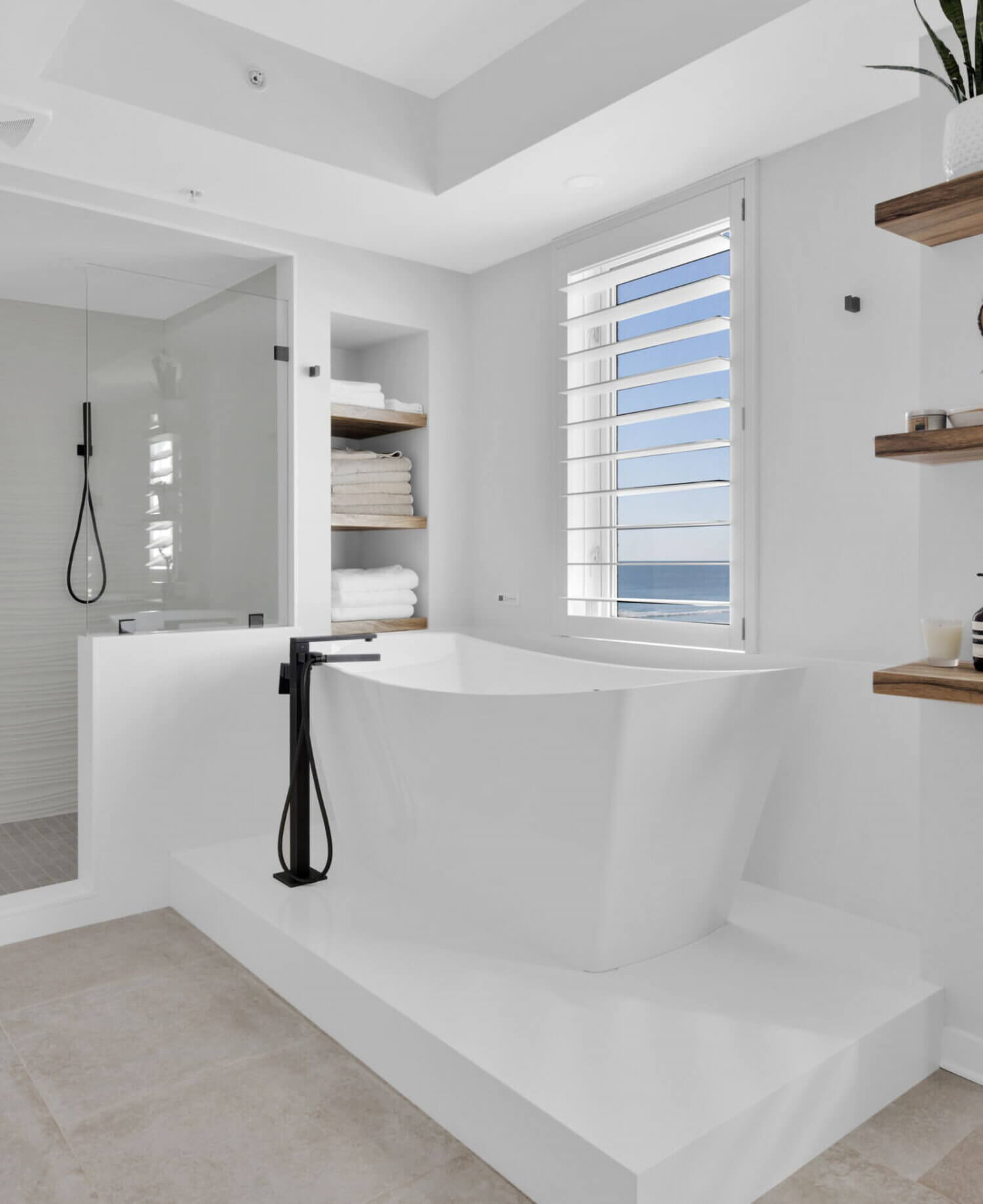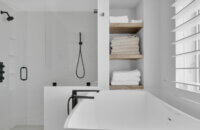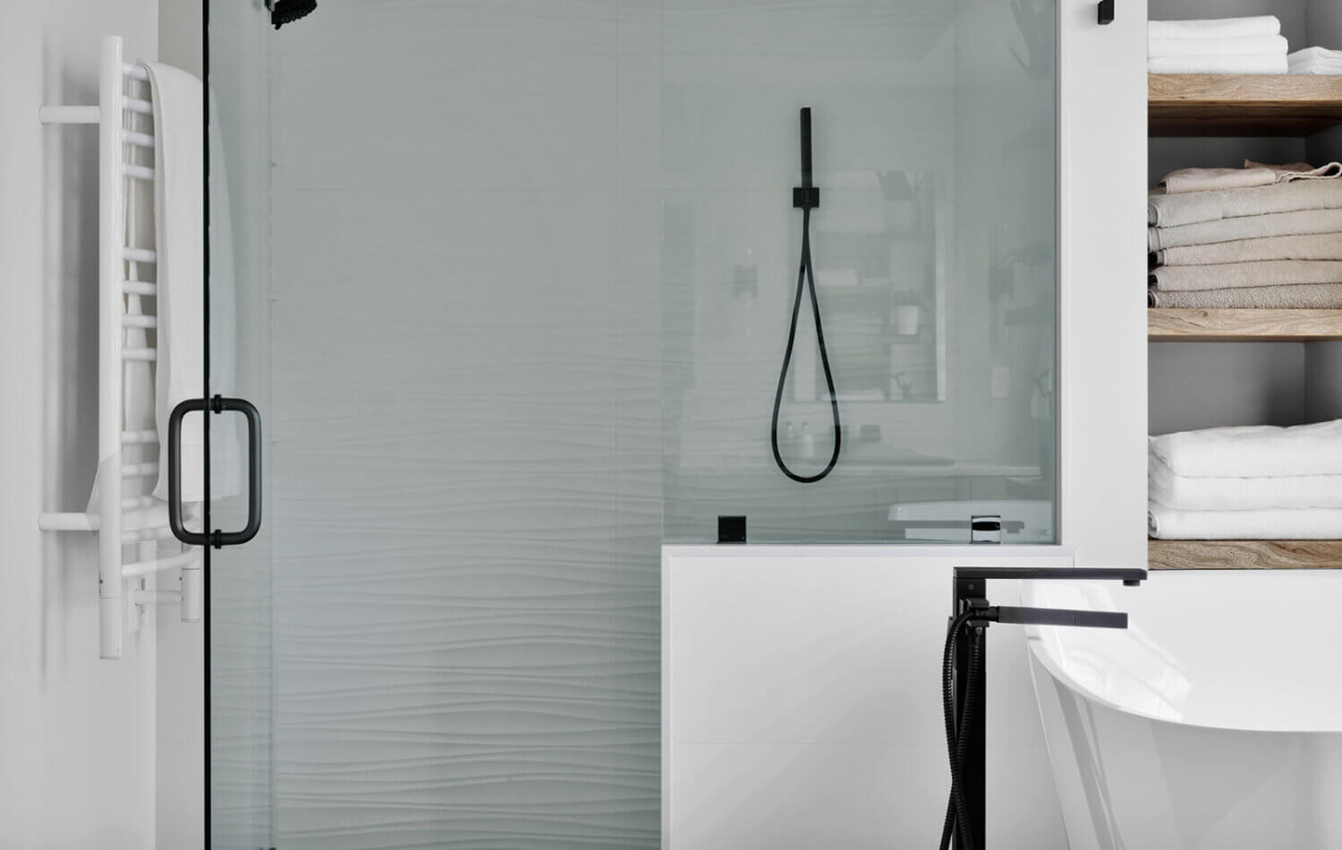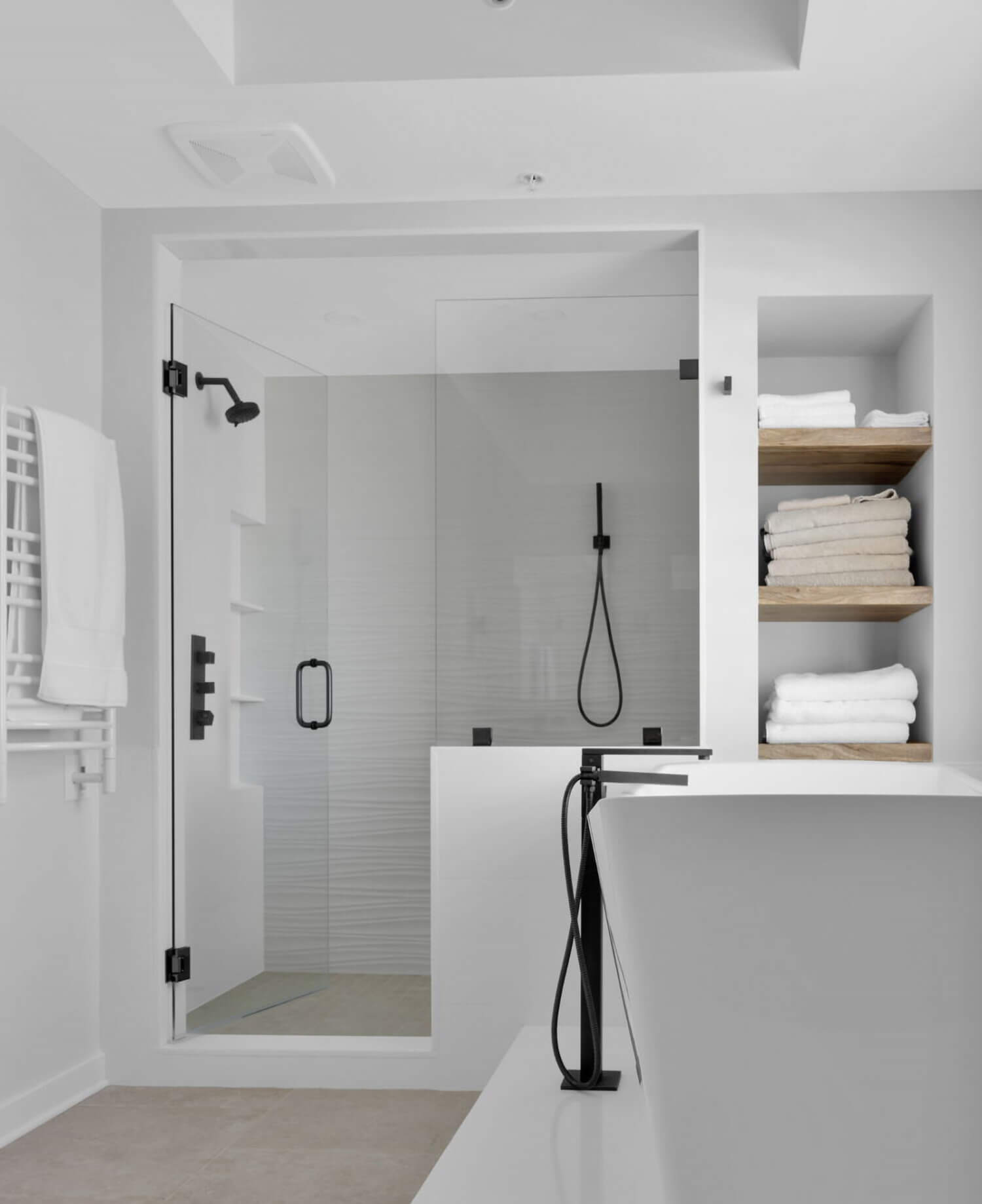 Step into luxury! This modern master bathroom retreat features sleek, glossy floating vanity cabinets that take relaxation to the next level. The cabinets feature Dura-Supreme’s Talia Horizontal door style in the “Wired Mercury” Wired Gloss Foil with the optional matching finished edgeband.