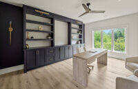 This stunning, modern home office features Dura Supreme’s Hudson door style in “Cyberspace” paint. The wall of cabinetry provides plenty of storage and a beautiful backdrop for the frequent virtual meetings when working from home.