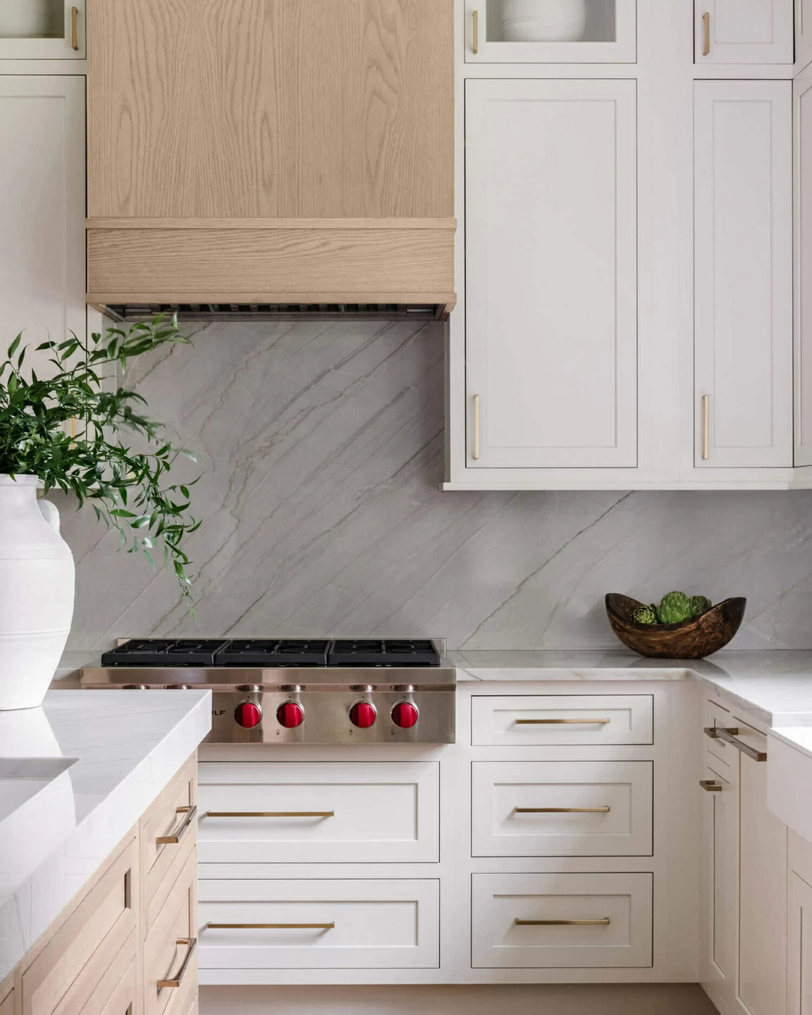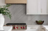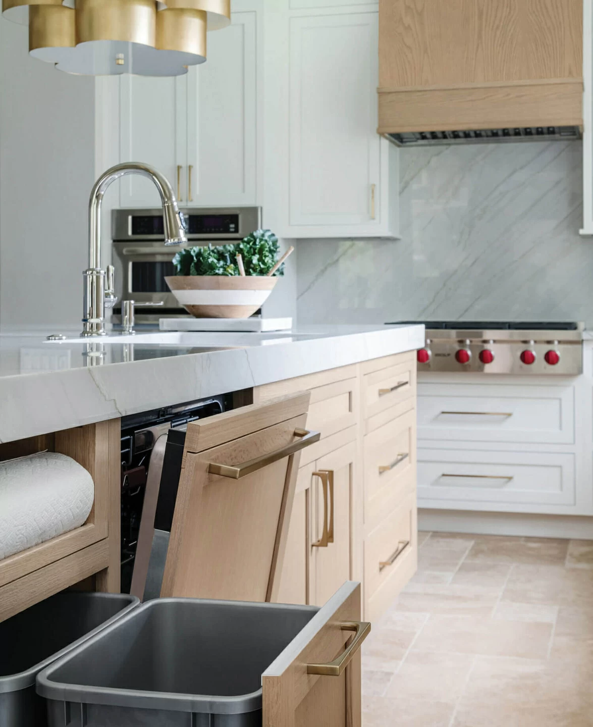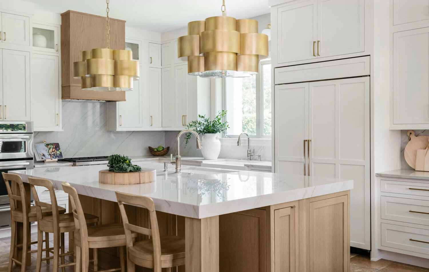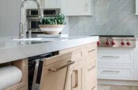 This modern kitchen has a classic, timeless style with glamorous gold fixtures and traditional American inset cabinets. This amazing design features Dura Supreme’s Hudson Inset door style in “Dove” paint with the wood hood and kitchen island accented in the “Coriander” stain on Quarter-Sawn White Oak.