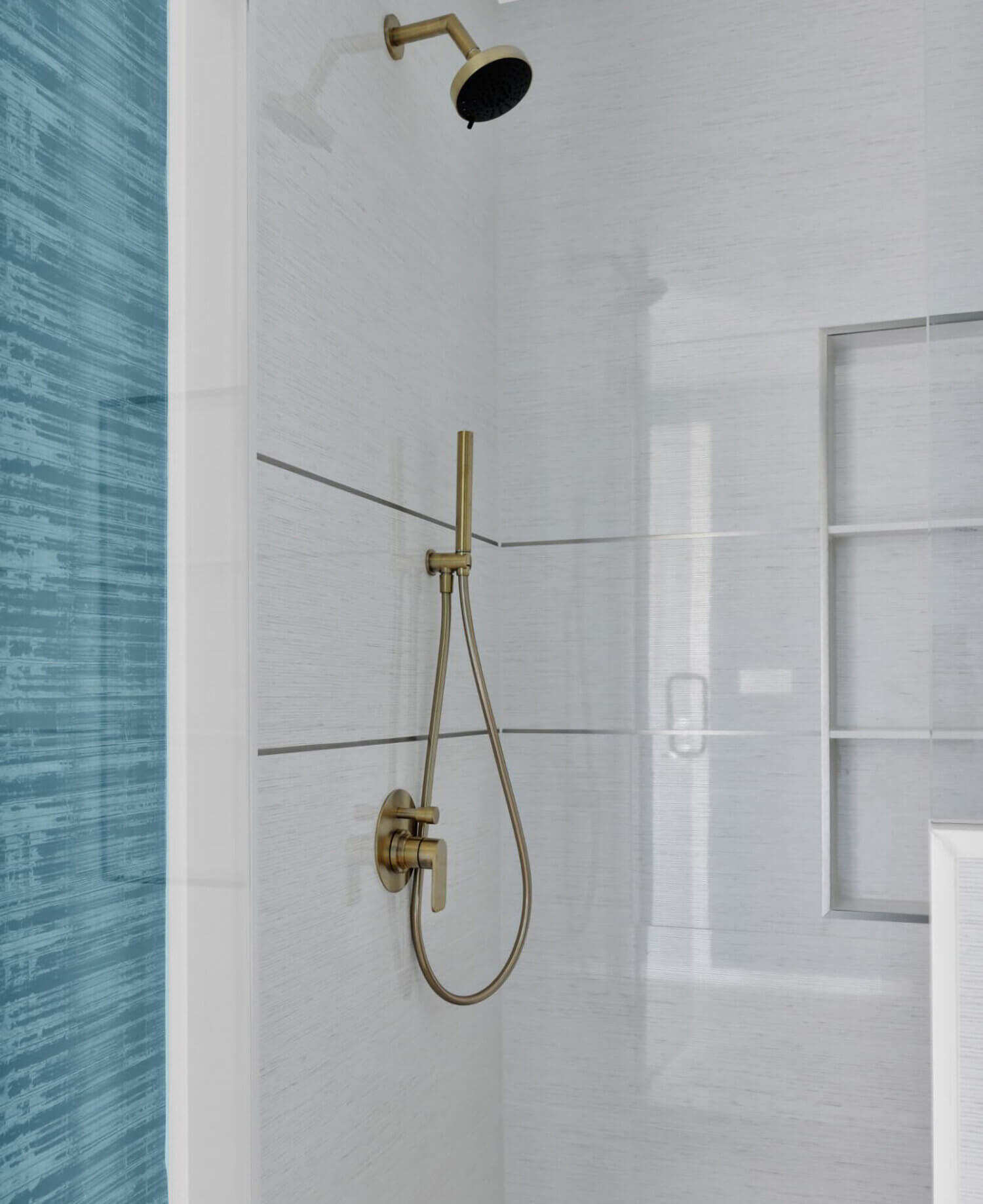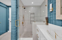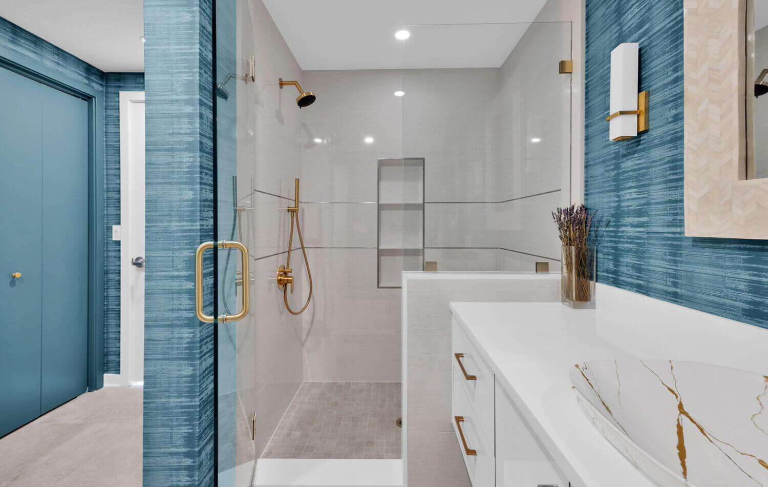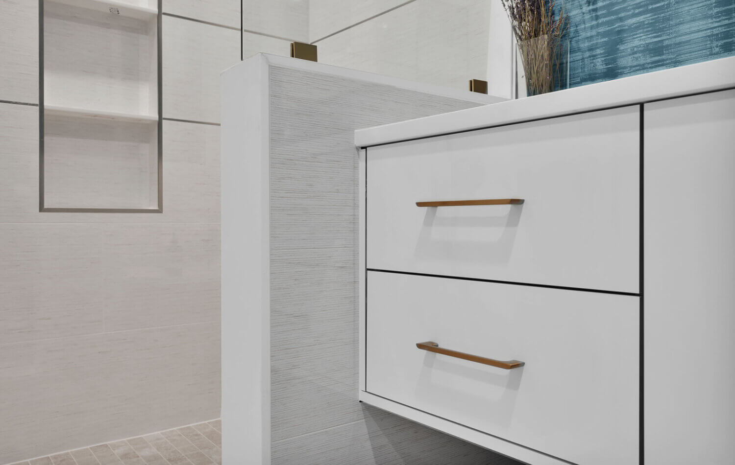 This bathroom remodel by Kitchen Design Gallery is perfect for homeowners seeking a modern, spa-like bathroom experience. The combination of clean lines, ocean-inspired hues, luxurious materials, and thoughtful design elements creates a truly inspiring space. The floating vanity design adds a touch of elegance, making the space feel more spacious and luxurious. This design uses Dura Supreme’s Allura door style in the “White Gloss” High Gloss Acrylic with the optional Aluminum finished Edgeband.