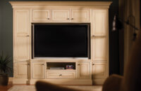 The entertainment center shown here is just one example of the many different looks that can be created with Dura Supreme’s entertainment cabinetry. Featuring the Chapel Hill Classic Inset door style with a beaded frame with a custom off-white paint/glaze finish.