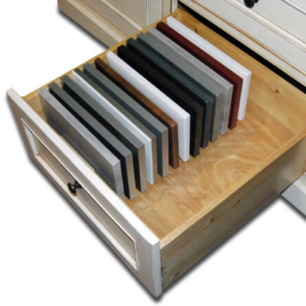 Deep Drawer Sample Organizer (SMPL-DDSORG) for Sample Drawer Fronts. Holds up to 13 drawer front samples. Dimensions: 19-3/4″ wide x 5-1/2″ deep x 3-1/2″ tall.
