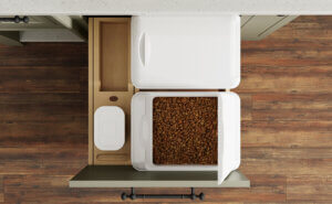 Our Pet Food Pull-Out features (2) 35 quart, BPA-free polymer containers with lids that can easily hold all sorts of items like pet food and cat litter, making it a purr-fect pet center for toys, treats, and other accessories.