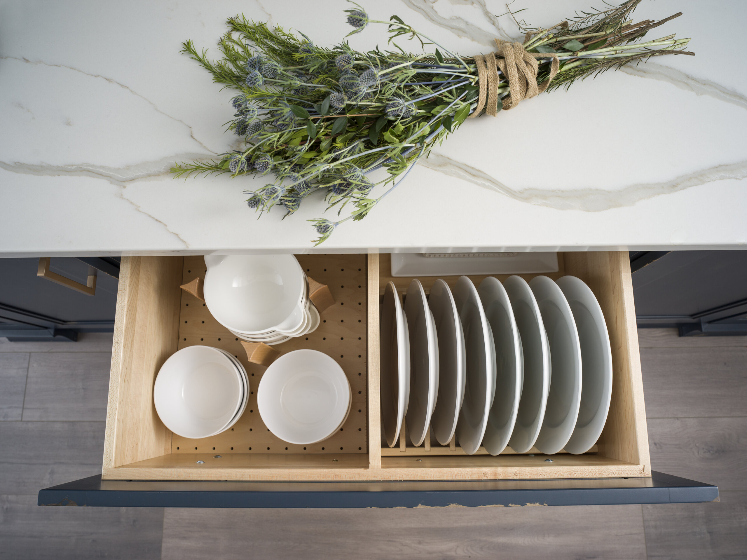 Dura Supreme’s Plate Rack combined with the Dish Storage Drawer creates a convenient spot to neatly store and organize an entire set of dishware. Storing your dishware collection below the countertop creates a more accessible option for all family members.