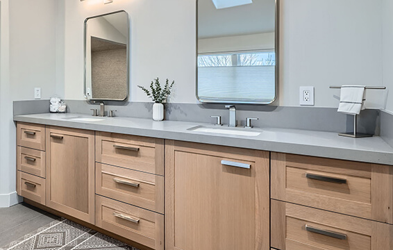 We are very happy with our master bathroom vanity! We bought a home, and everything was about 20 years old. The master bath vanity was a long wall, so we had the opportunity to build “his” row and “her” row of drawers and a middle set of drawers. We chose the Parker door in Quarter-Sawn Oak with Coriander stain. It’s a gorgeous “in” look and is sturdy in construction.