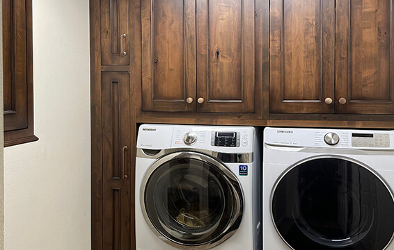 I love my cabinets!! This gave me much-needed storage in my flex room! The way my cabinets were packaged was much appreciated because they were easy to open up. I chose hickory/morel stain and graphite floating shelves. These cabinets are made very well, and I love all the furniture finishes and details that come standard with these cabinets. If you’re on the fence about which cabinet maker to go with, you will not be sorry if you choose Dura Supreme.