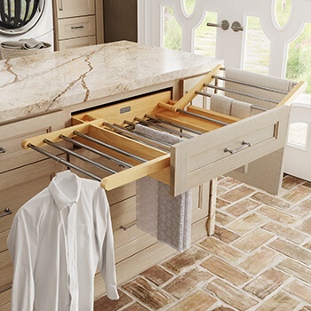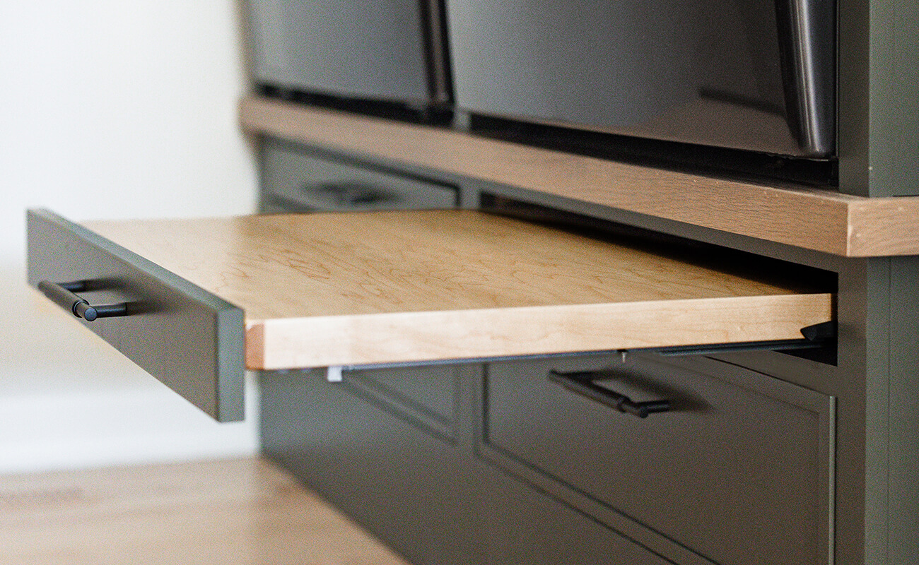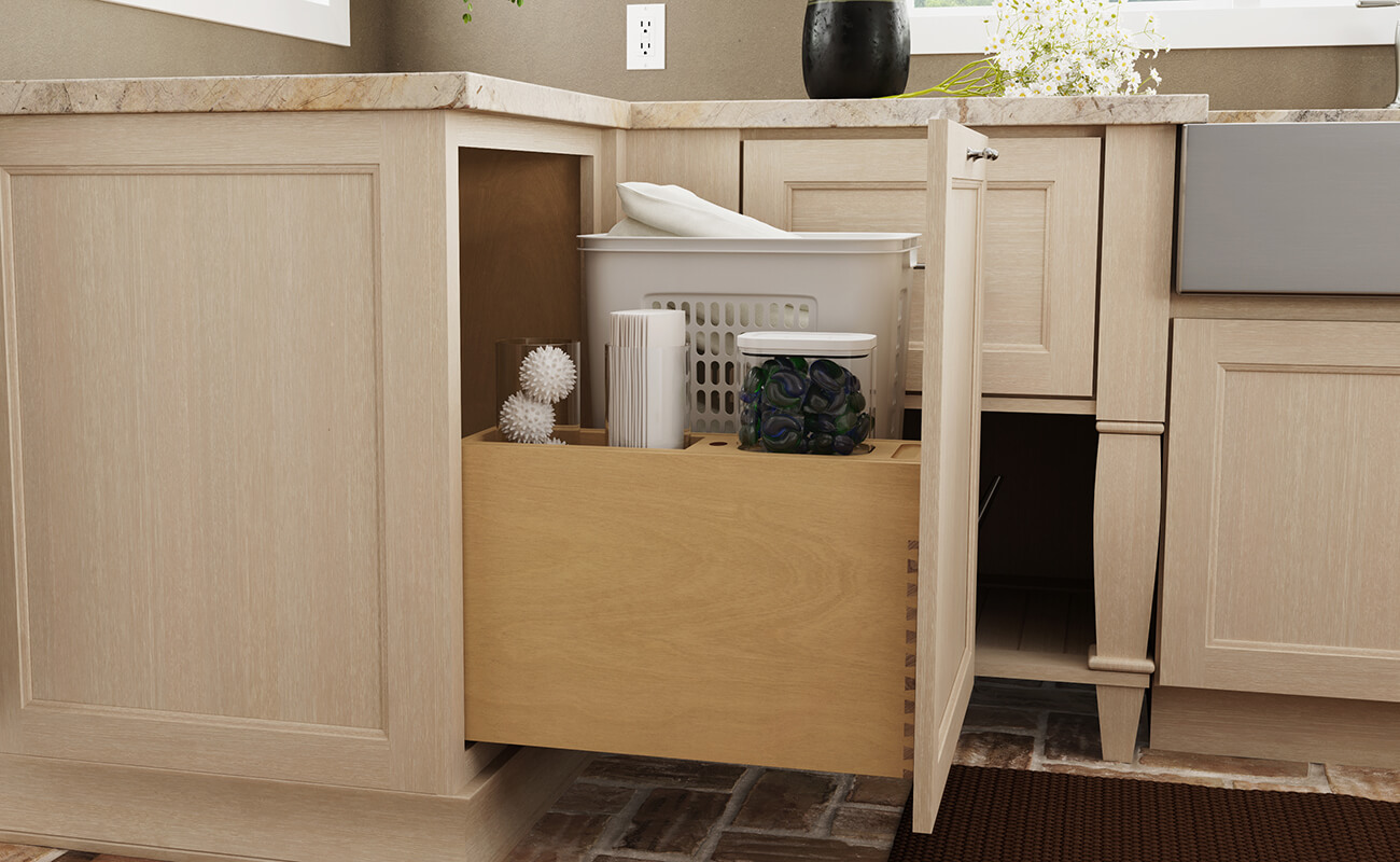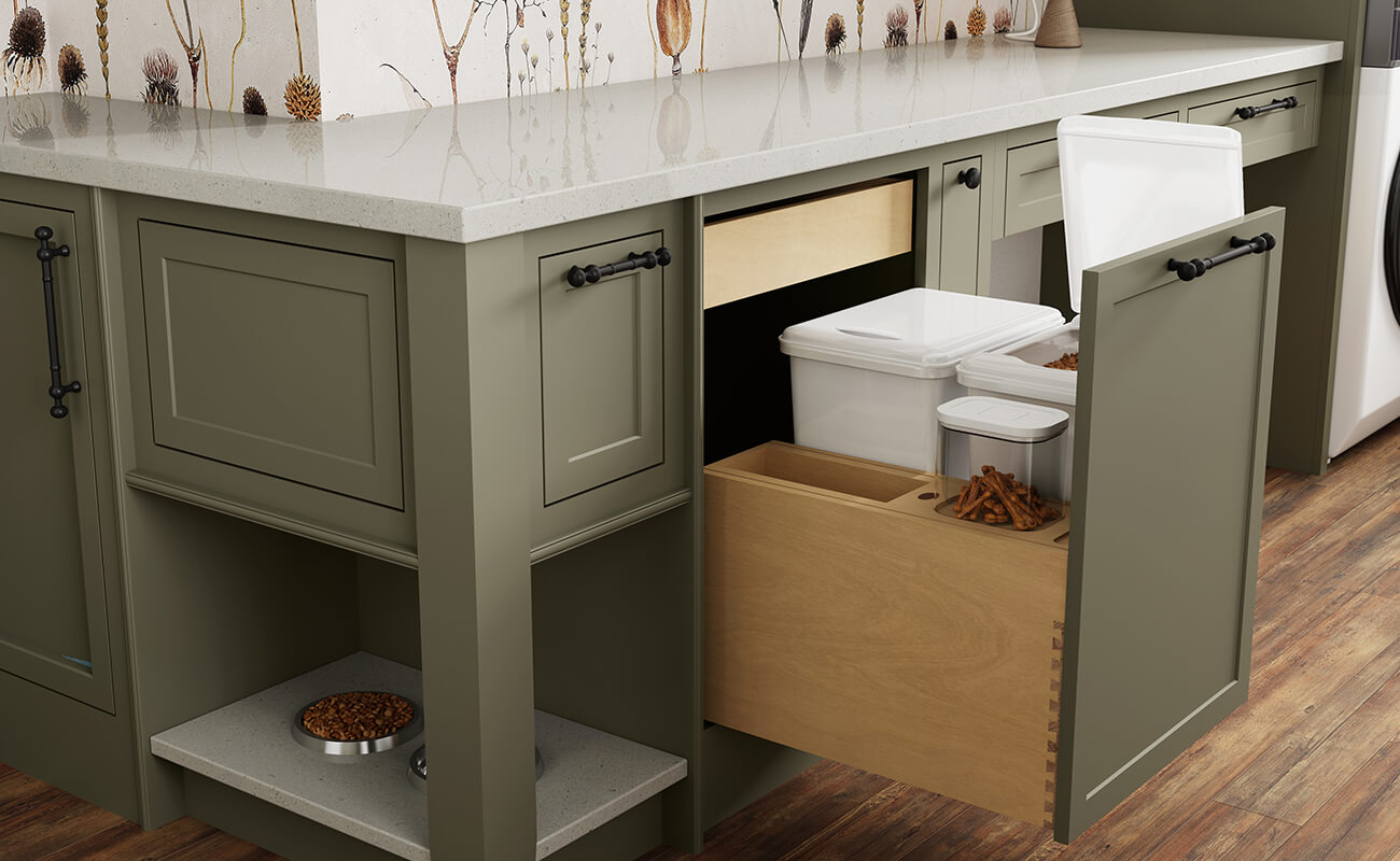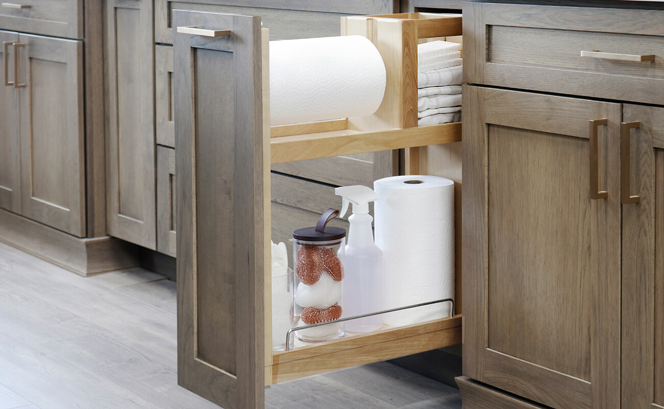 Check out the Larder Cabinetry Program from Dura Supreme. These highly functional cabinets are designed and customized with different internal storage features to keep countertop clutter and small appliances behind beautiful cabinet doors.