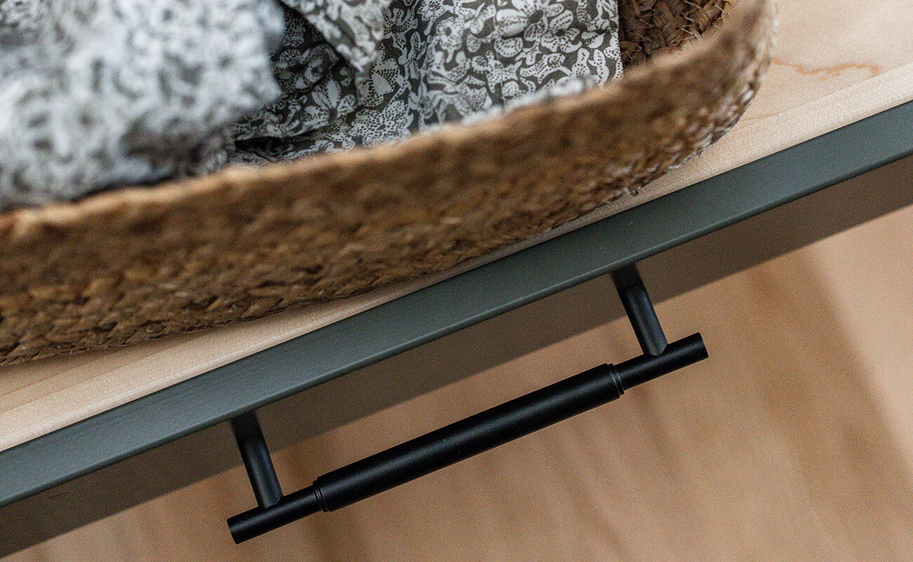 A close up of a gray vanity with reeded details on the doors.